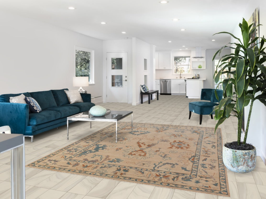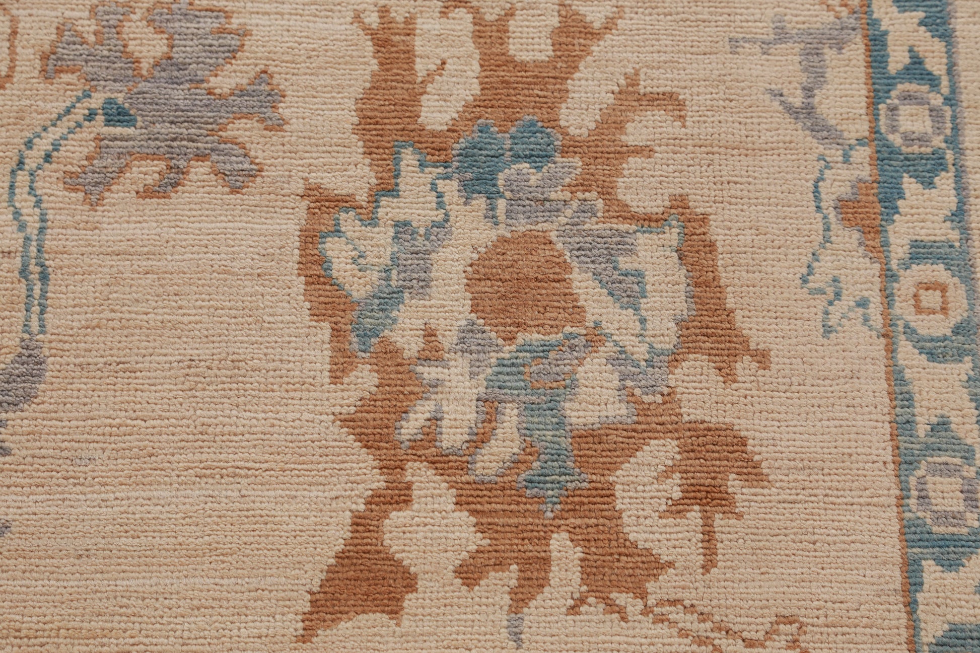 A Beautiful Genuine Turkey Oushak rug is Hand Knotted by skillful weavers in Turkey with 100% Wool Material. This rug is in New, First Quality condition. dimensions are 8' 5'' X 6' 6'' in foot and 257 X 198 in centimeter. the primary color is Beige & Ivories.