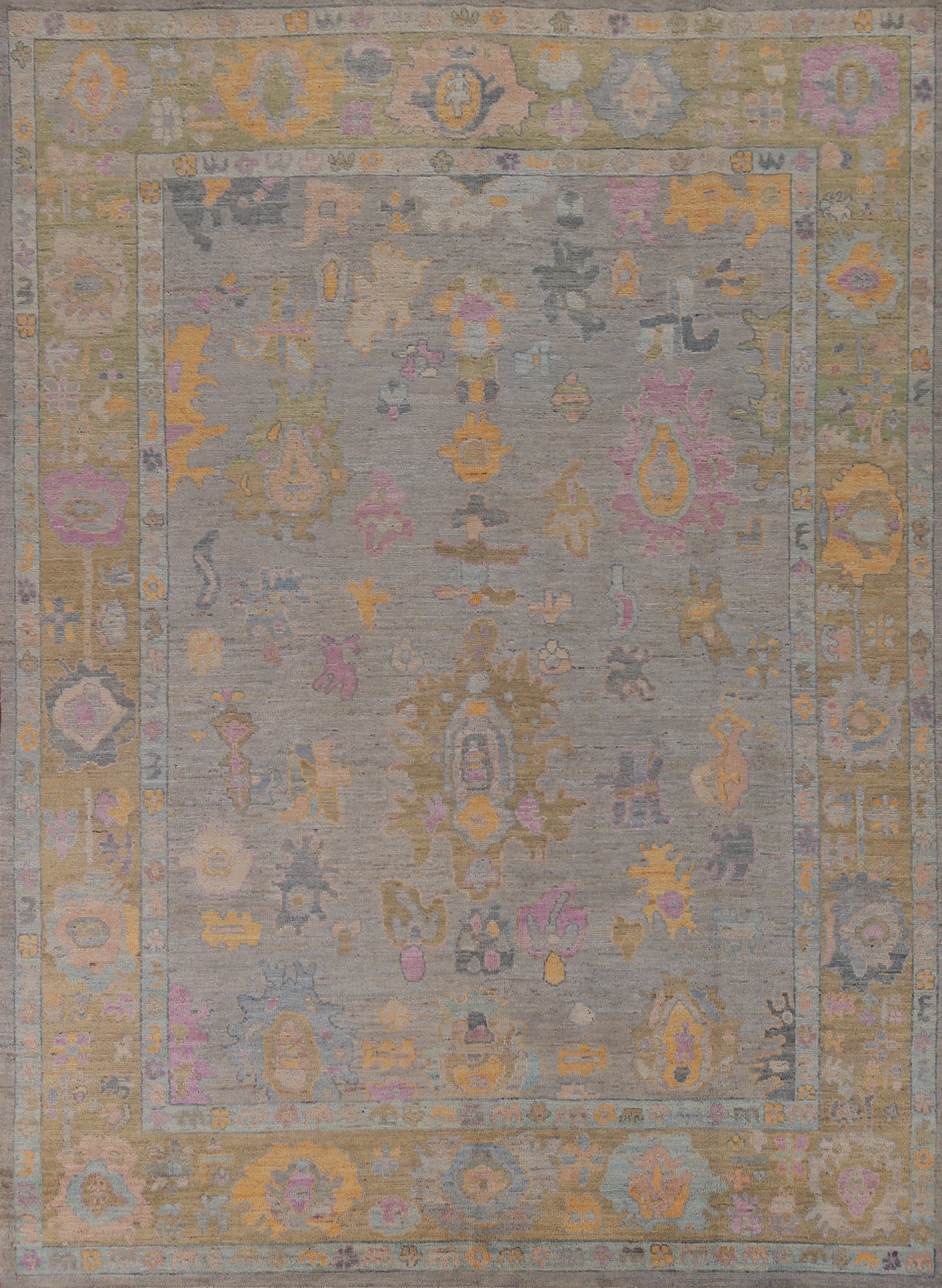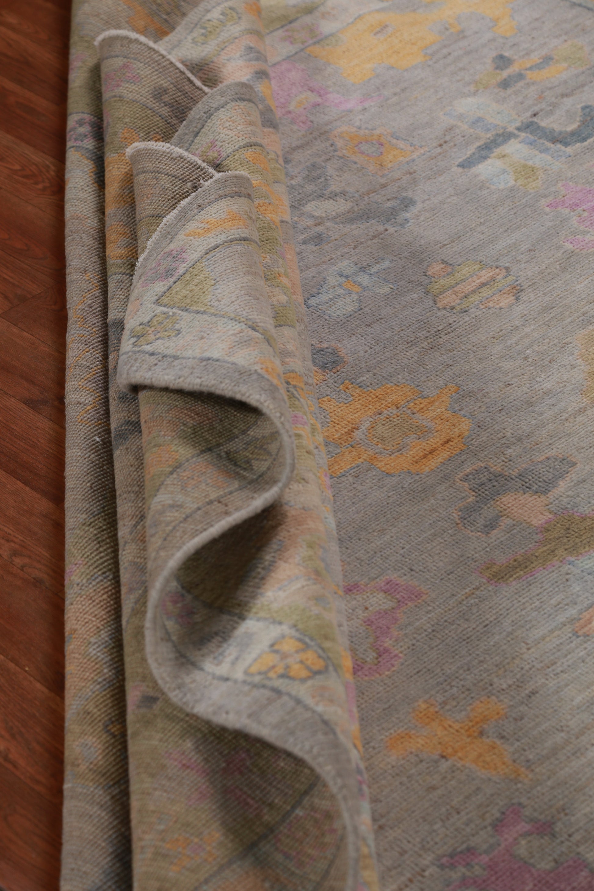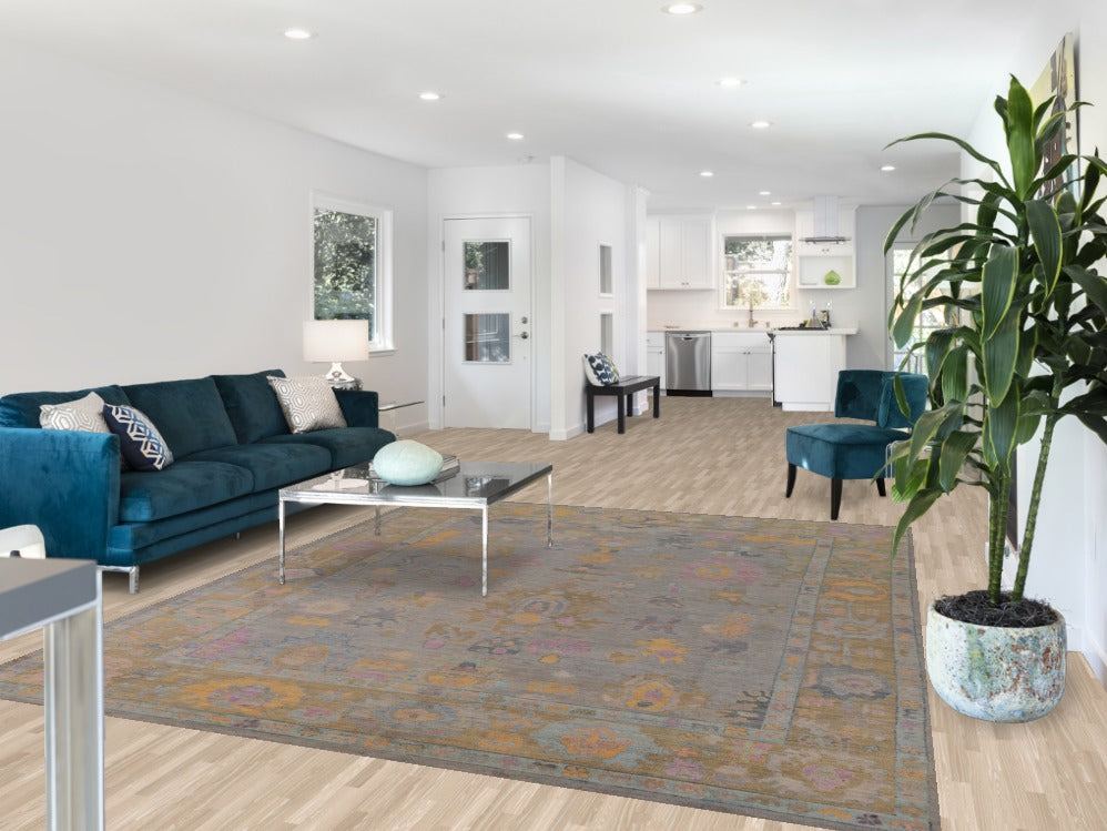 A Beautiful Genuine Turkey Oushak rug is Hand Knotted by skillful weavers in Turkey with 100% Wool Material. This rug is in New, First Quality condition. dimensions are 9' 3'' X 7' 9'' in foot and 282 X 236 in centimeter. the primary color is Greys & Charcoal.