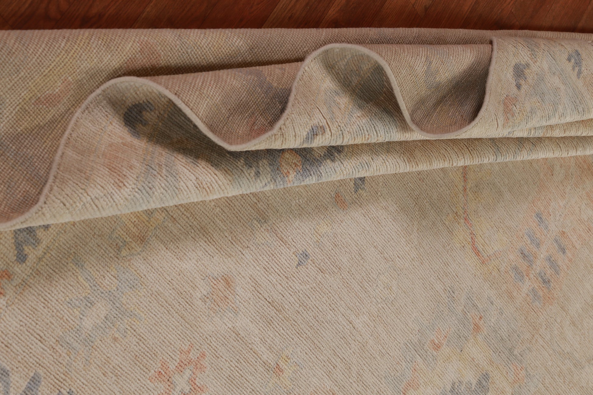 A Beautiful Genuine Turkey Oushak rug is Hand Knotted by skillful weavers in Turkey with 100% Wool Material. This rug is in New, First Quality condition. dimensions are 12' 7'' X 8' 11'' in foot and 384 X 272 in centimeter. the primary color is Beige & Ivories.
