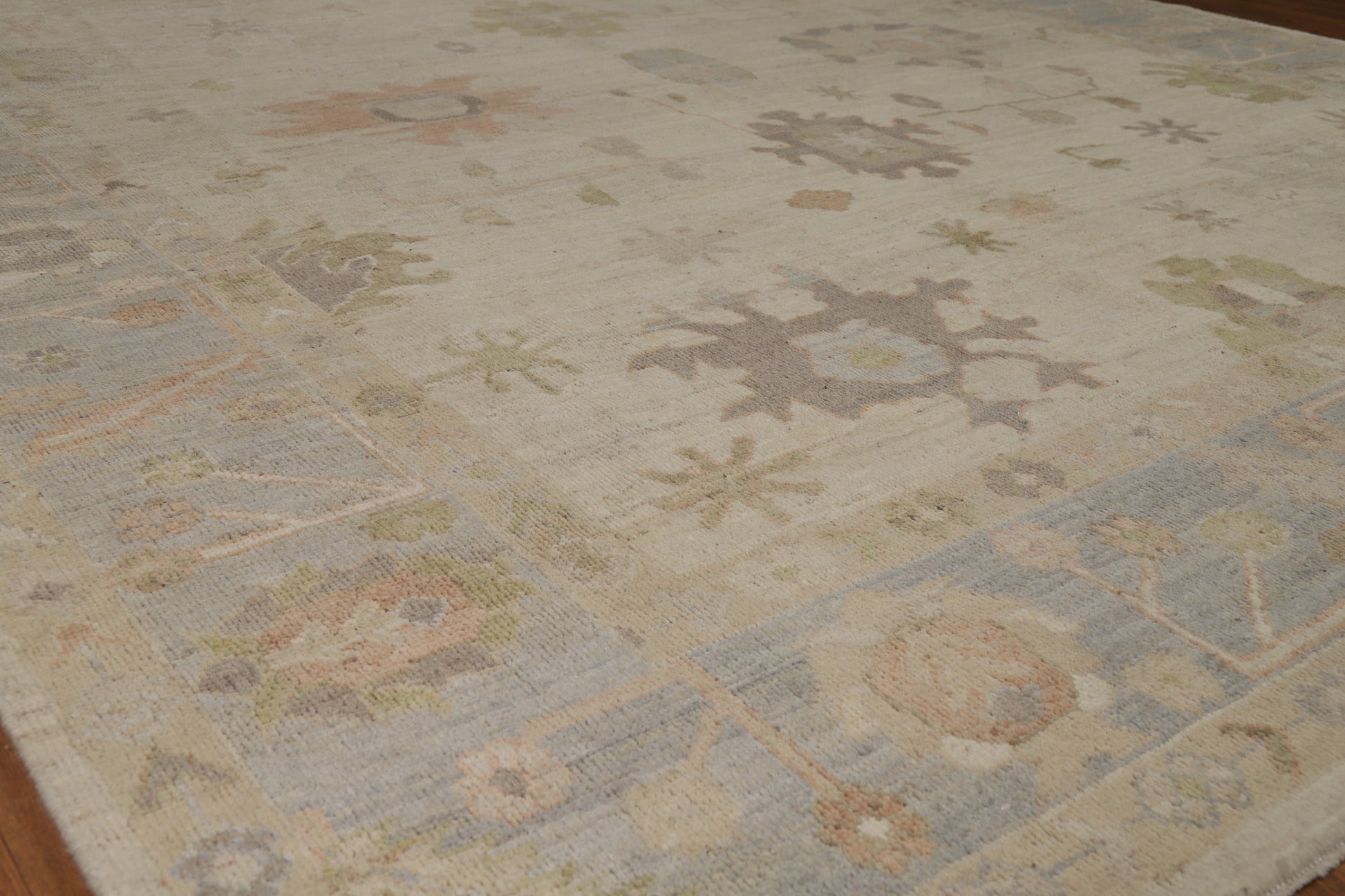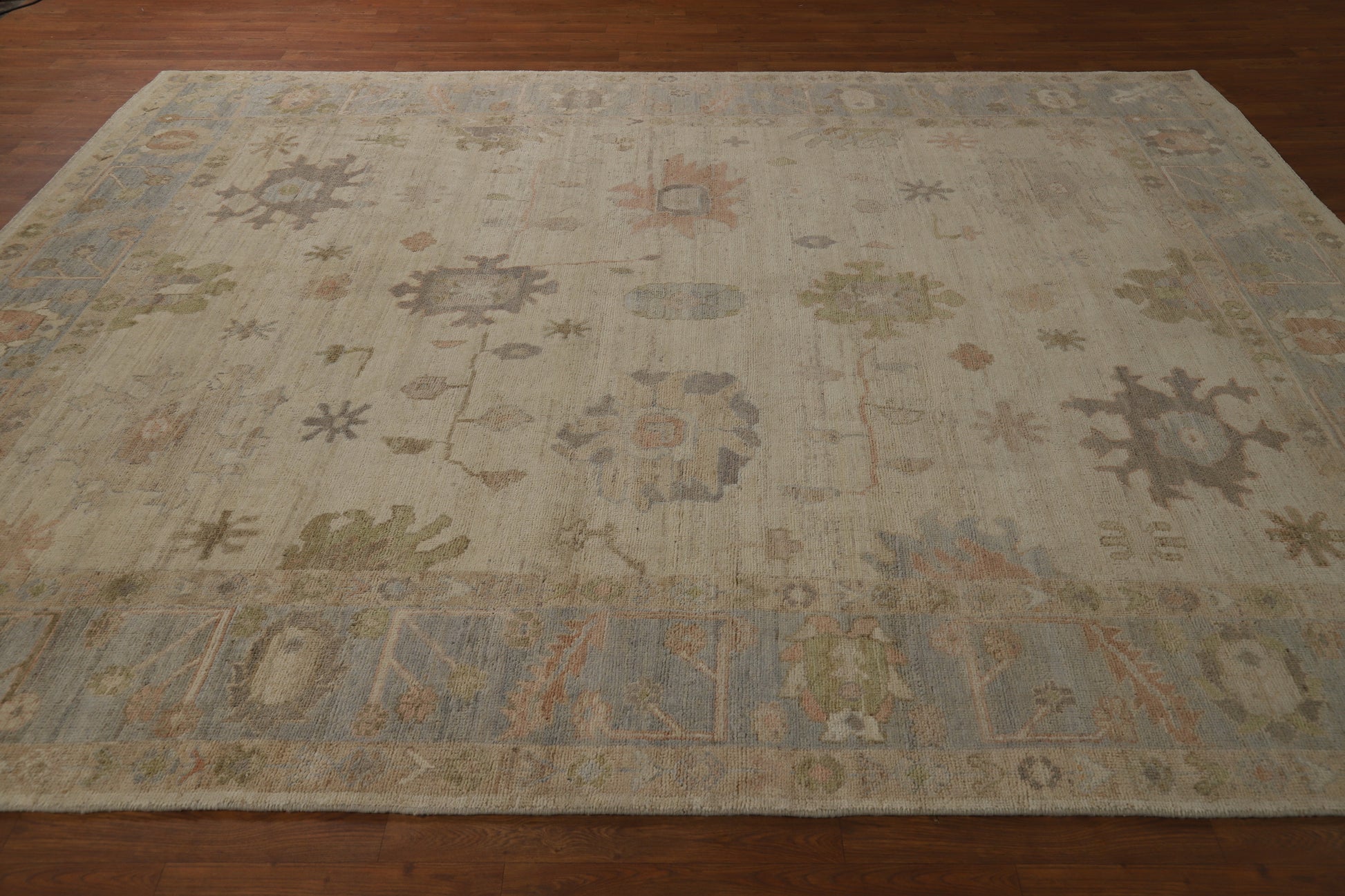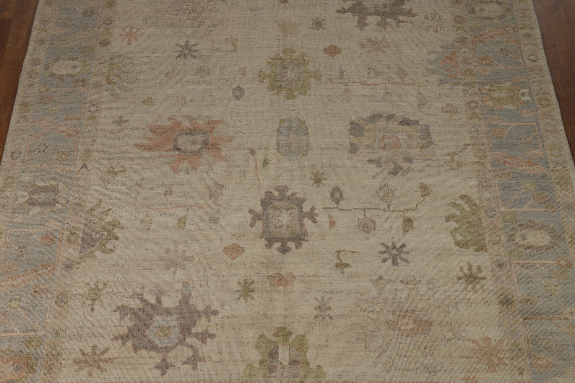 A Beautiful Genuine Turkey Oushak rug is Hand Knotted by skillful weavers in Turkey with 100% Wool Material. This rug is in New, First Quality condition. dimensions are 9' 9'' X 8' 2'' in foot and 297 X 249 in centimeter. the primary color is Beige & Ivories.