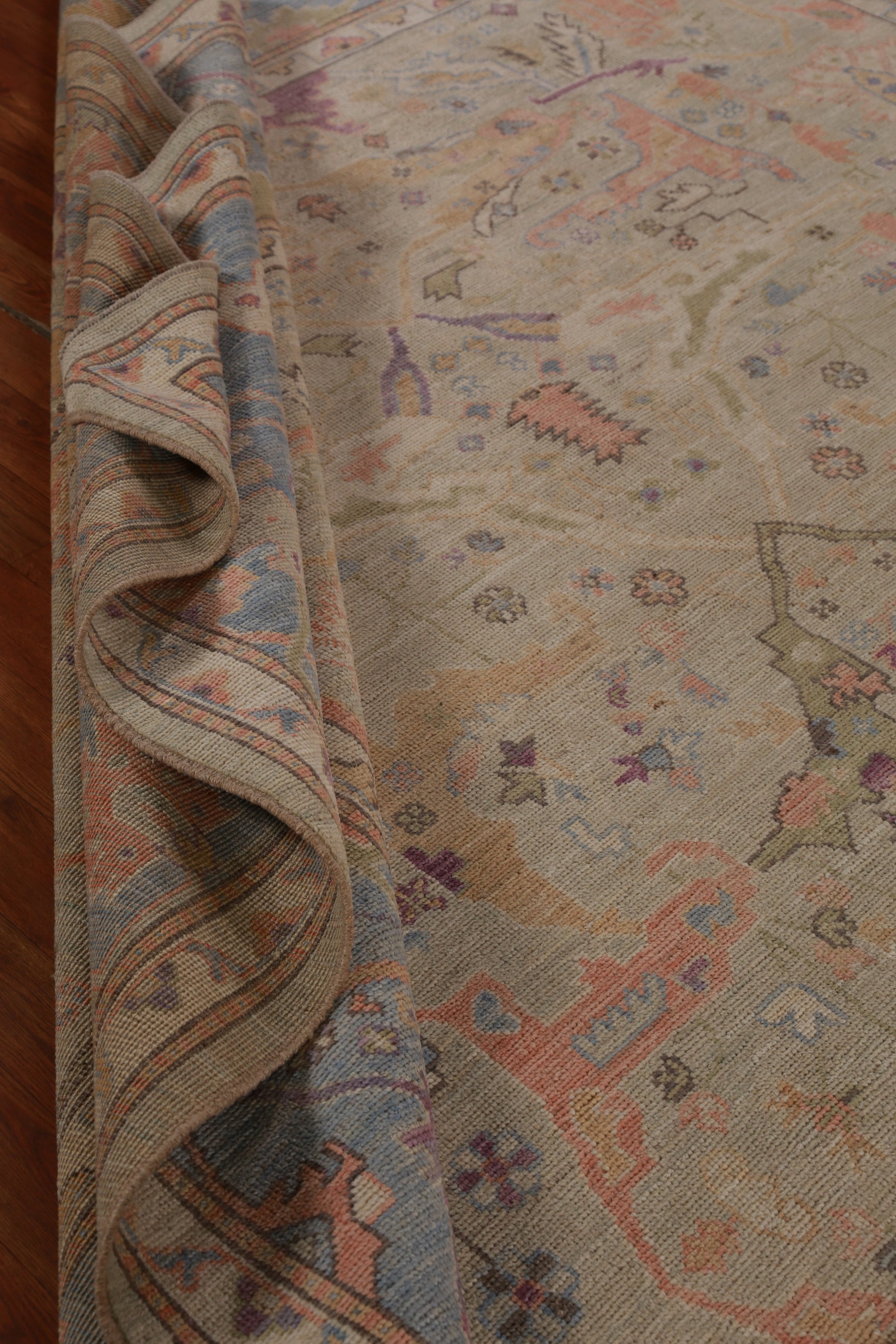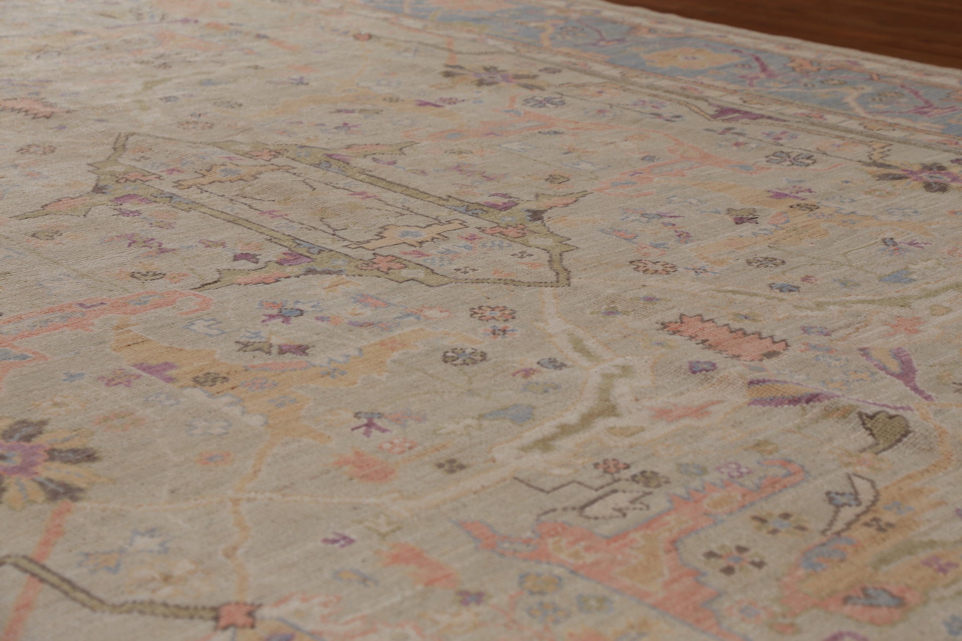 A Beautiful Genuine Turkey Oushak rug is Hand Knotted by skillful weavers in Turkey with 100% Wool Material. This rug is in New, First Quality condition. dimensions are 11' 9'' X 9' 1'' in foot and 358 X 277 in centimeter. the primary color is Beige & Ivories.