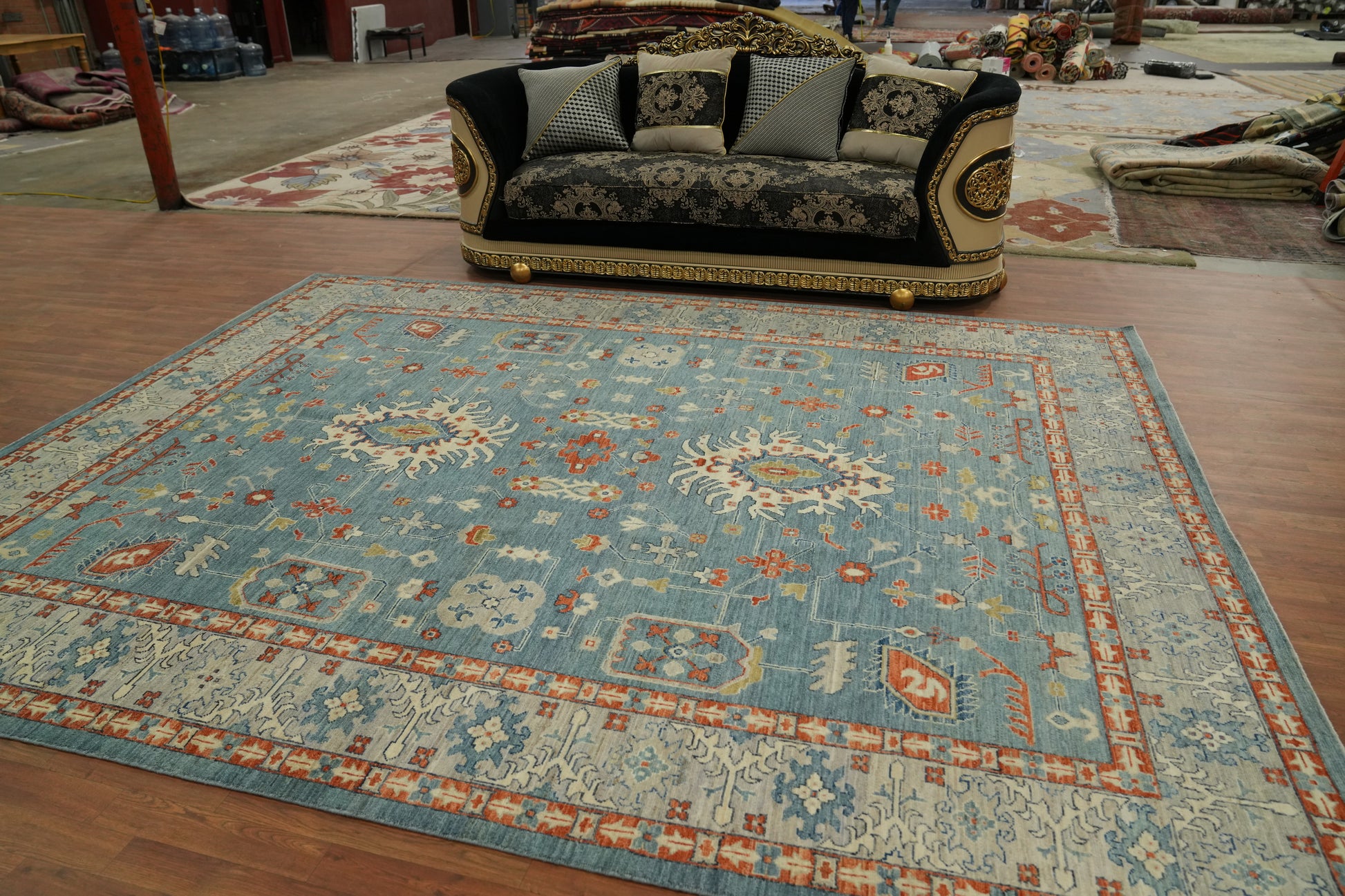 A Beautiful Genuine Turkey Oushak rug is Hand Knotted by skillful weavers in Turkey with 100% Wool Material. This rug is in New, First Quality condition. dimensions are 11' 10'' X 9' 4'' in foot and 361 X 284 in centimeter. the primary color is Navy Blue & Blues.