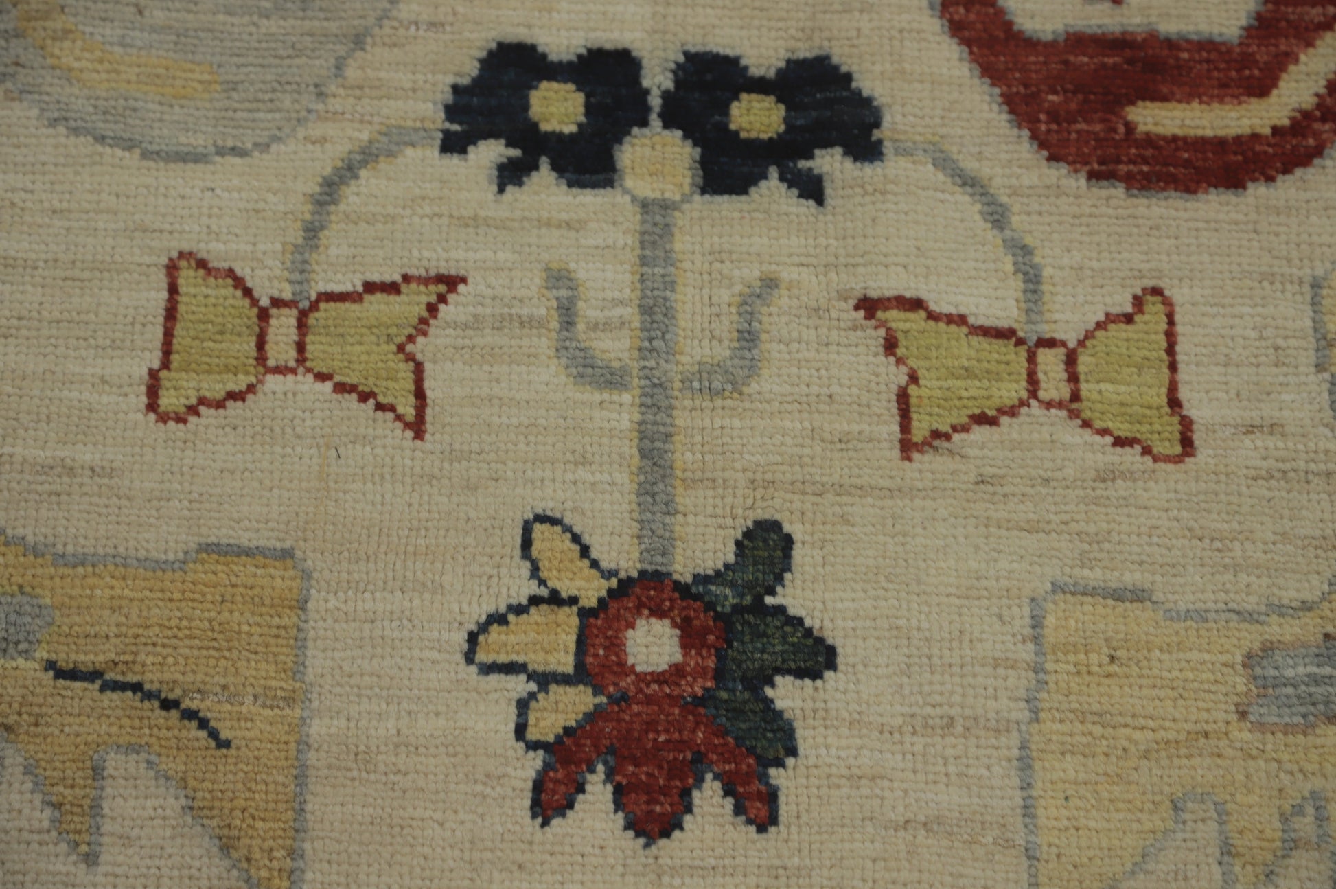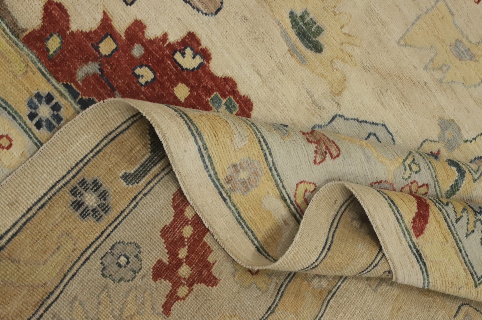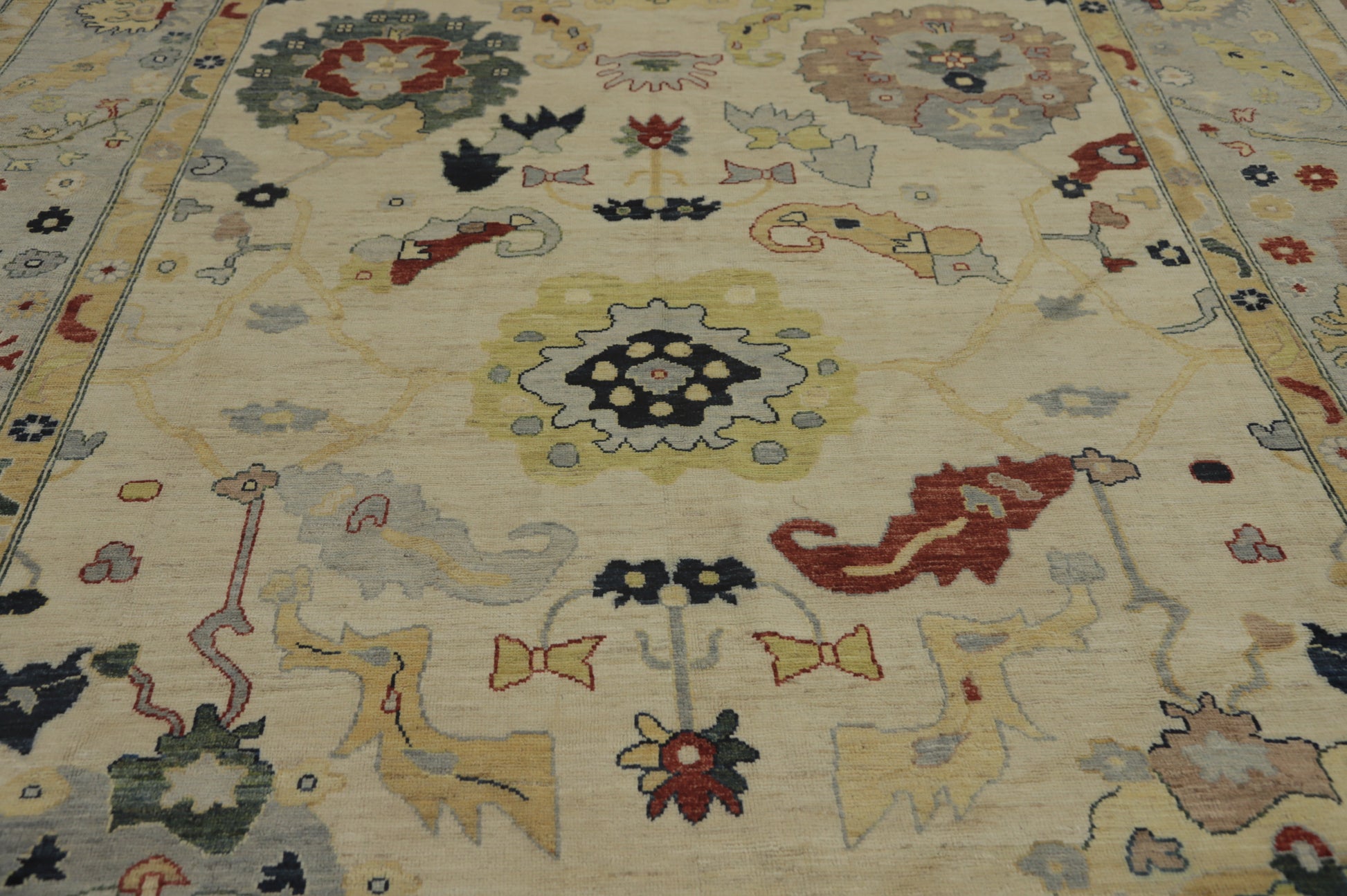 A Beautiful Genuine Turkey Oushak rug is Hand Knotted by skillful weavers in Turkey with 100% Wool Material. This rug is in New, First Quality condition. dimensions are 12' 2'' X 9' 0'' in foot and 371 X 274 in centimeter. the primary color is Beige & Ivories.
