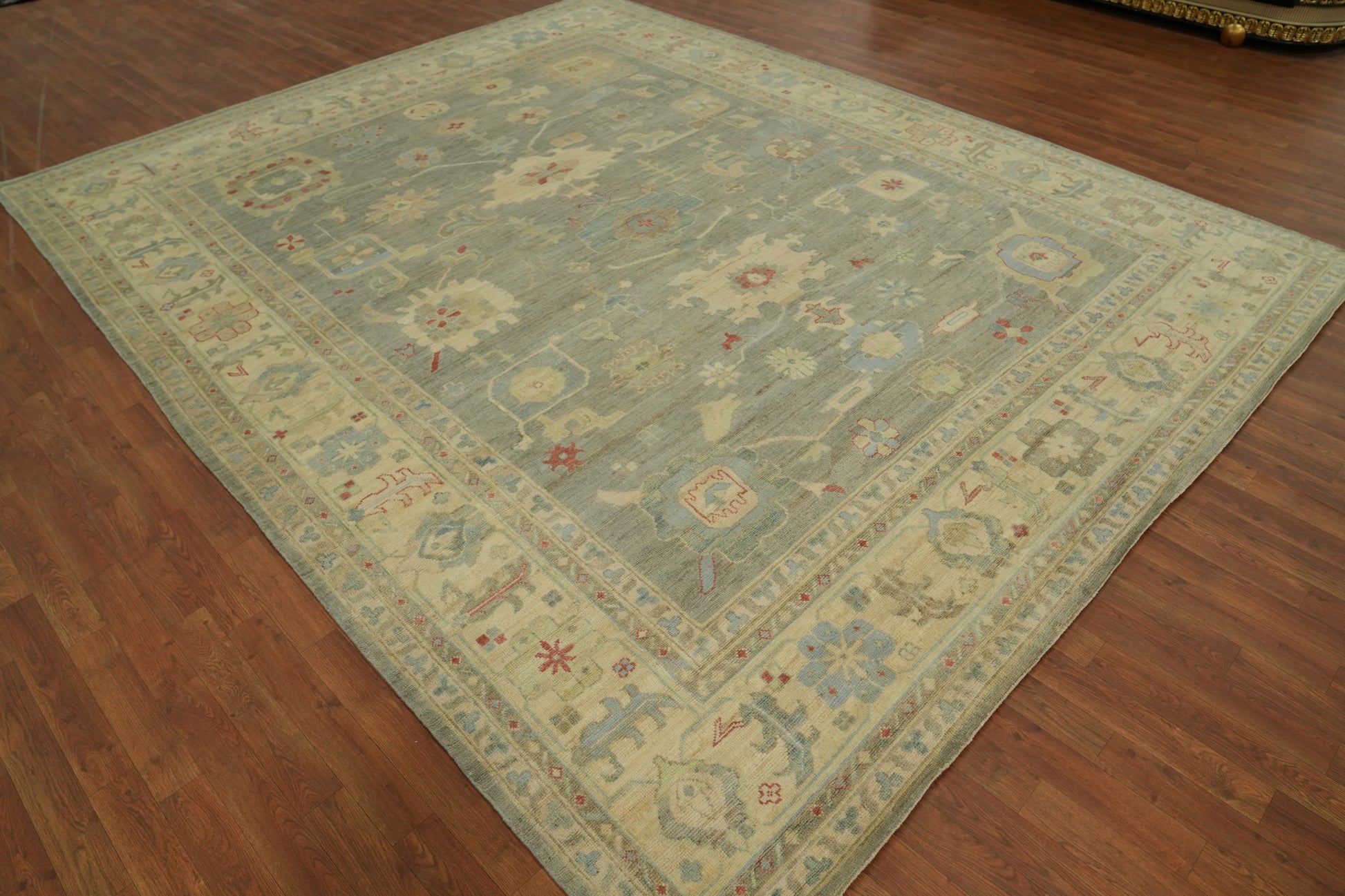 A Beautiful Genuine Turkey Oushak rug is Hand Knotted by skillful weavers in Turkey with 100% Wool Material. This rug is in New, First Quality condition. dimensions are 11' 10'' X 9' 4'' in foot and 361 X 284 in centimeter. the primary color is Greys & Charcoal.