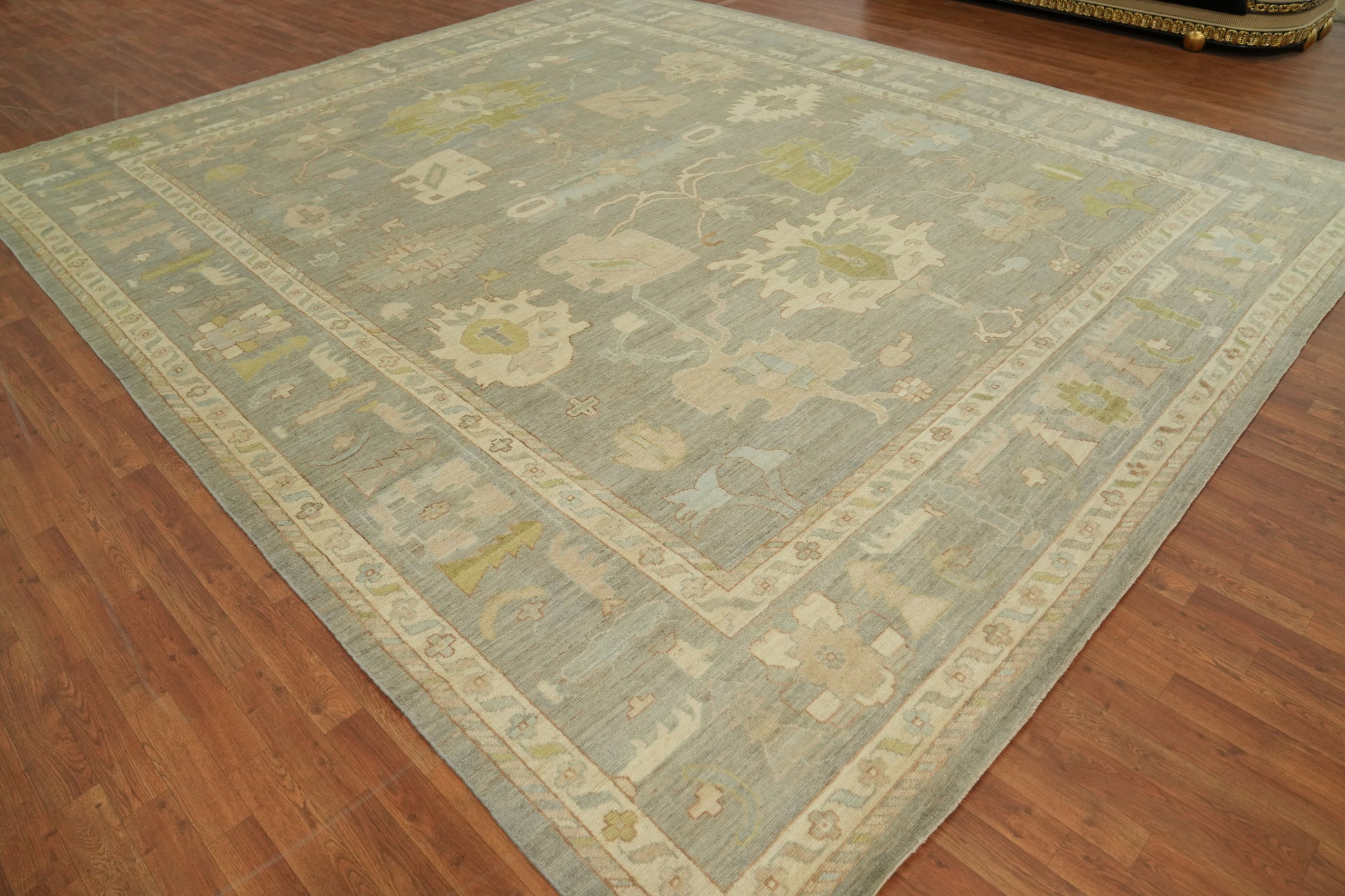 A Beautiful Genuine Turkey Oushak rug is Hand Knotted by skillful weavers in Turkey with 100% Wool Material. This rug is in New, First Quality condition. dimensions are 14' 3'' X 12' 3'' in foot and 434 X 373 in centimeter. the primary color is Greys & Charcoal.