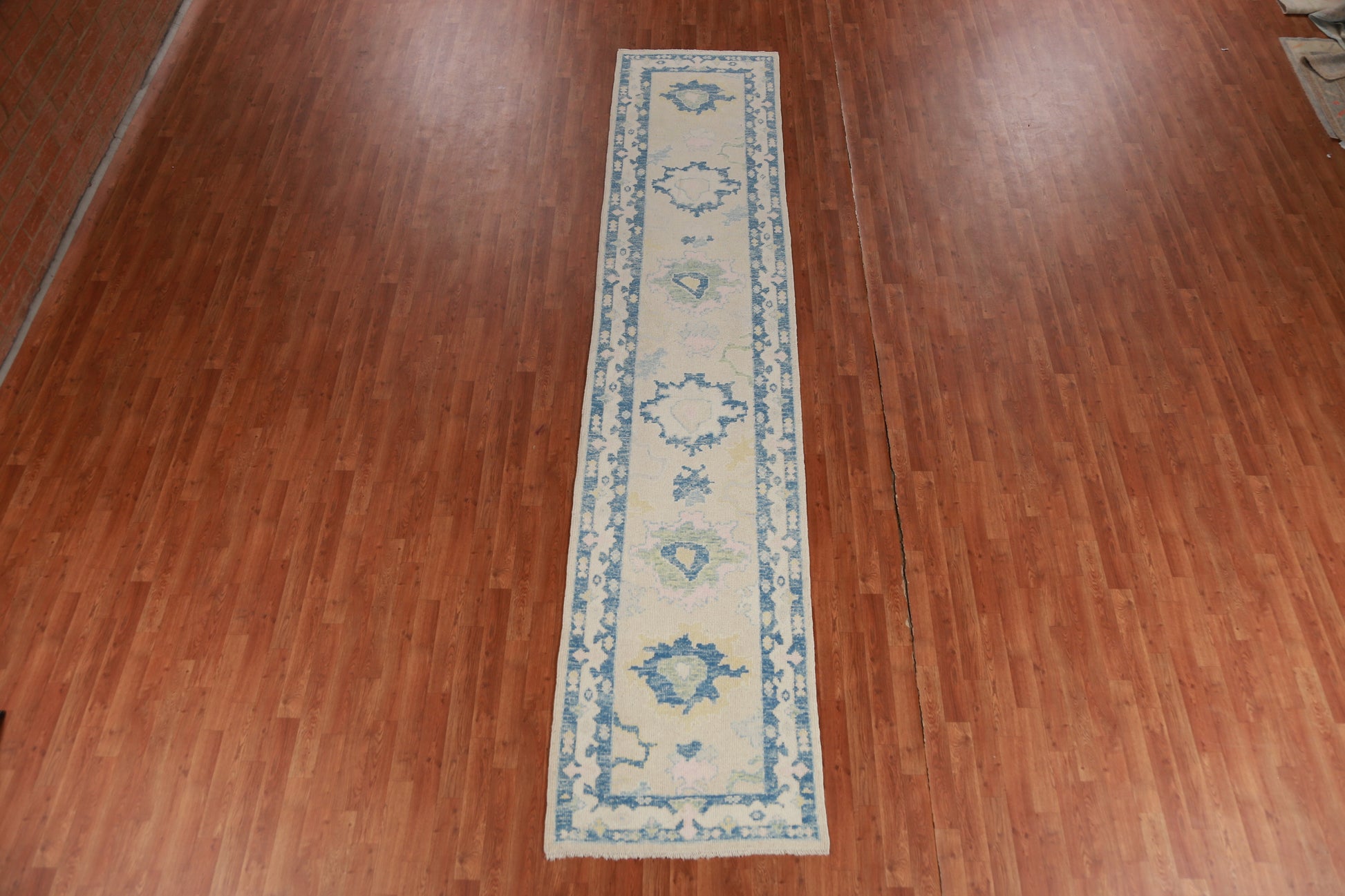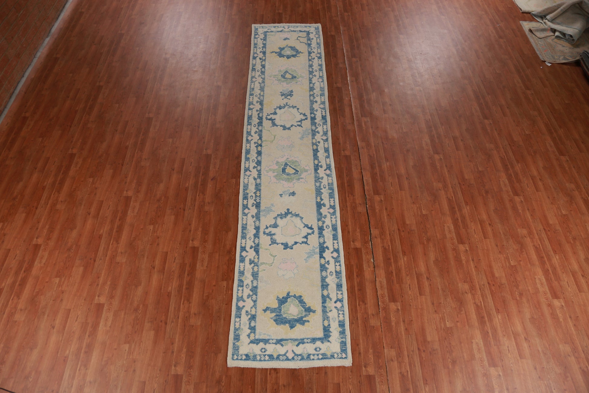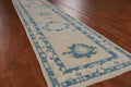 A Beautiful Genuine Turkey Oushak rug is Hand Knotted by skillful weavers in Turkey with 100% Wool Material. This rug is in New, First Quality condition. dimensions are 13' 8'' X 2' 11'' in foot and 417 X 89 in centimeter. the primary color is Beige & Ivories.