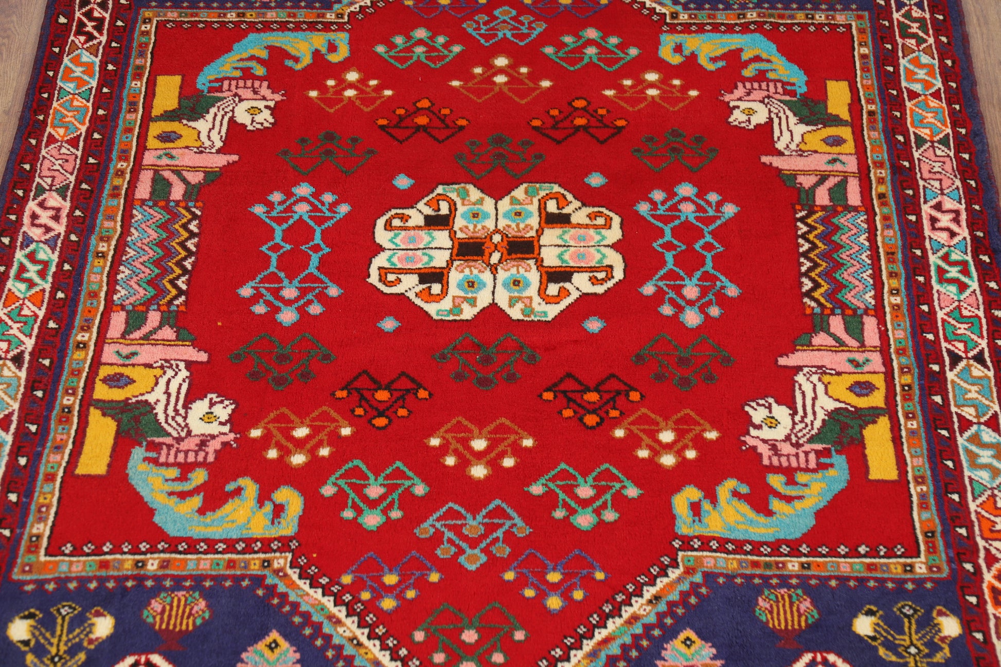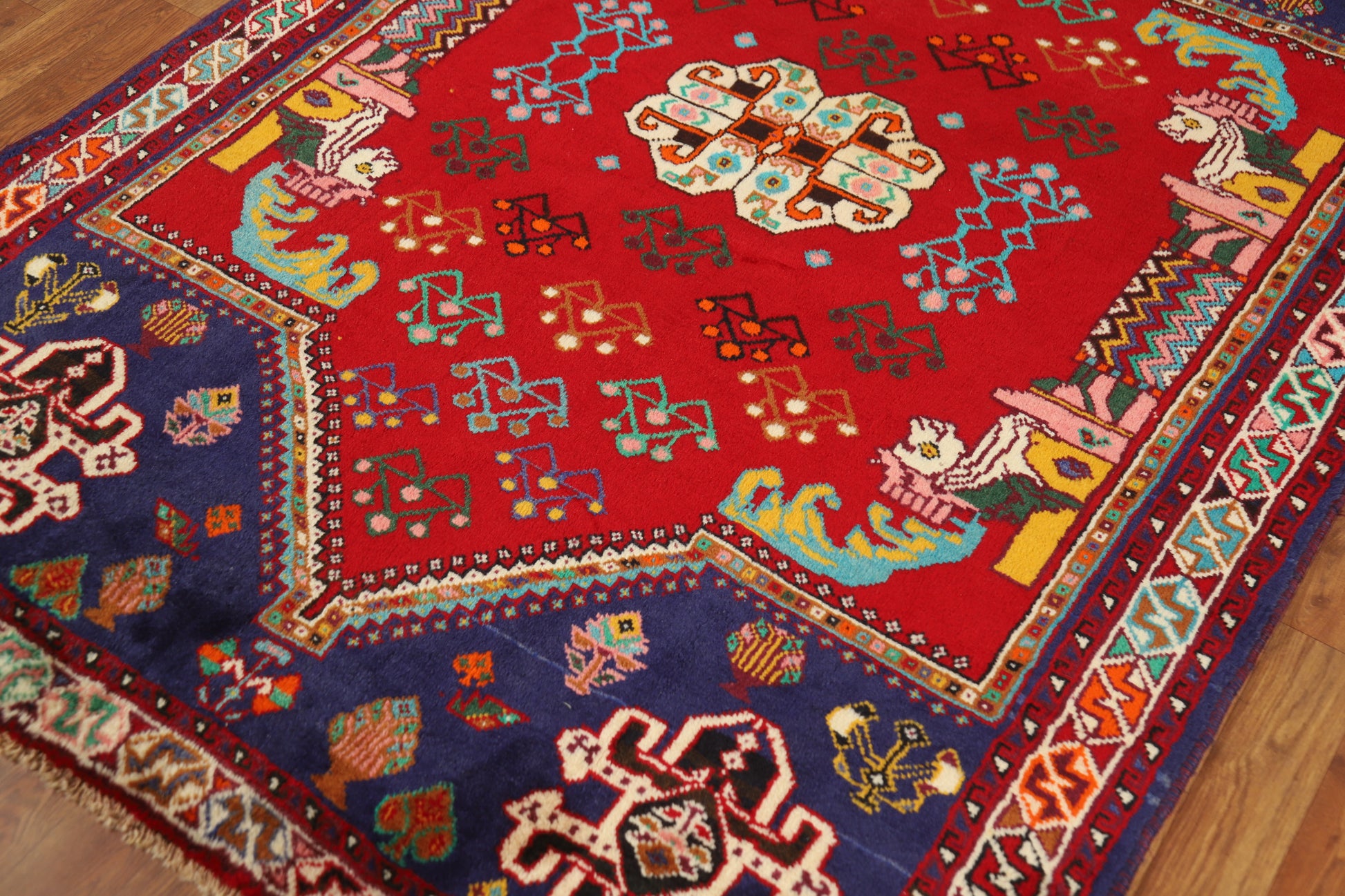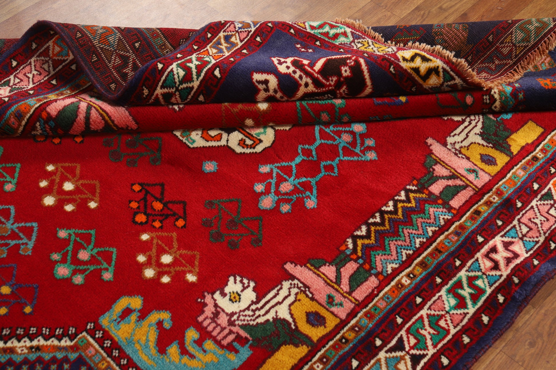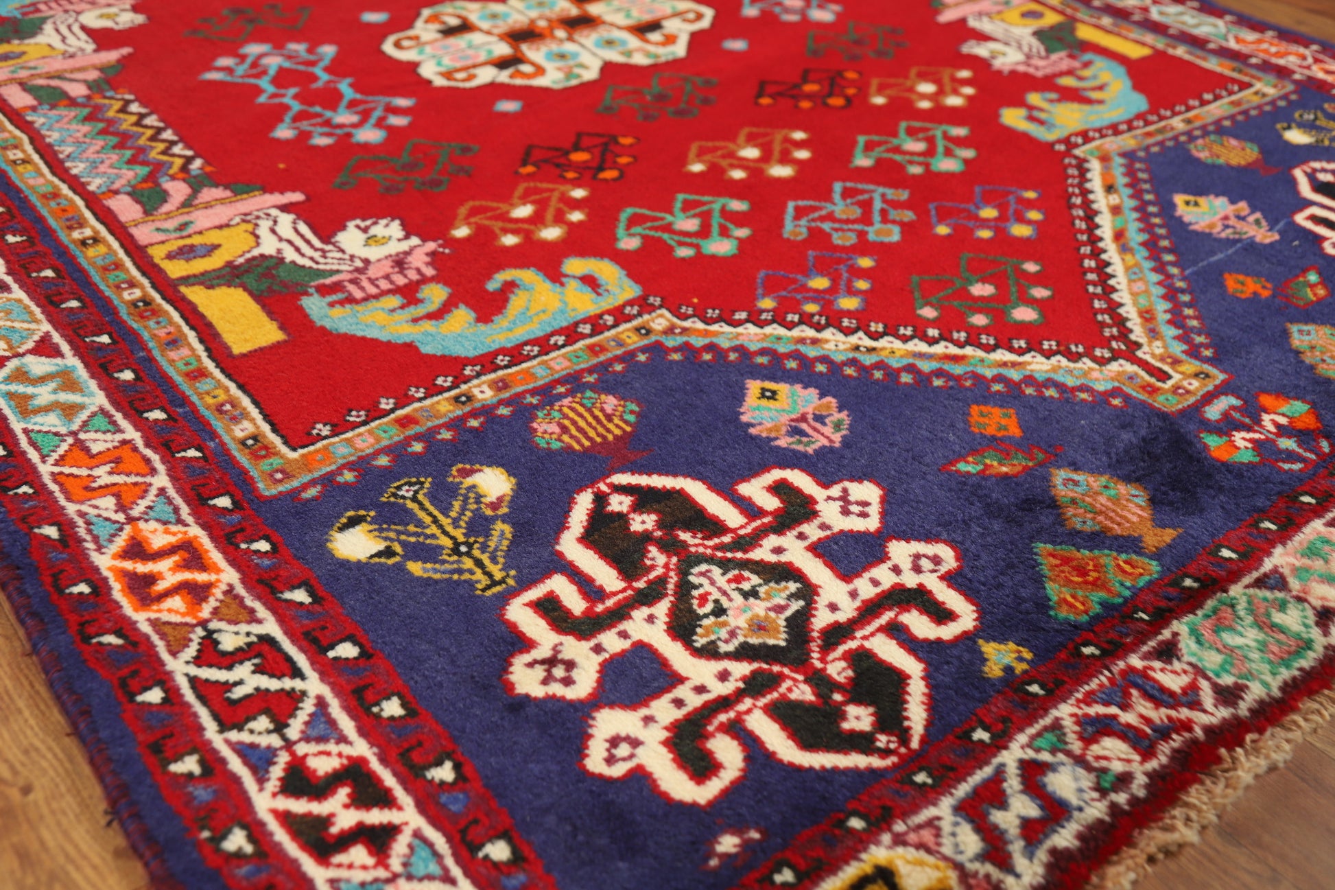 A Beautiful Genuine Persia ( Persia ) Shiraz rug is Hand Knotted by skillful weavers in Persia ( Persia ) with 100% Wool Material. This rug is in Very Good condition. dimensions are 6' 3'' X 4' 7'' in foot and 191 X 140 in centimeter. the primary color is Red.