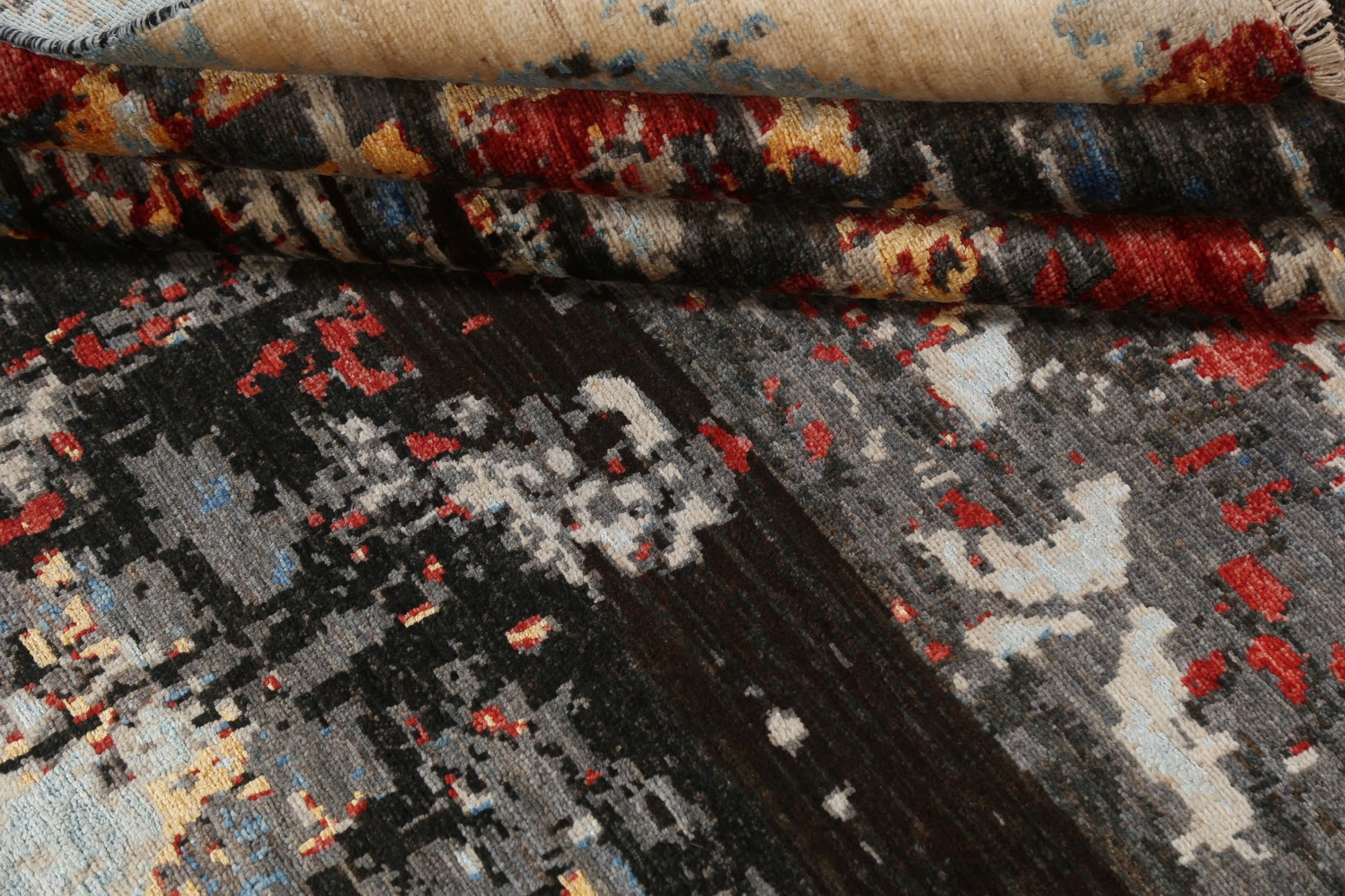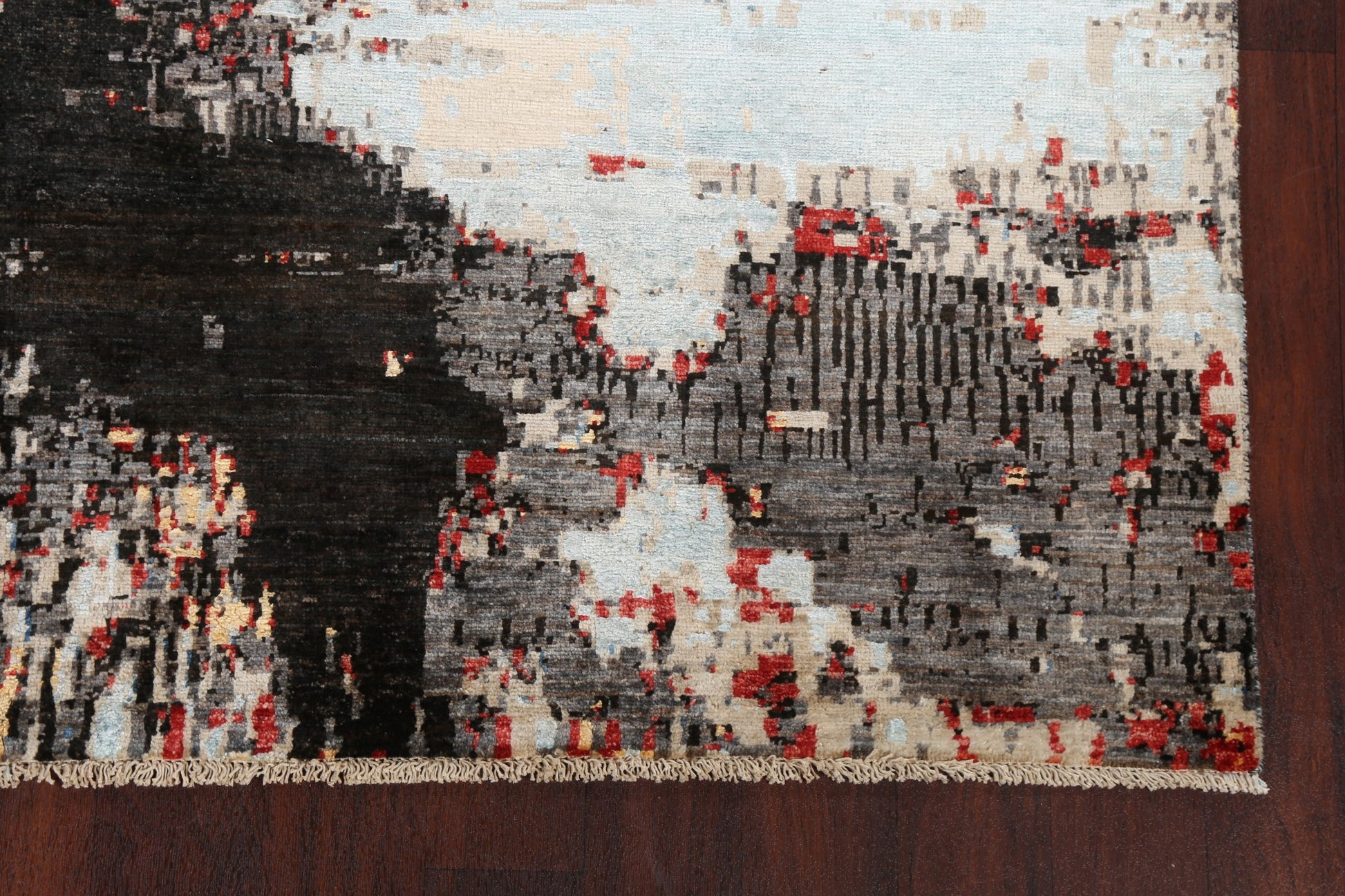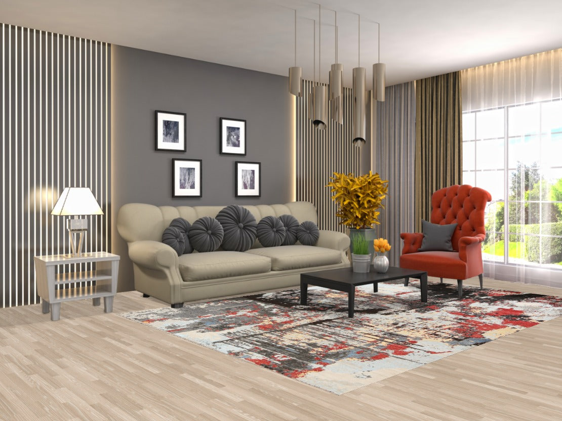 A Beautiful Genuine Pakistan Abstract rug is Hand Knotted by skillful weavers in Pakistan with Wool & Silk Material. This rug is in New, First Quality condition. dimensions are 9' 8'' X 6' 6'' in foot and  295 X 198 in centimeter. the primary color is Greys & Charcoal.