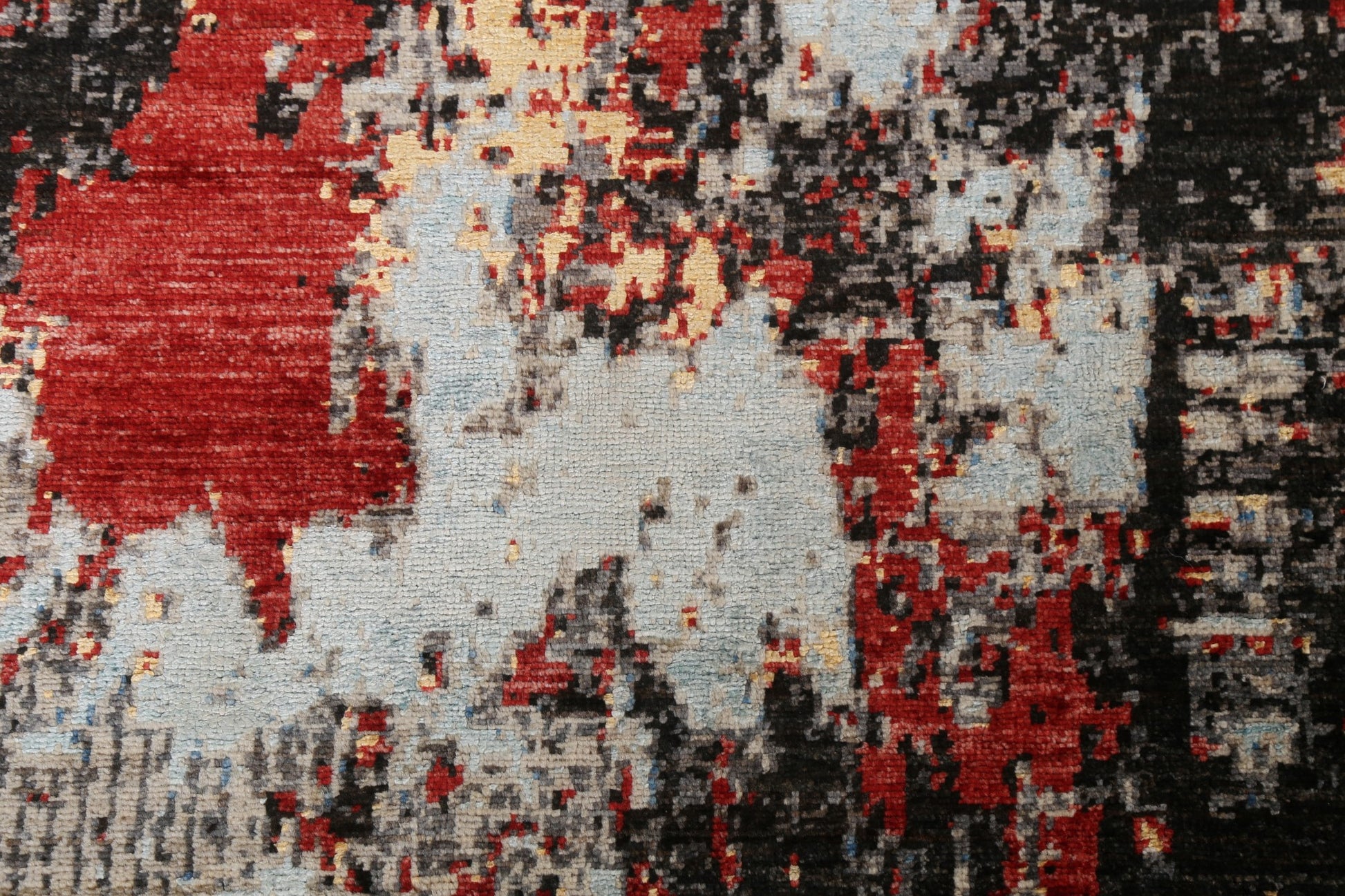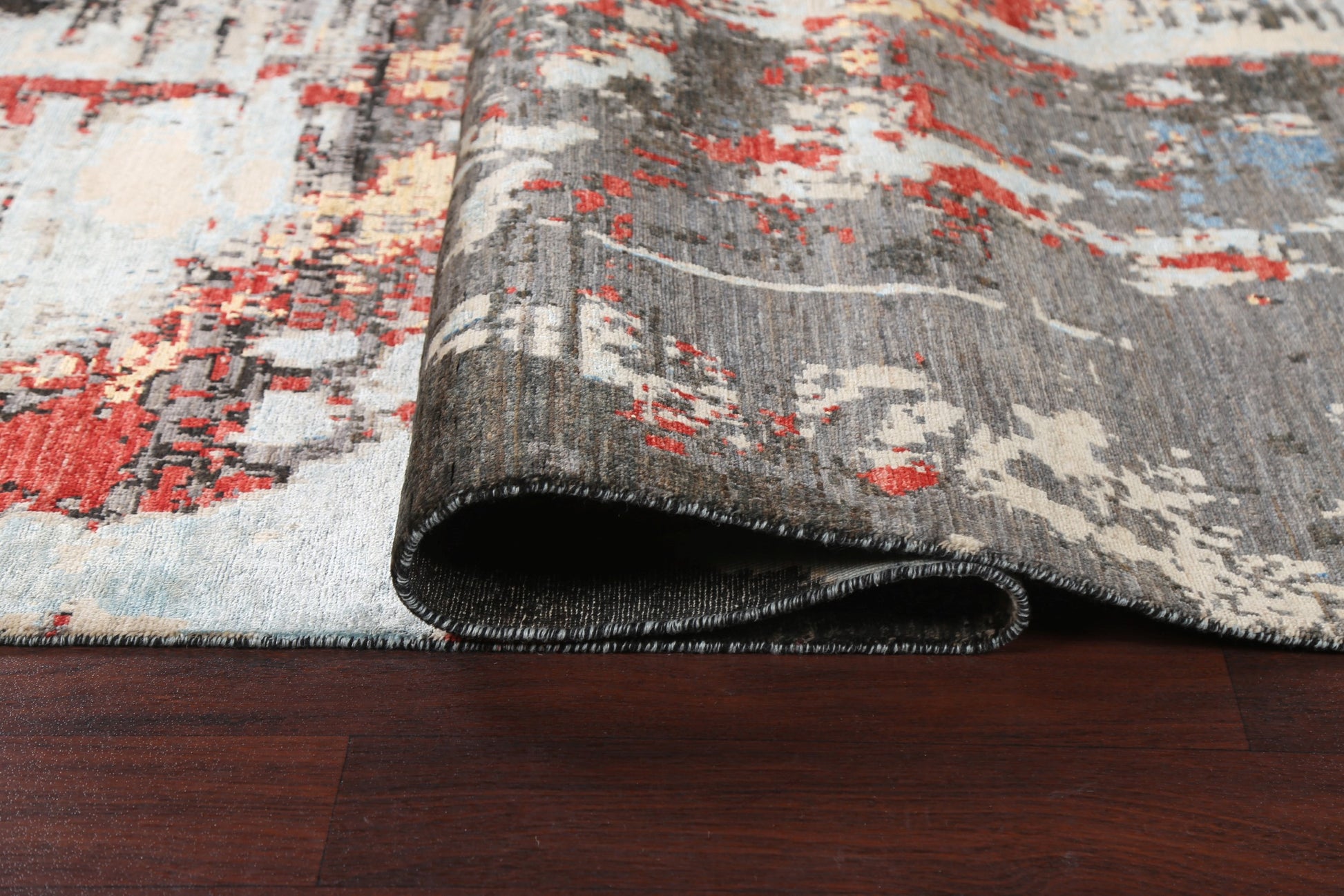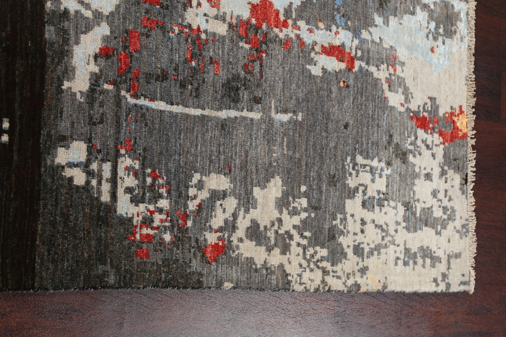 A Beautiful Genuine Pakistan Abstract rug is Hand Knotted by skillful weavers in Pakistan with Wool & Silk Material. This rug is in New, First Quality condition. dimensions are 9' 8'' X 6' 6'' in foot and  295 X 198 in centimeter. the primary color is Greys & Charcoal.