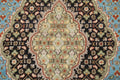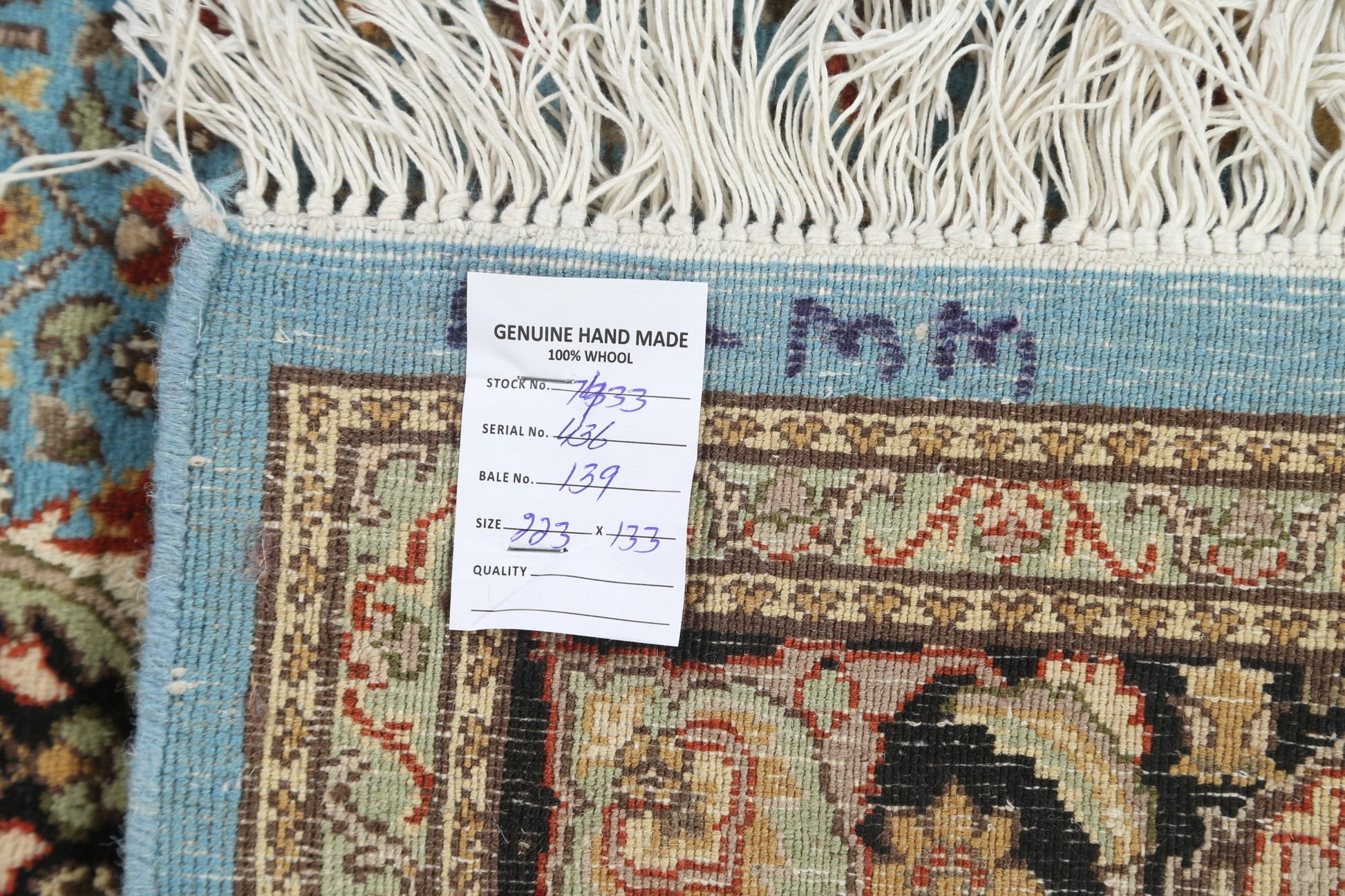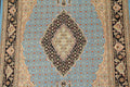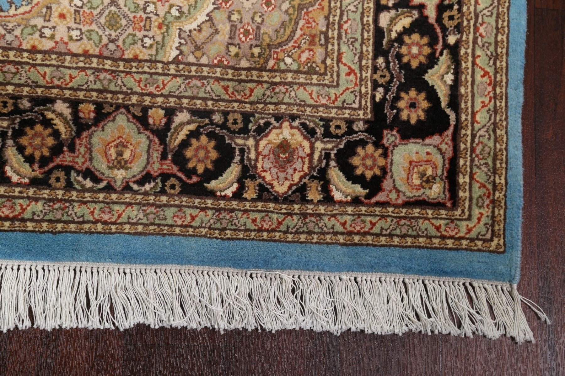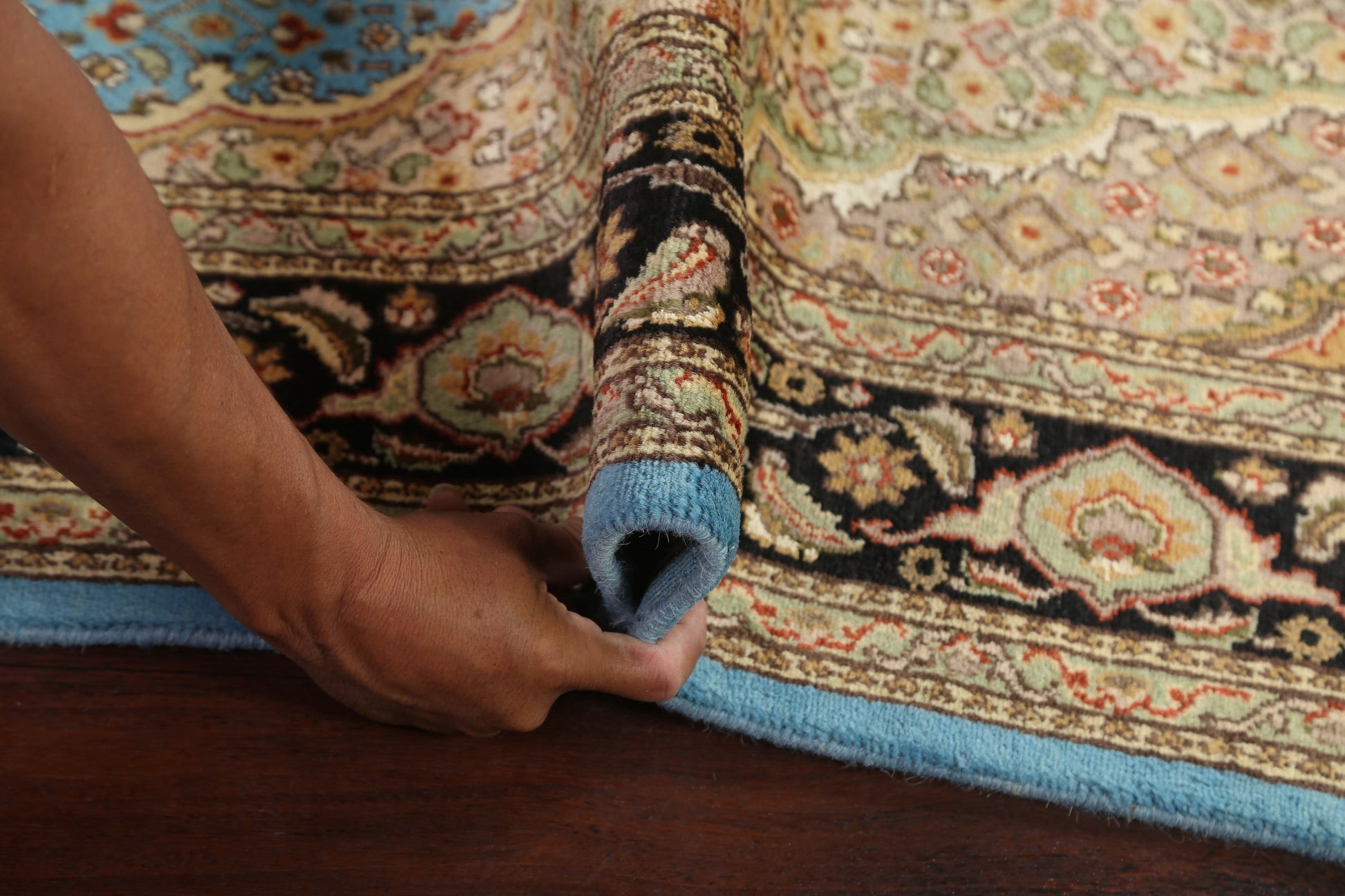 A Beautiful Genuine Pakistan Tabriz-Mahi rug is Hand Knotted by skillful weavers in Pakistan with Wool & Silk Material. This rug is in New, First Quality condition. dimensions are 7' 4'' X 4' 5'' in foot and 224 X 135 in centimeter. the primary color is Navy Blue & Blues.