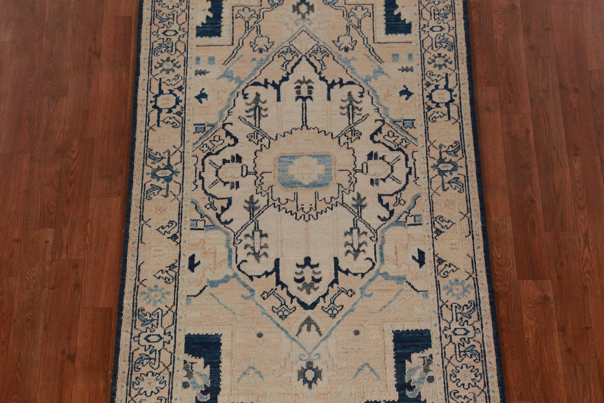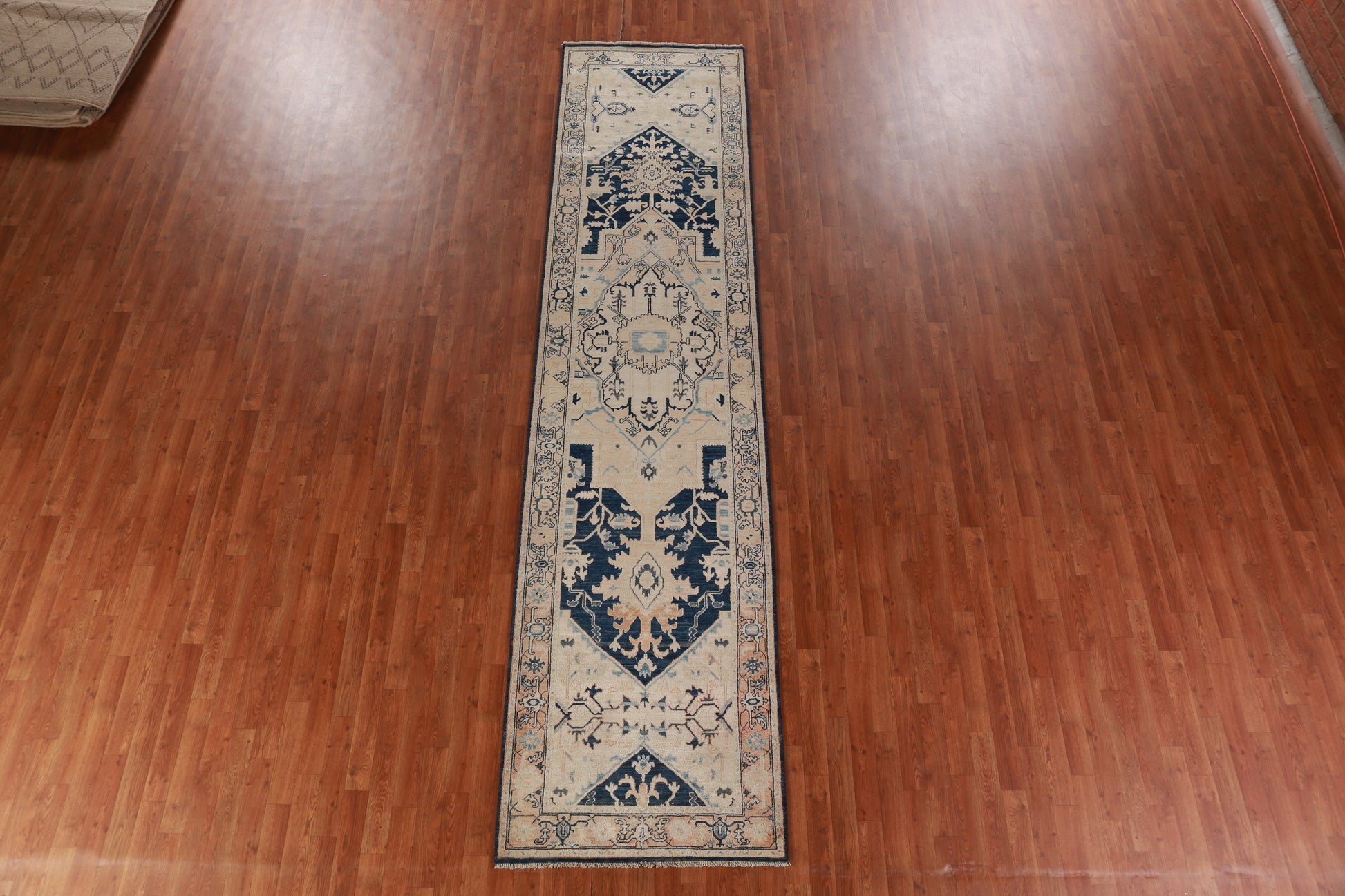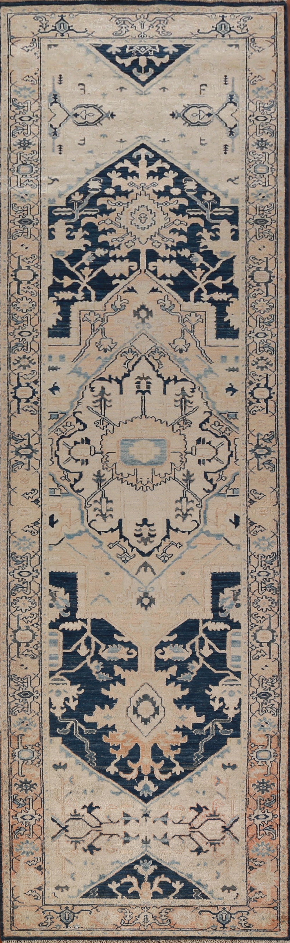 A Beautiful Genuine Pakistan Ziegler rug is Hand Knotted by skillful weavers in Pakistan with 100% Wool Material. This rug is in New, First Quality condition. dimensions are 13' 3'' X 3' 2'' in foot and 404 X 97 in centimeter. the primary color is Beige & Ivories.