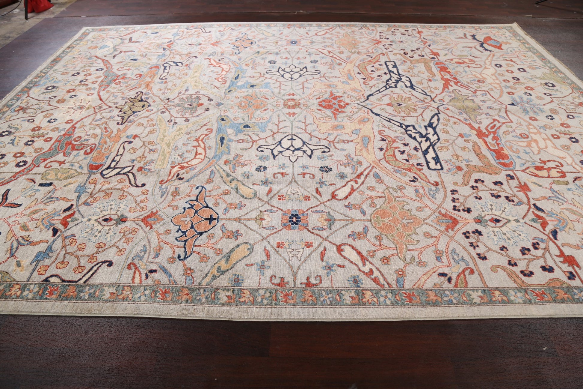 A Beautiful Genuine Pakistan Ziegler rug is Hand Knotted by skillful weavers in Pakistan with 100% Wool Material. This rug is in New, First Quality condition. dimensions are 13' 7'' X 10' 0'' in foot and 414 X 305 in centimeter. the primary color is Greys & Charcoal.