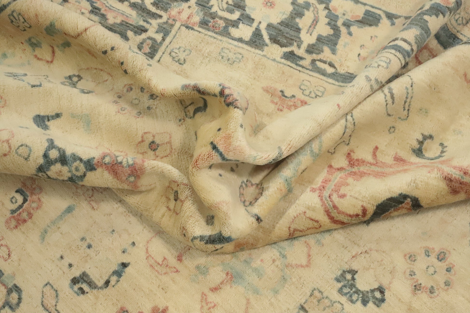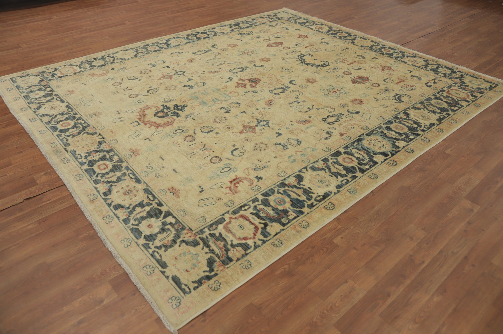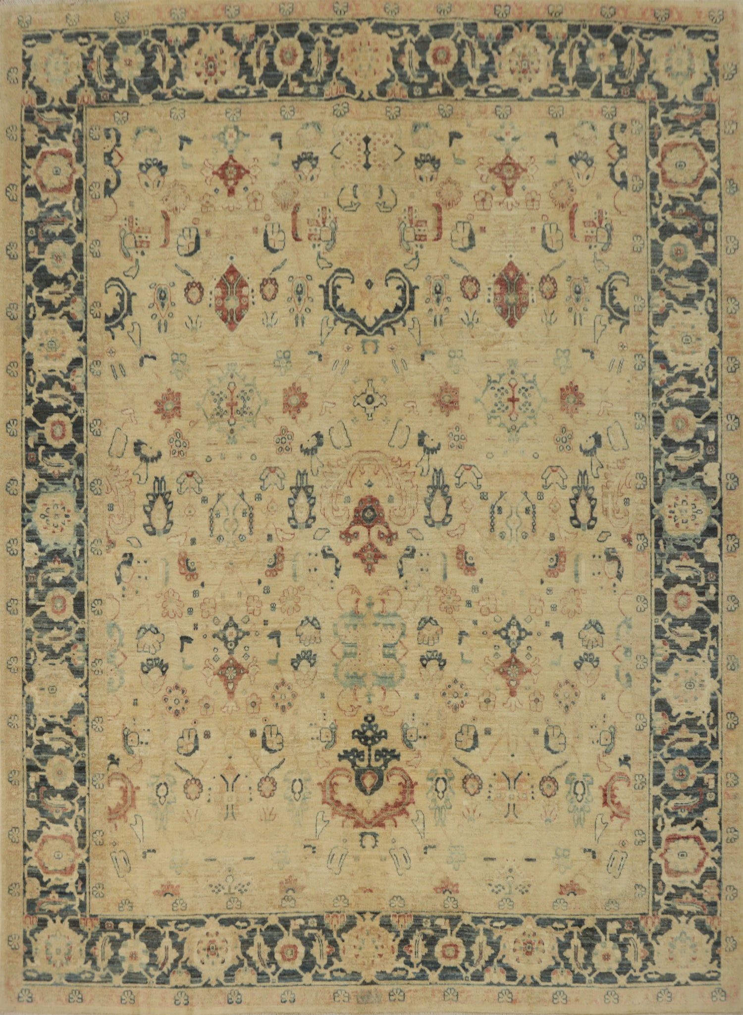 A Beautiful Genuine Pakistan Ziegler rug is Hand Knotted by skillful weavers in Pakistan with 100% Wool Material. This rug is in New, First Quality condition. dimensions are 9' 9'' X 8' 3'' in foot and 297 X 251 in centimeter. the primary color is Beige & Ivories.