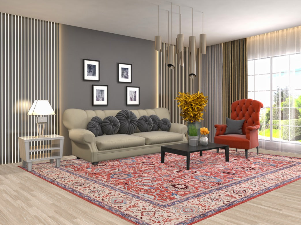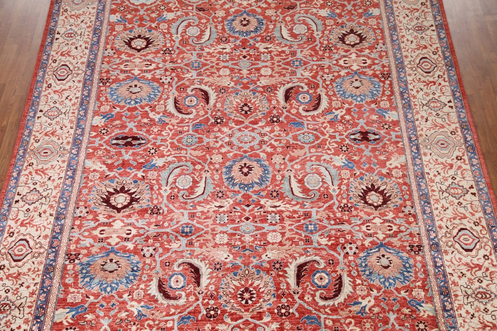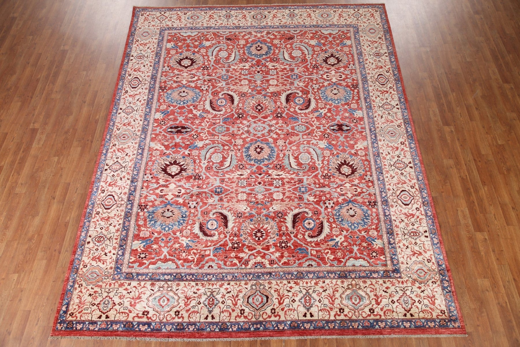 A Beautiful Genuine Pakistan Ziegler rug is Hand Knotted by skillful weavers in Pakistan with 100% Wool Material. This rug is in condition. dimensions are 11' 2'' X 8' 9'' in foot and 340 X 267 in centimeter. the primary color is Red.