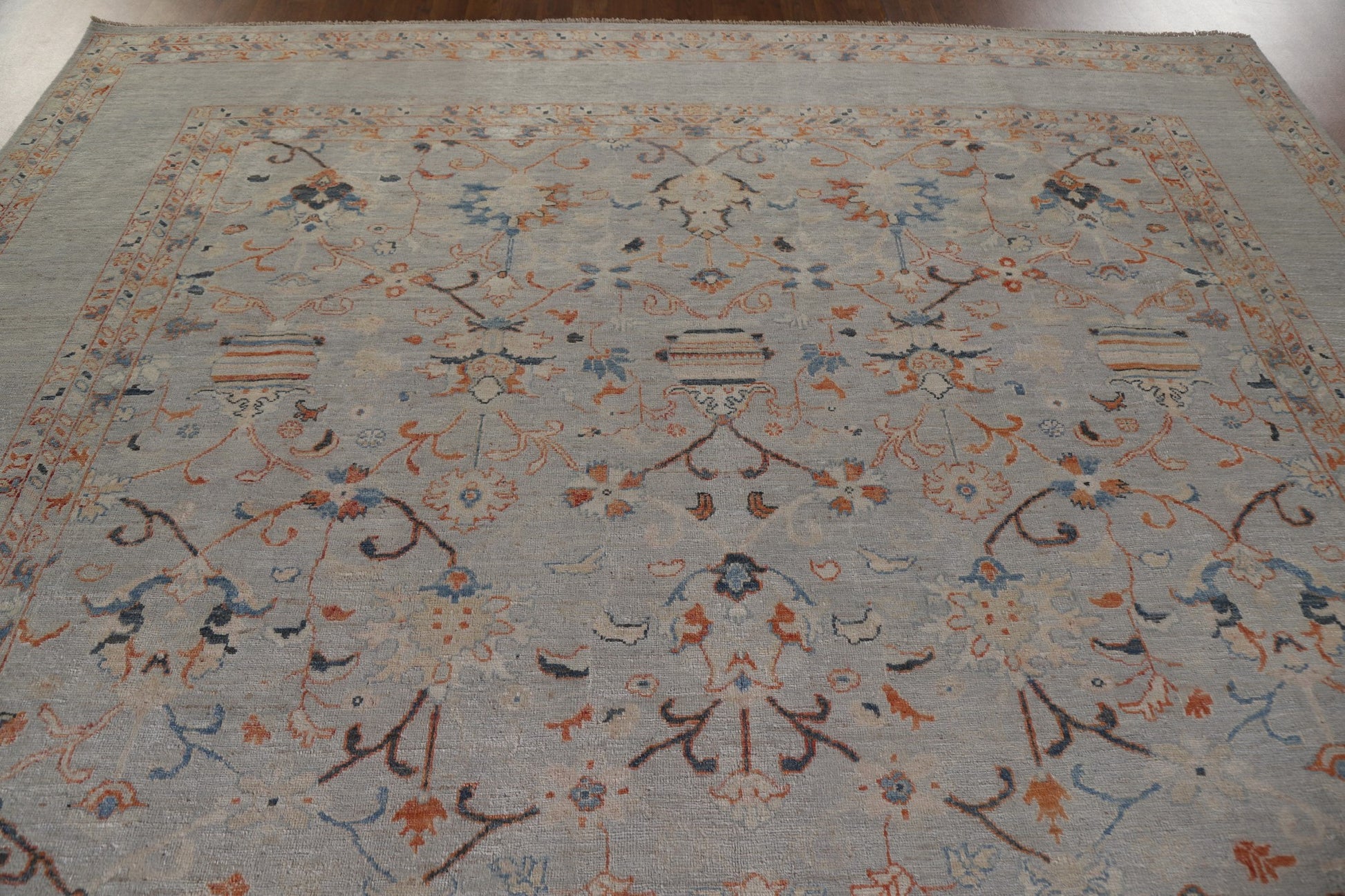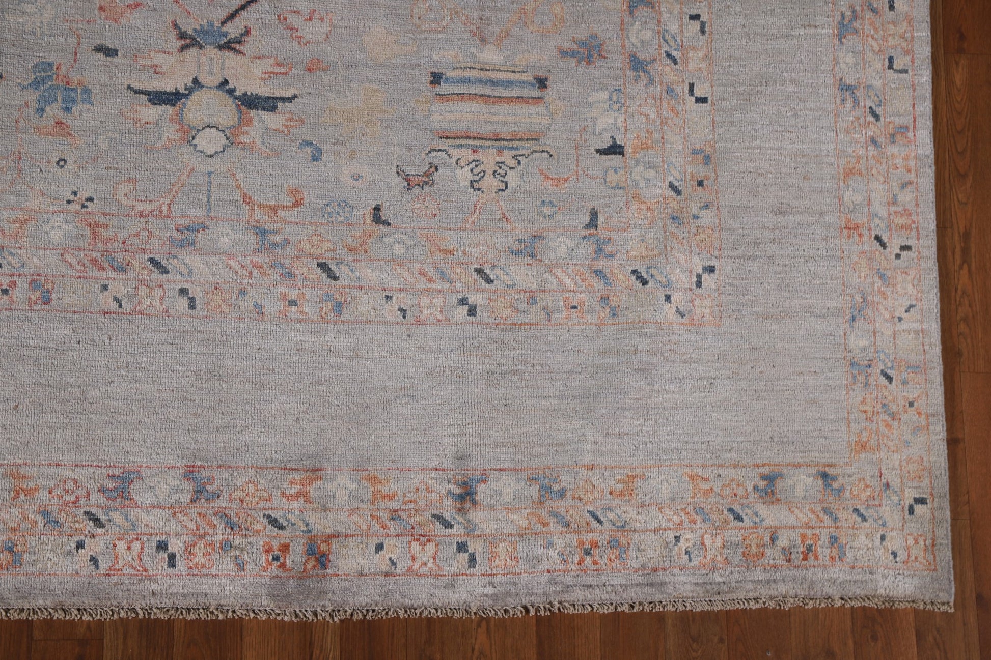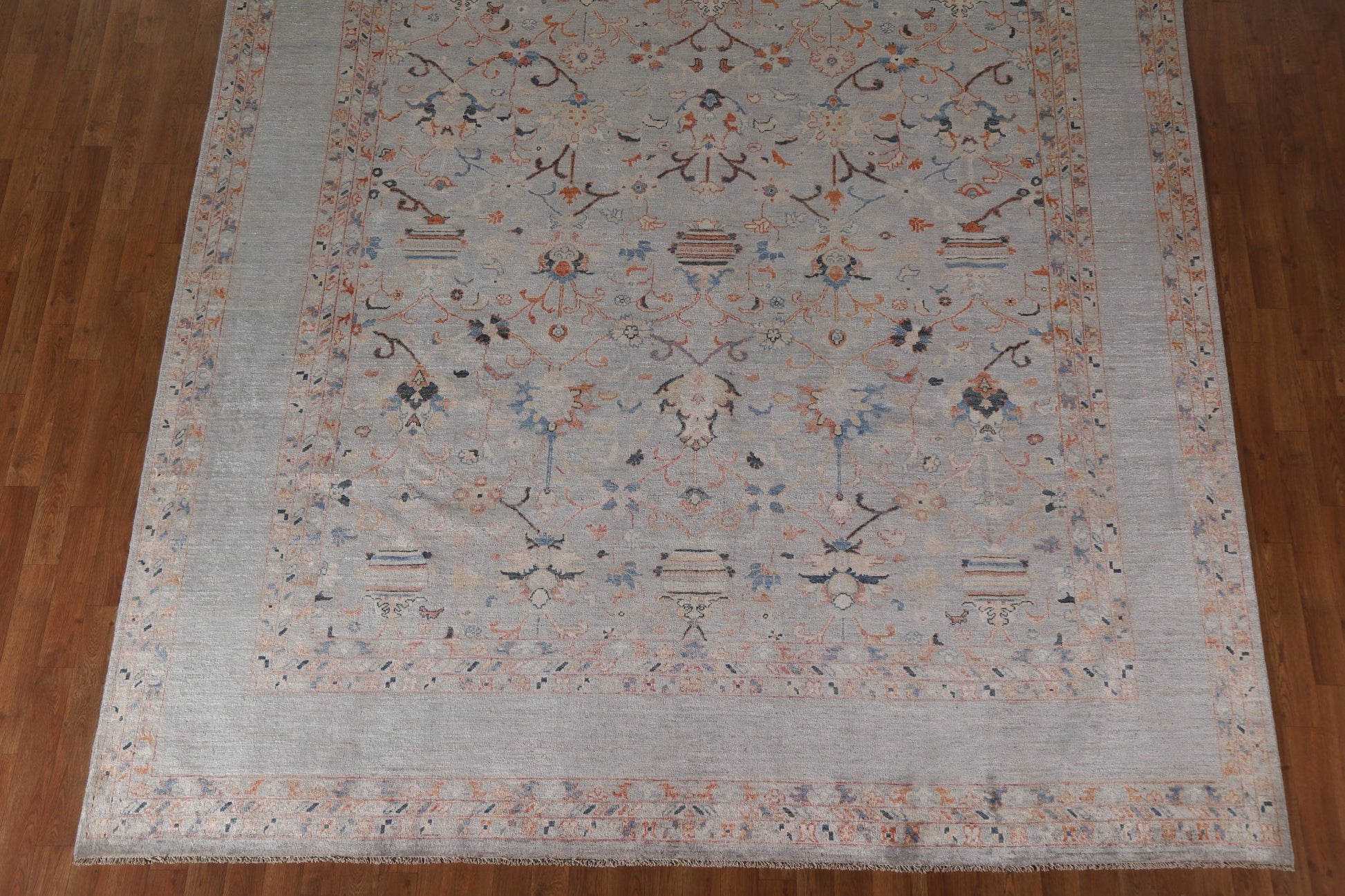 A Beautiful Genuine Pakistan Ziegler rug is Hand Knotted by skillful weavers in Pakistan with 100% Wool Material. This rug is in New, First Quality condition. dimensions are 11' 9'' X 8' 11'' in foot and 358 X 272 in centimeter. the primary color is Greys & Charcoal.