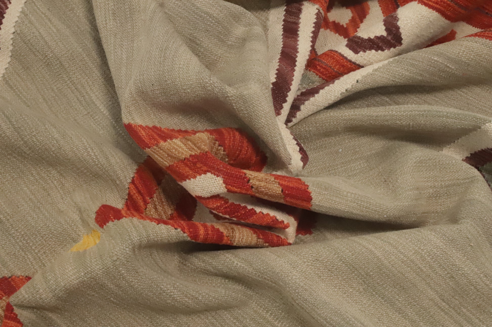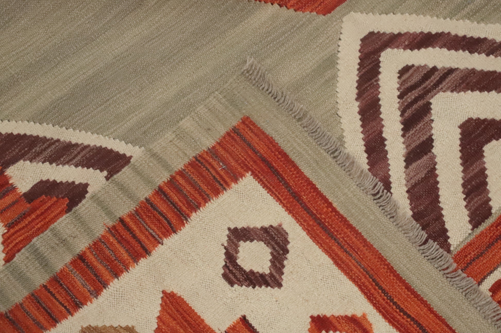 A Beautiful Genuine Pakistan Kilim rug is Hand Woven by skillful weavers in Pakistan with 100% Wool Material. This rug is in New, First Quality condition. dimensions are 11' 6'' X 9' 2'' in foot and 351 X 279 in centimeter. the primary color is Greys & Charcoal.