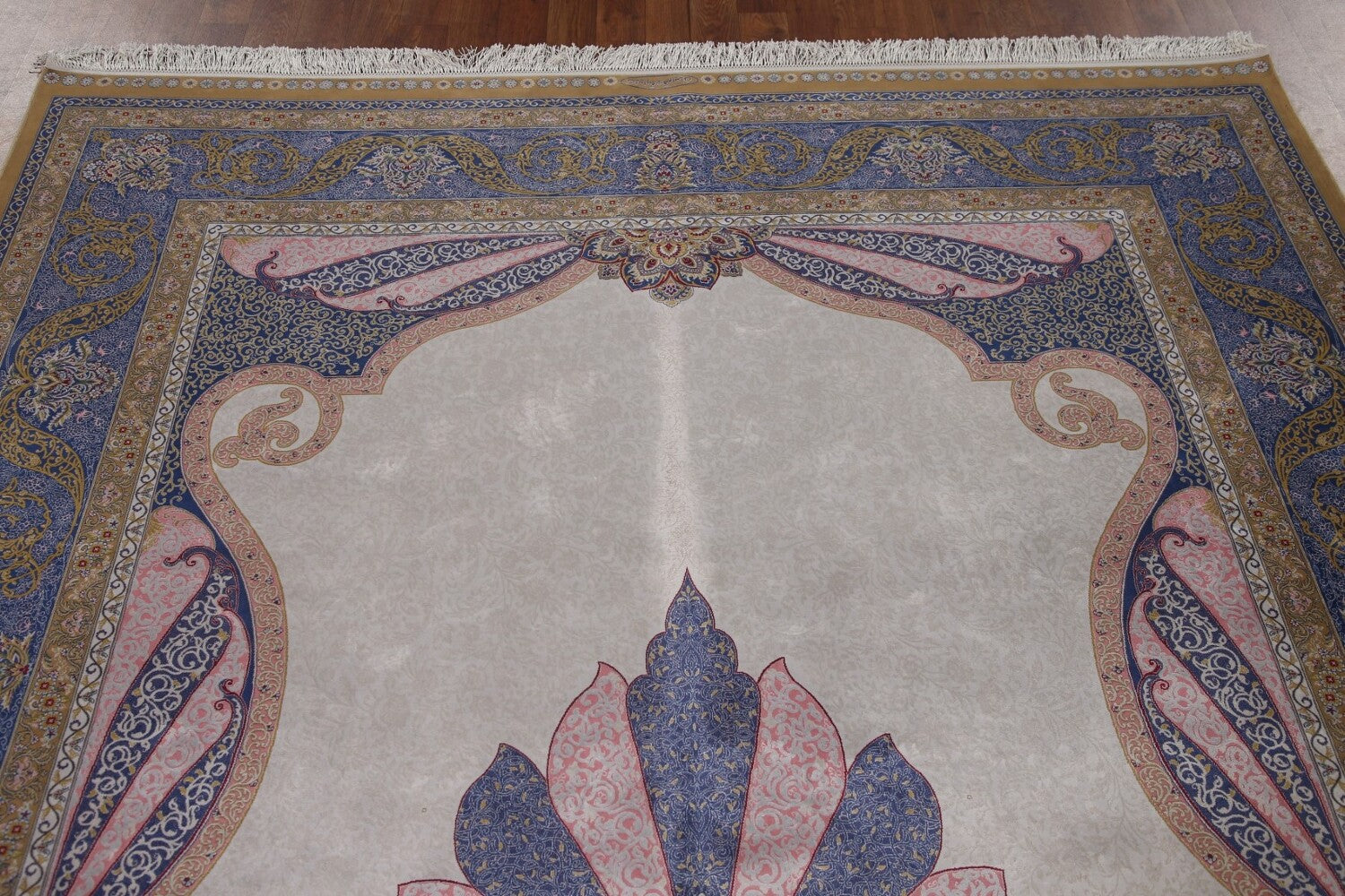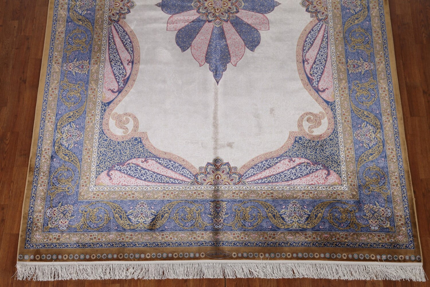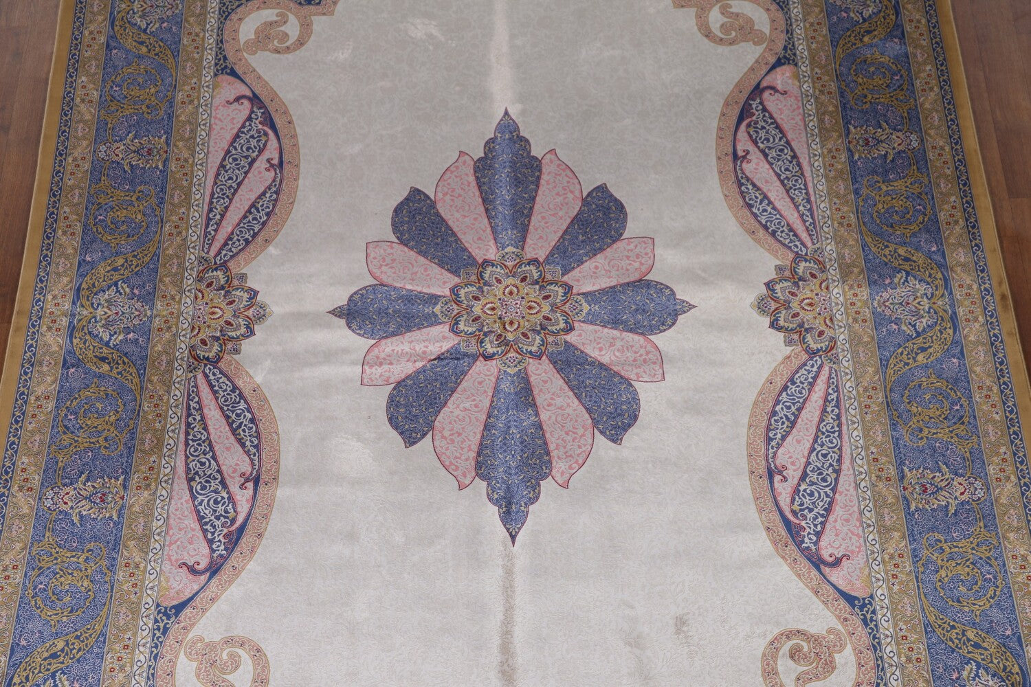 A Beautiful Genuine Turkey Qum rug is Machine Made by skillful weavers in Turkey with 90% Silk - 10% Polyester Material. This rug is in condition. dimensions are 10' 0'' X 6' 5'' in foot and 305 X 196 in centimeter. the primary color is Beige & Ivories.