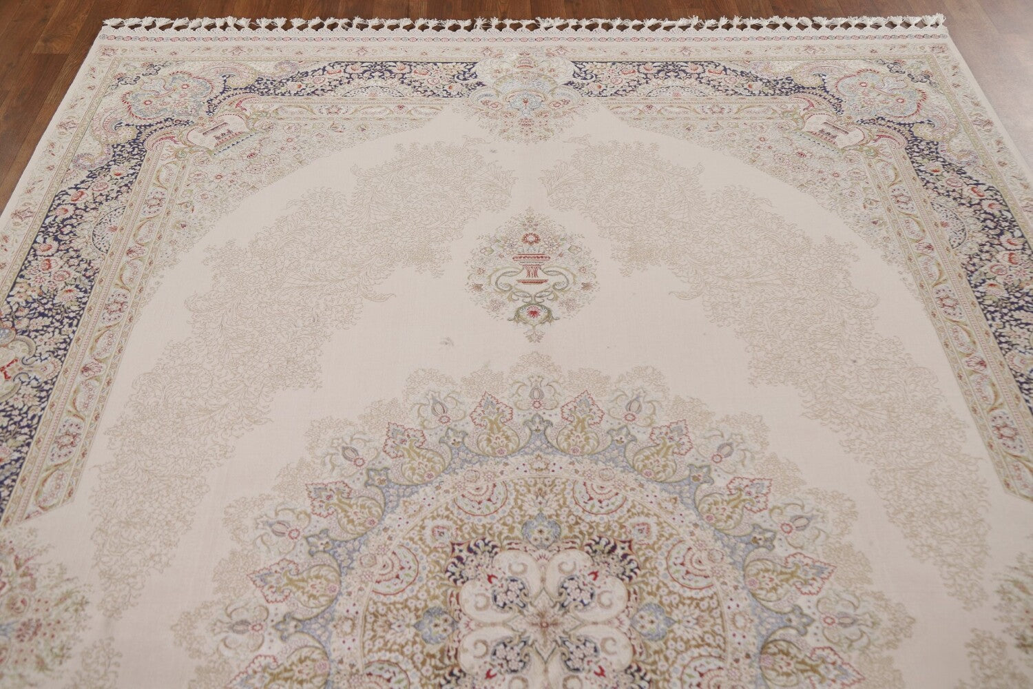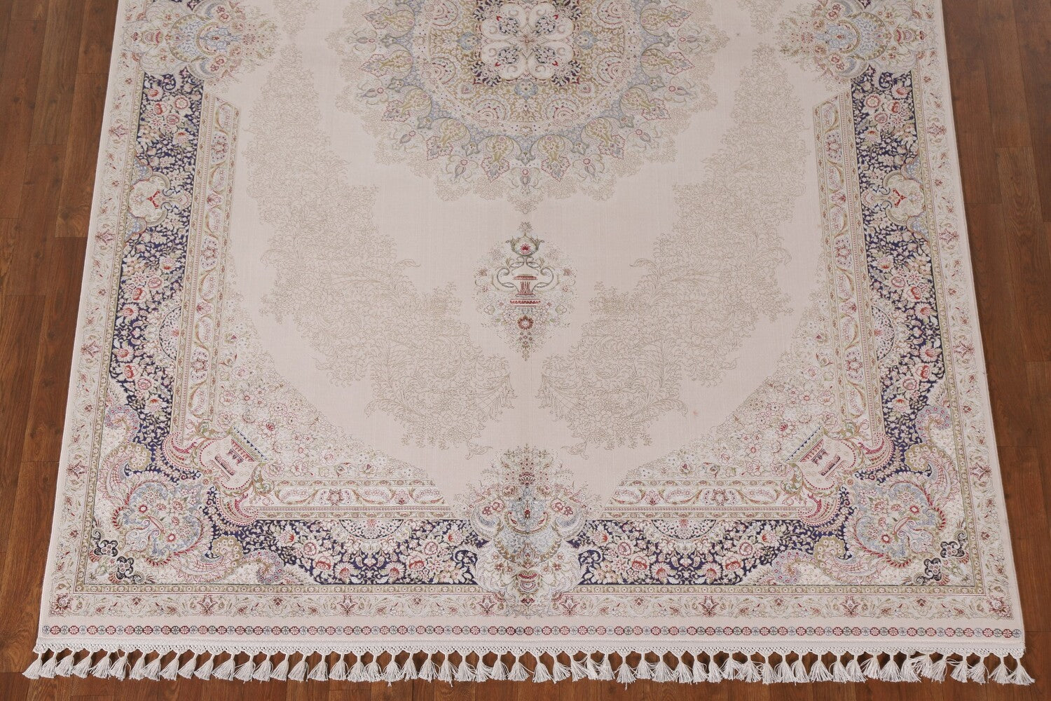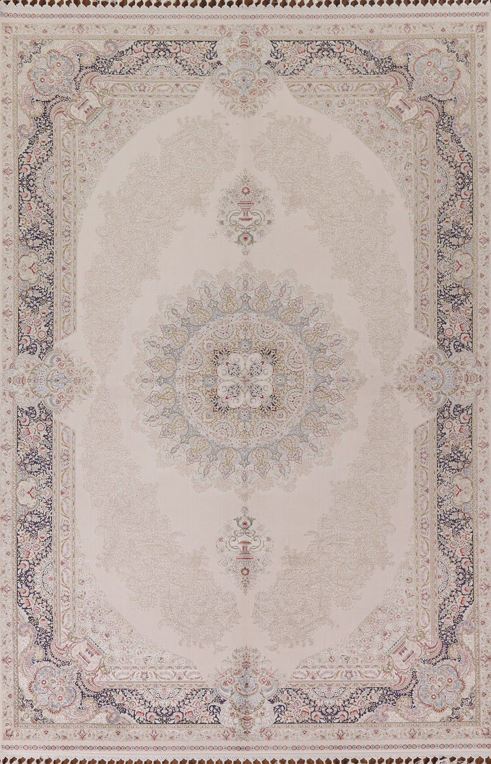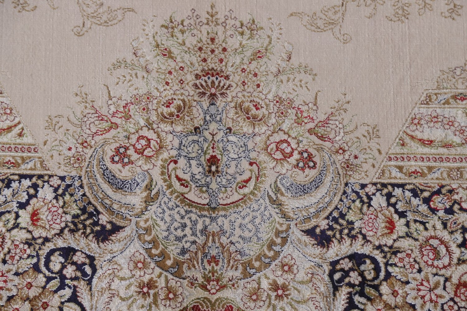 A Beautiful Genuine Turkey Tabriz rug is Machine Made by skillful weavers in Turkey with 90% Silk - 10% Polyester Material. This rug is in condition. dimensions are 9' 11'' X 6' 6'' in foot and 302 X 198 in centimeter. the primary color is Beige & Ivories.