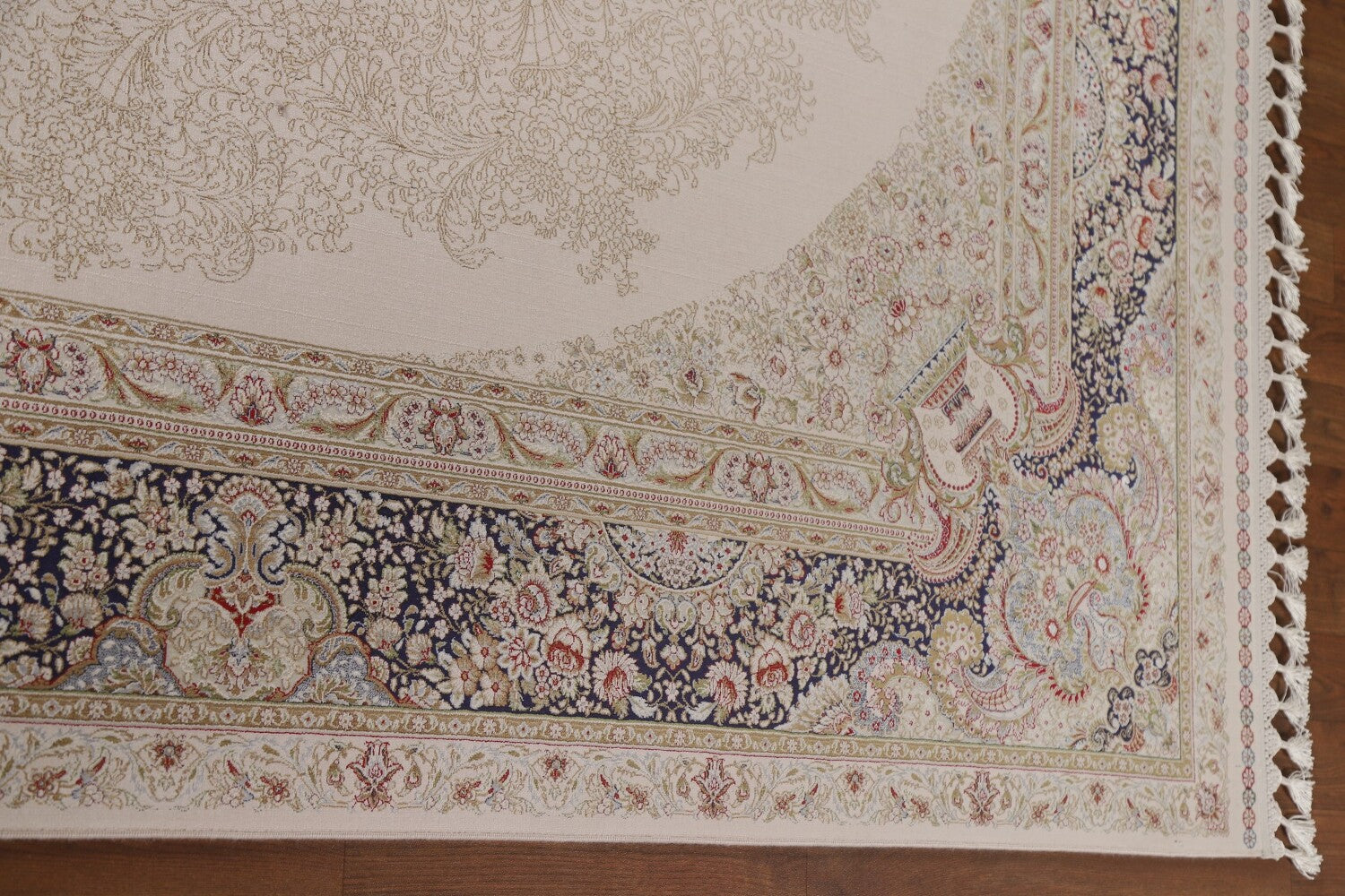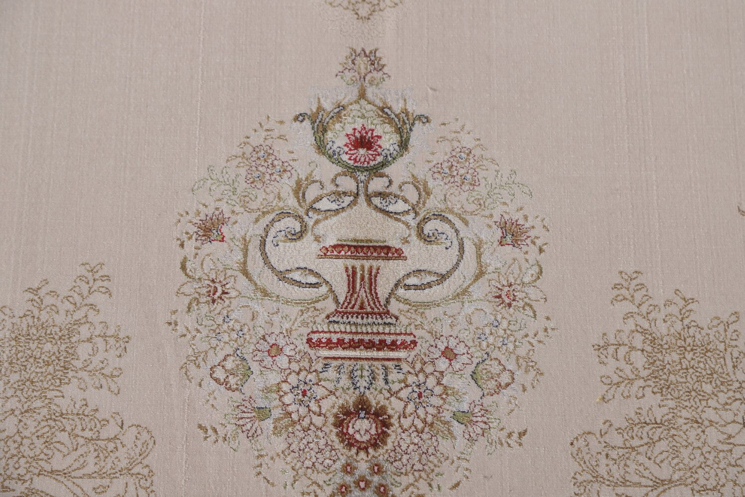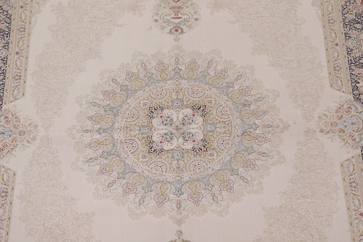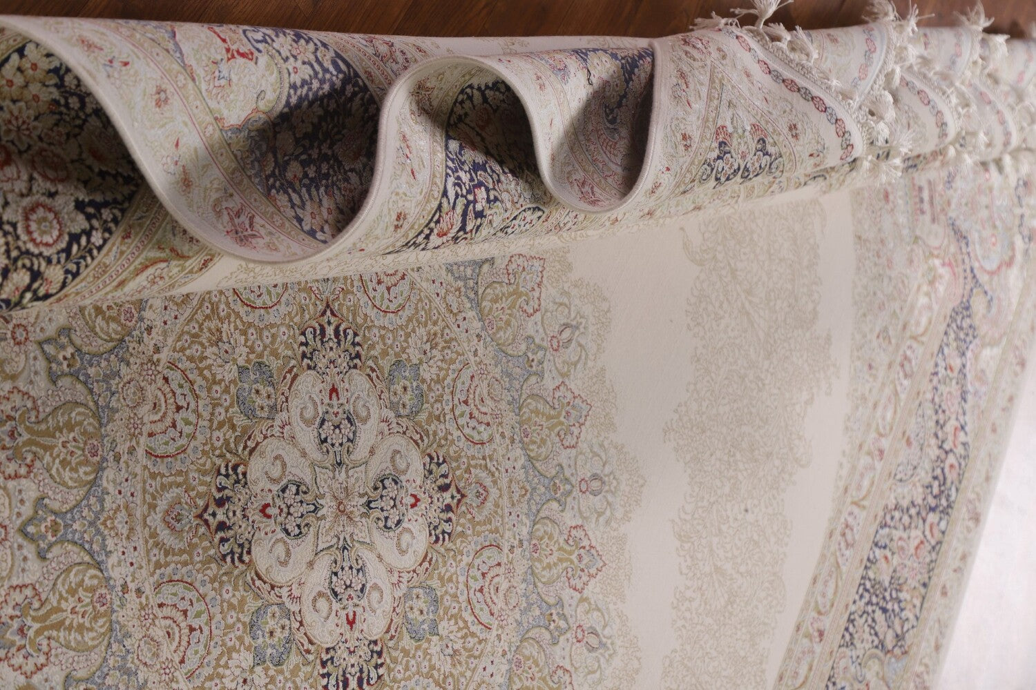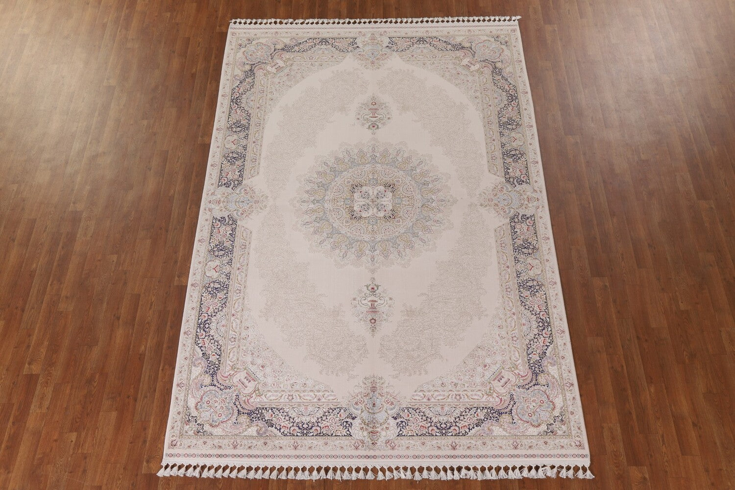 A Beautiful Genuine Turkey Tabriz rug is Machine Made by skillful weavers in Turkey with 90% Silk - 10% Polyester Material. This rug is in condition. dimensions are 9' 11'' X 6' 6'' in foot and 302 X 198 in centimeter. the primary color is Beige & Ivories.