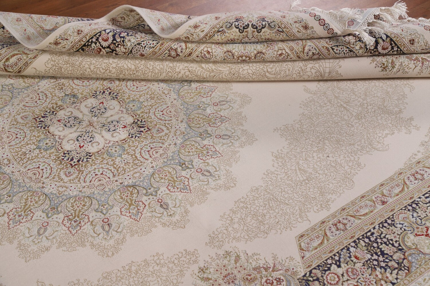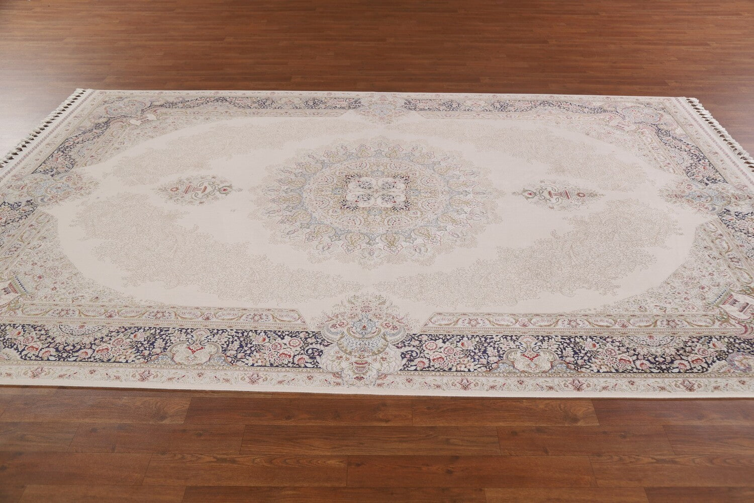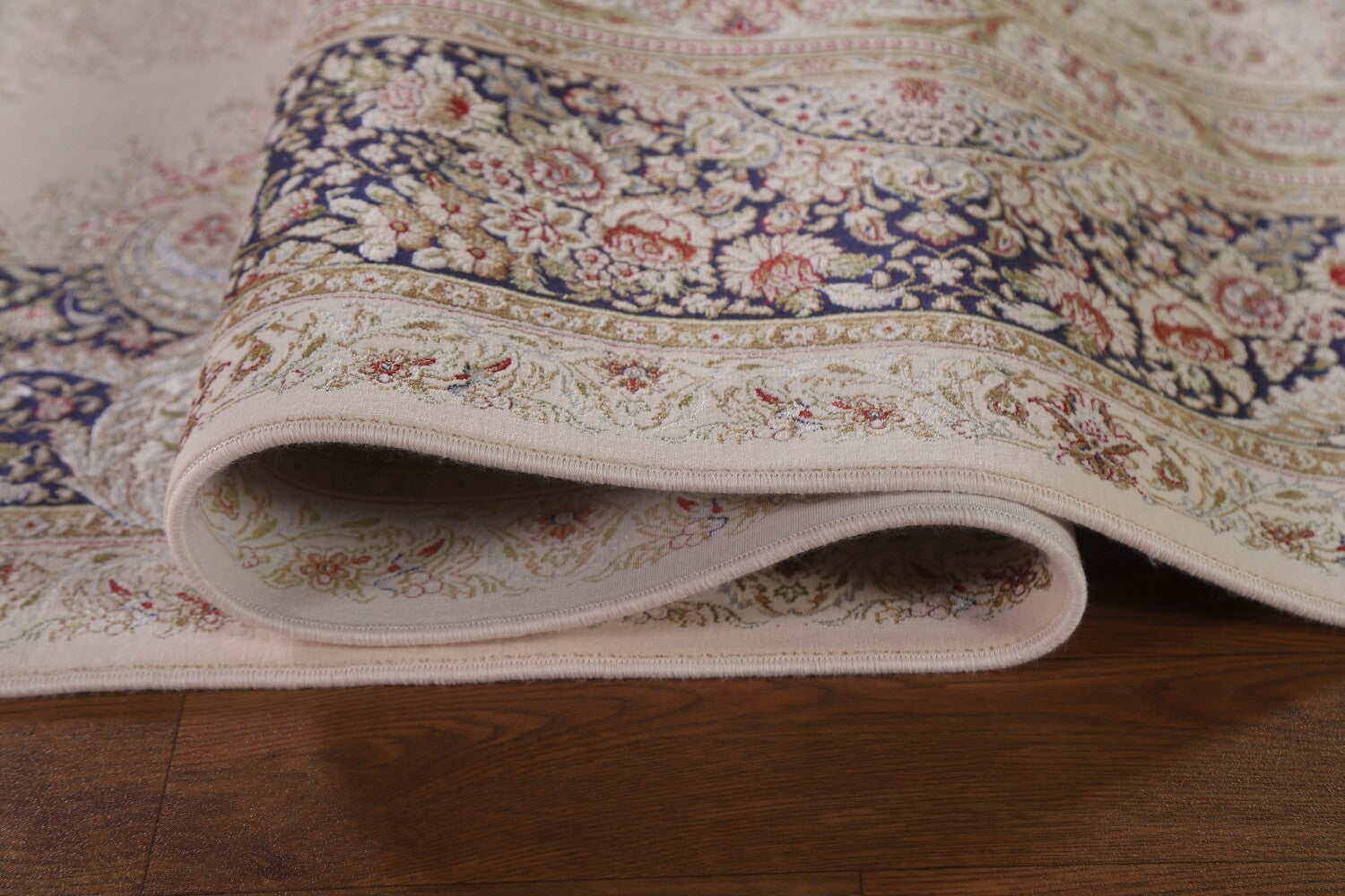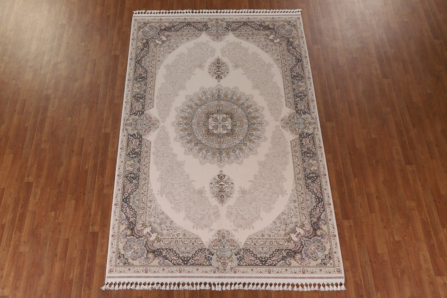 A Beautiful Genuine Turkey Tabriz rug is Machine Made by skillful weavers in Turkey with 90% Silk - 10% Polyester Material. This rug is in condition. dimensions are 9' 11'' X 6' 6'' in foot and 302 X 198 in centimeter. the primary color is Beige & Ivories.