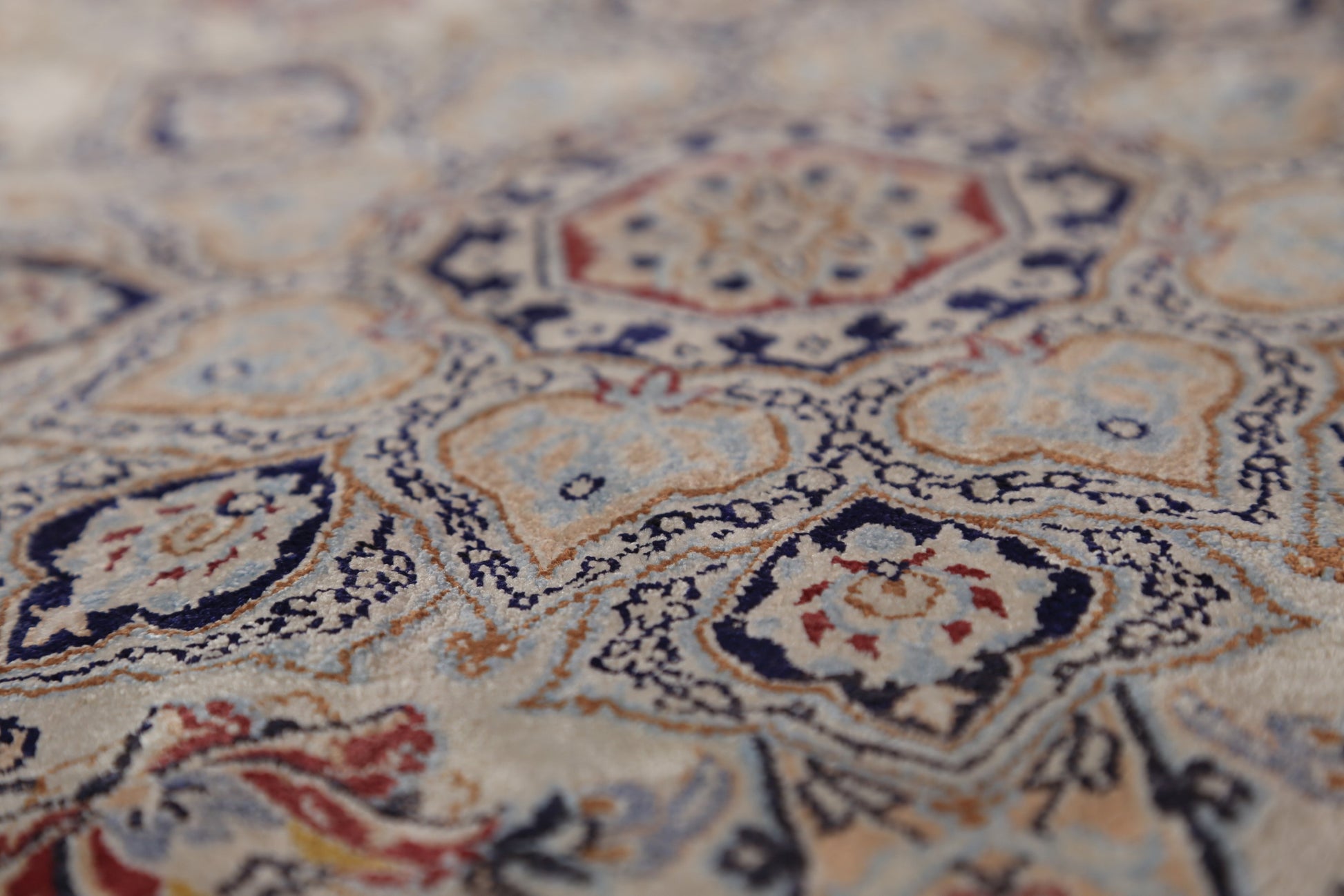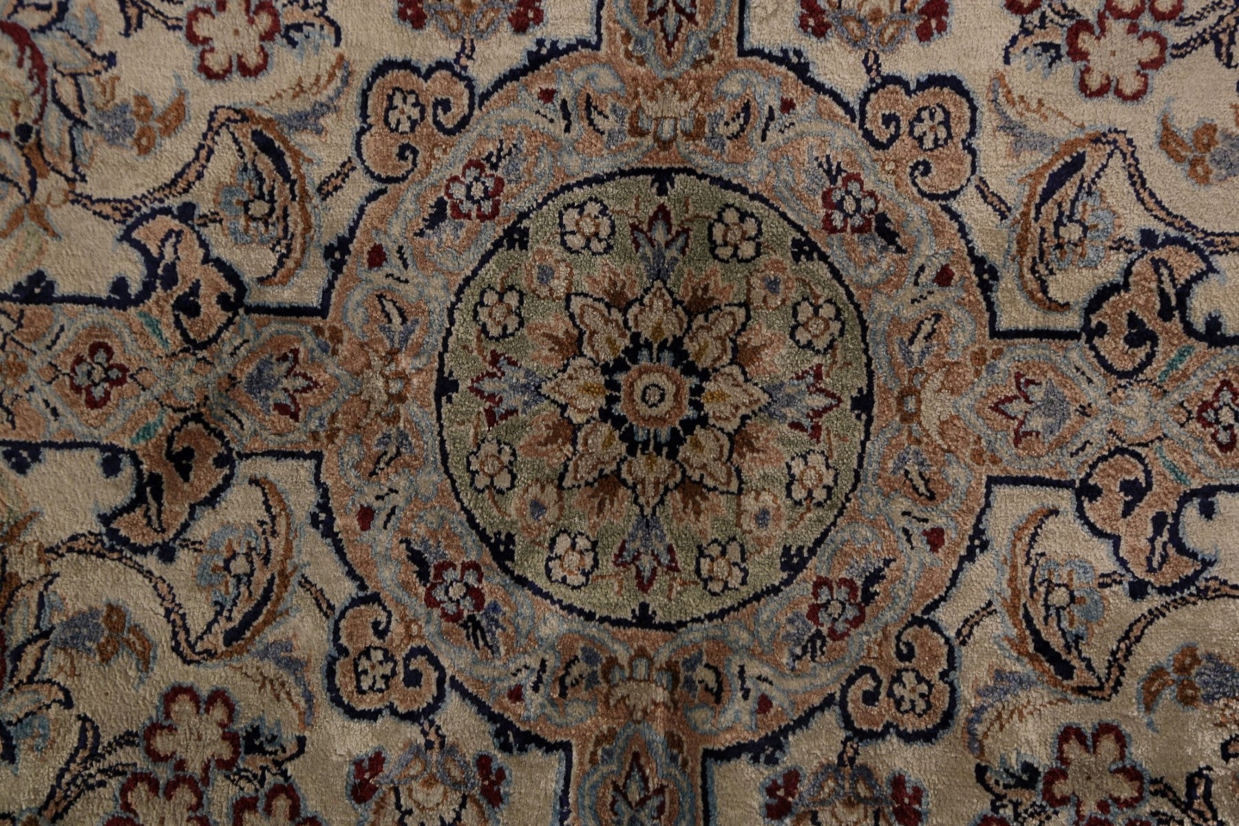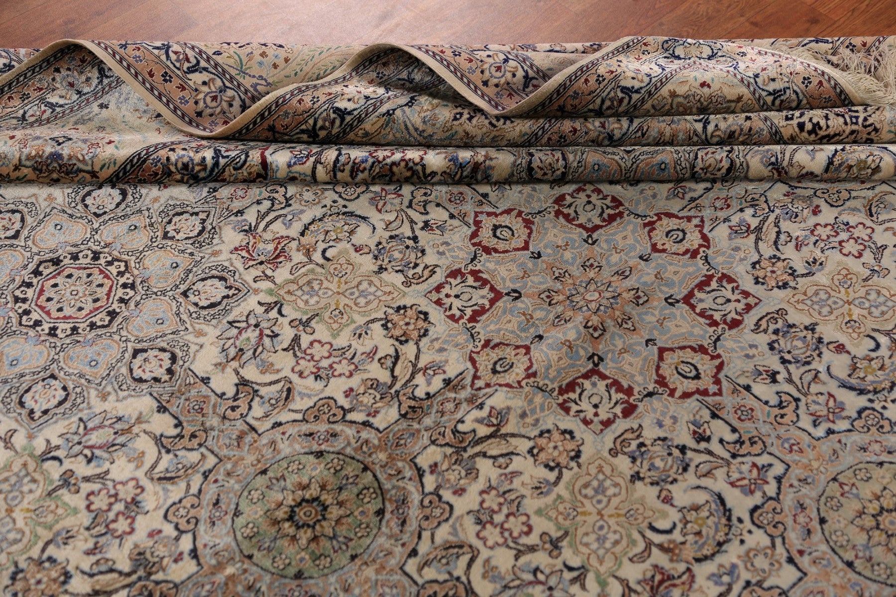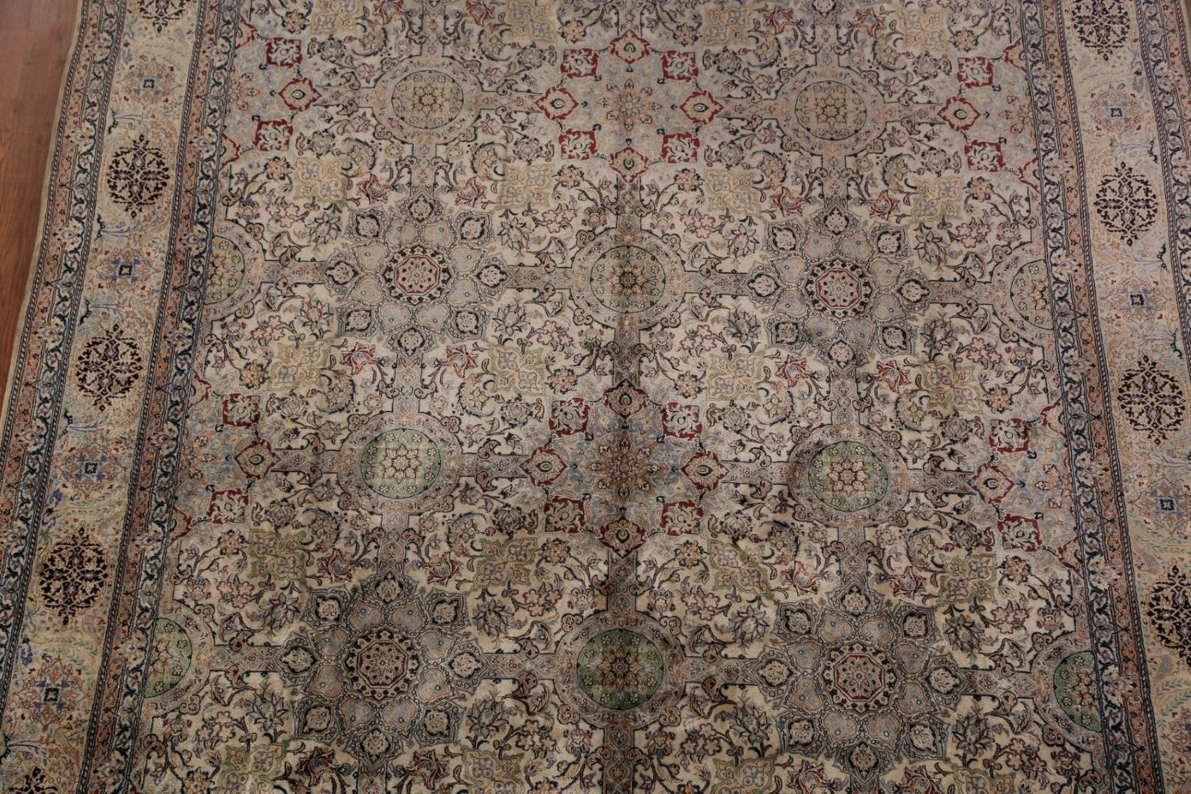 A Beautiful Genuine Persia ( Persia ) Nain rug is Hand Knotted by skillful weavers in Persia ( Persia ) with 100% Silk Material. This rug is in Excellent condition. dimensions are 10' 9'' X 7' 5'' in foot and 328 X 226 in centimeter. the primary color is Beige & Ivories.