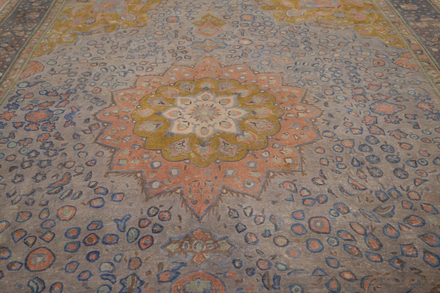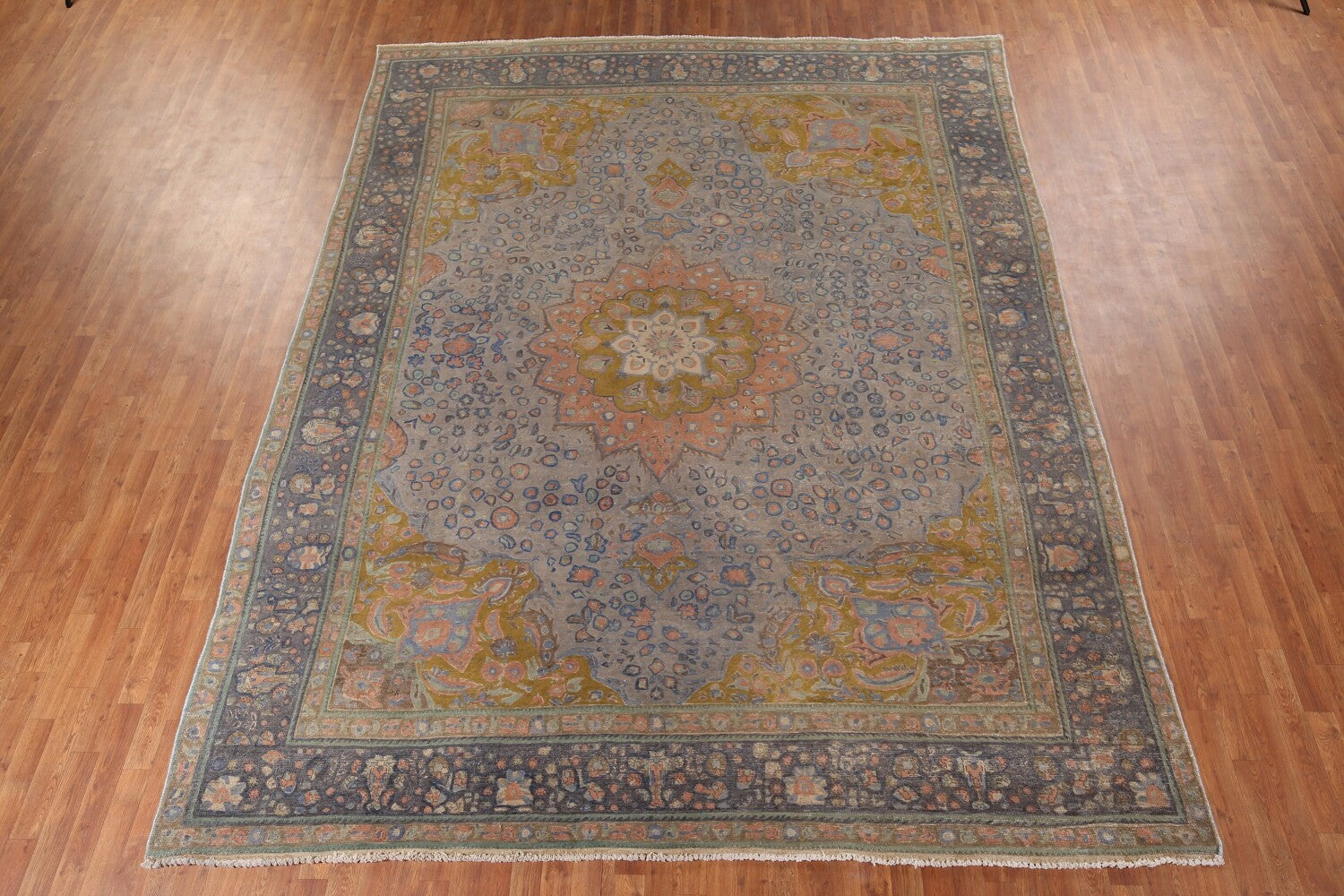 A Beautiful Genuine Persia ( Persia ) Tabriz rug is Hand Knotted by skillful weavers in Persia ( Persia ) with 100% Wool Material. This rug is in Very Good (Evenly Low Pile-Repair) condition. dimensions are 12' 10'' X 9' 10'' in foot and 391 X 300 in centimeter. the primary color is Greys & Charcoal.