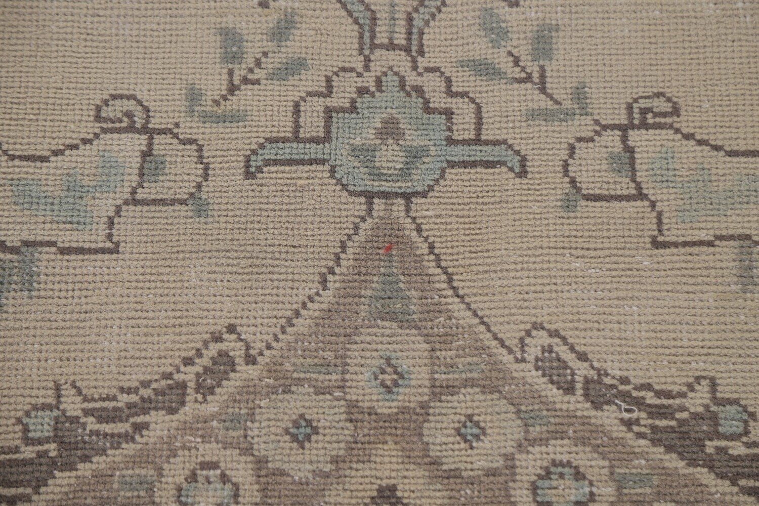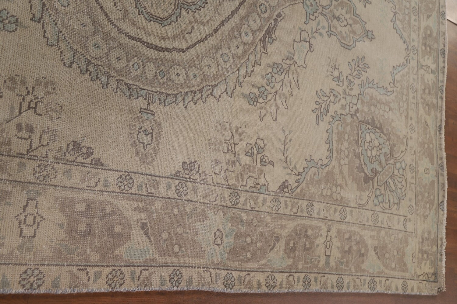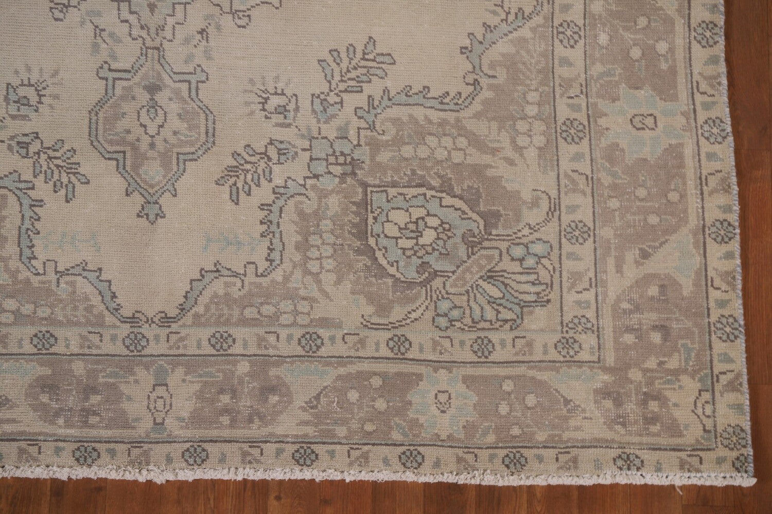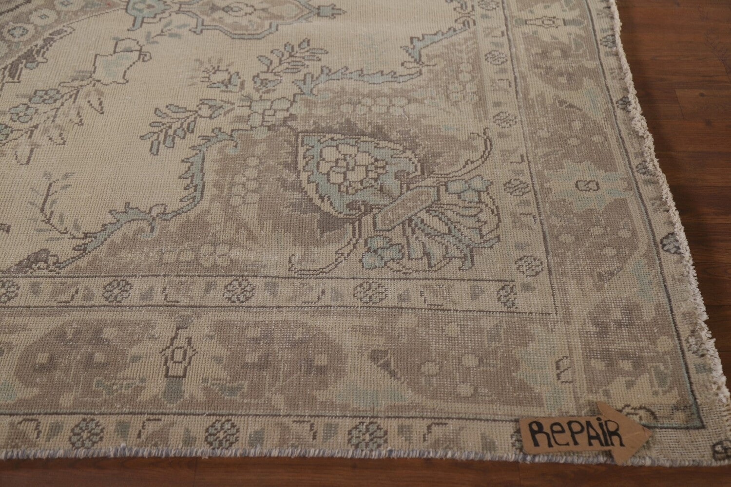 A Beautiful Genuine Persia ( Persia ) Tabriz rug is Hand Knotted by skillful weavers in Persia ( Persia ) with 100% Wool Material. This rug is in Very Good ( Evenly Low Pile-Repair) condition. dimensions are 9' 4'' X 6' 5'' in foot and 284 X 196 in centimeter. the primary color is Beige & Ivories.