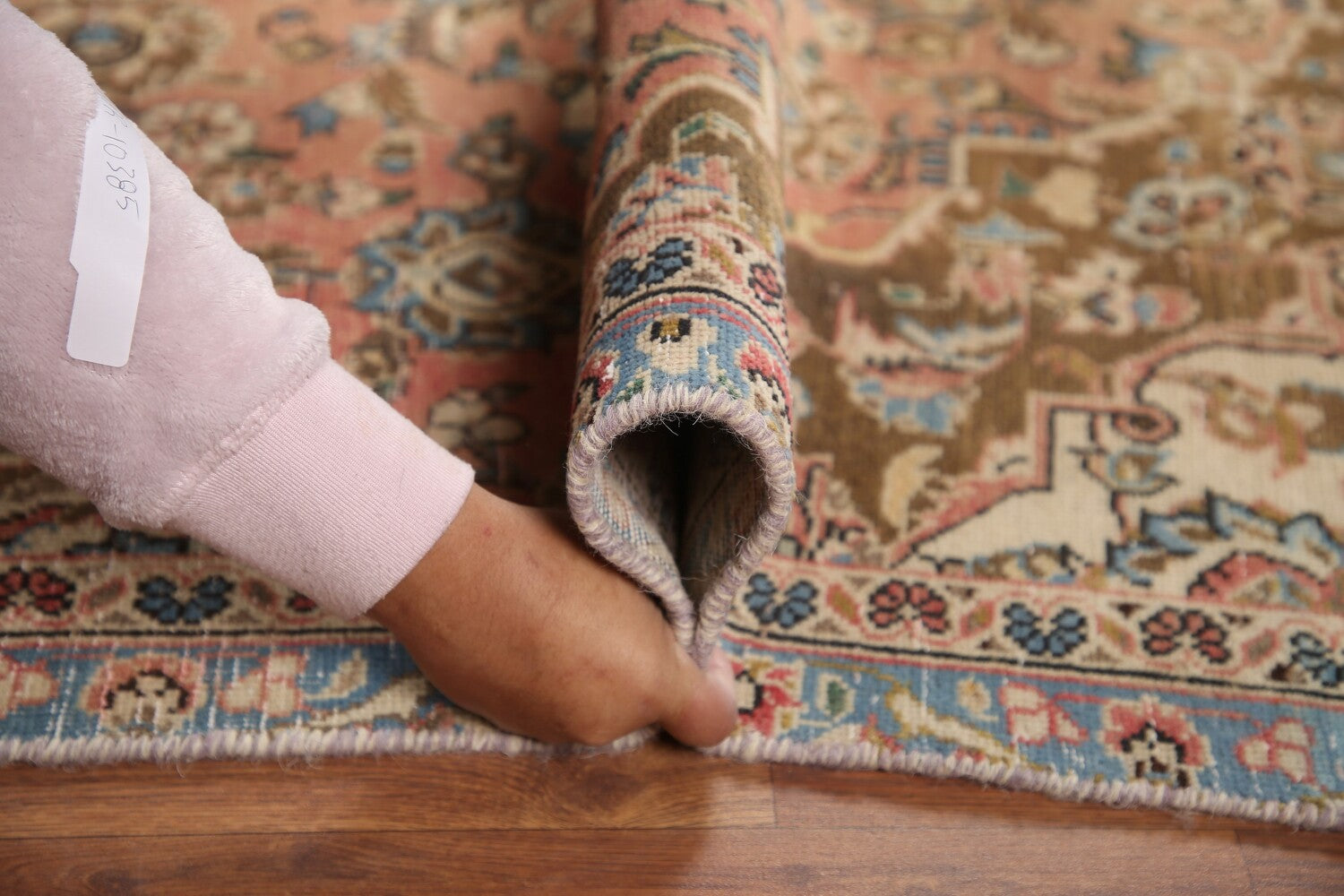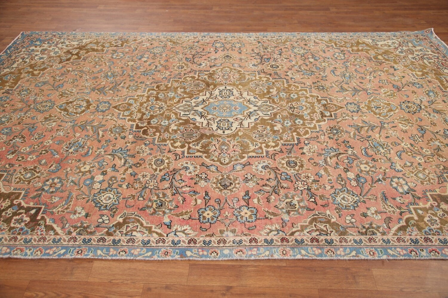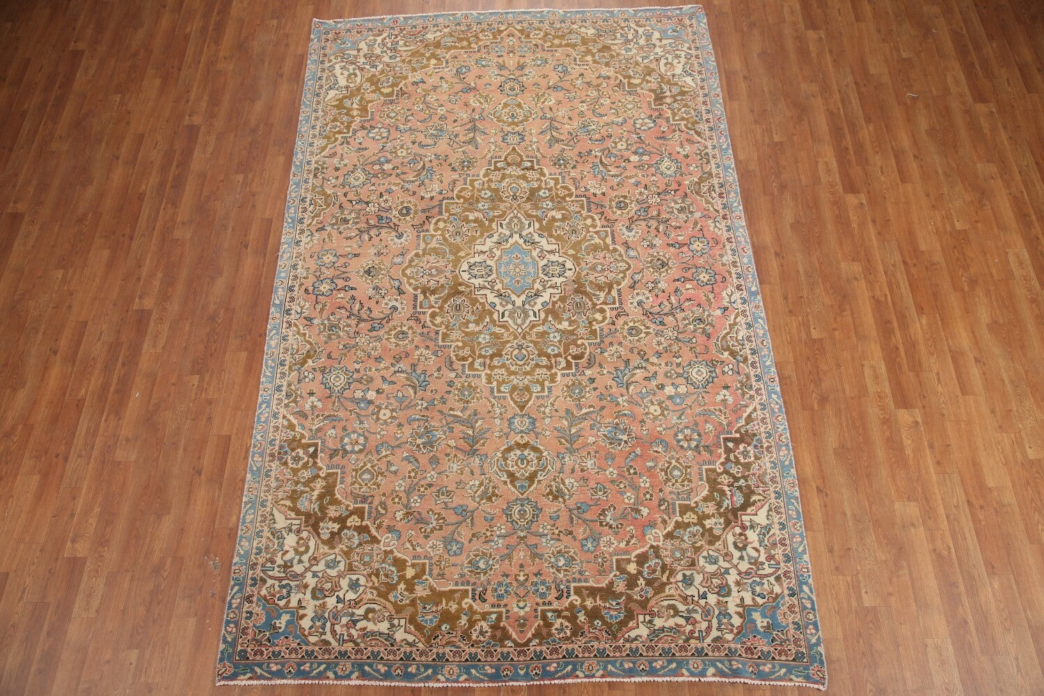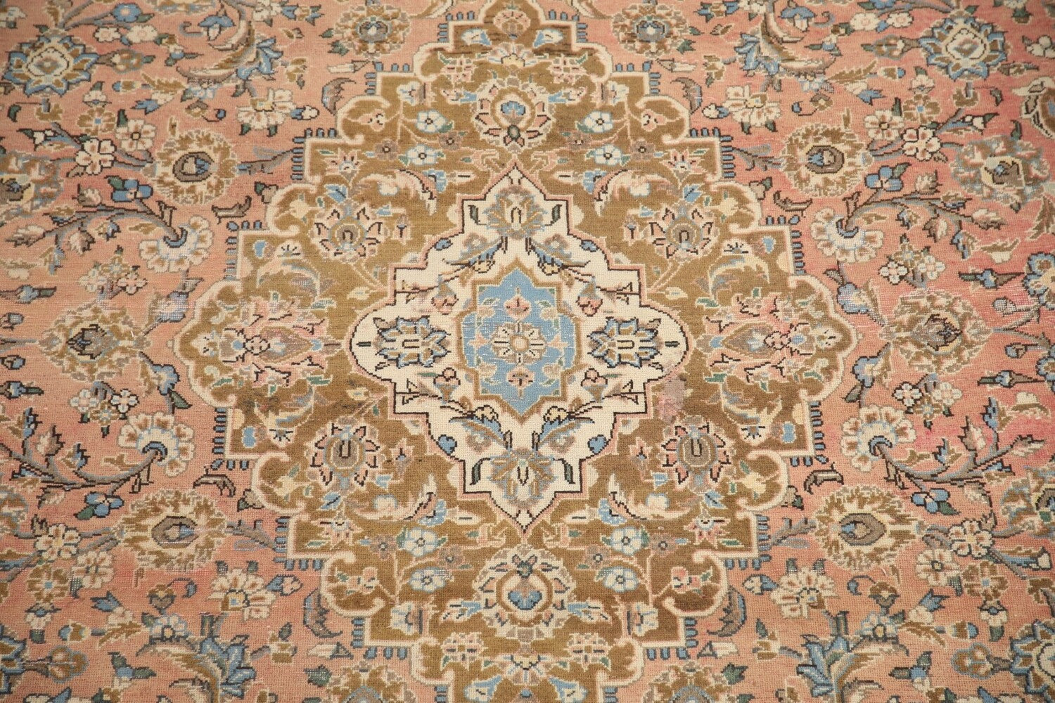 A Beautiful Genuine Persia ( Persia ) Kashan rug is Hand Knotted by skillful weavers in Persia ( Persia ) with 100% Wool Material. This rug is in Very Good (Low Pile) condition. dimensions are 10' 2'' X 6' 4'' in foot and 310 X 193 in centimeter. the primary color is Pink.