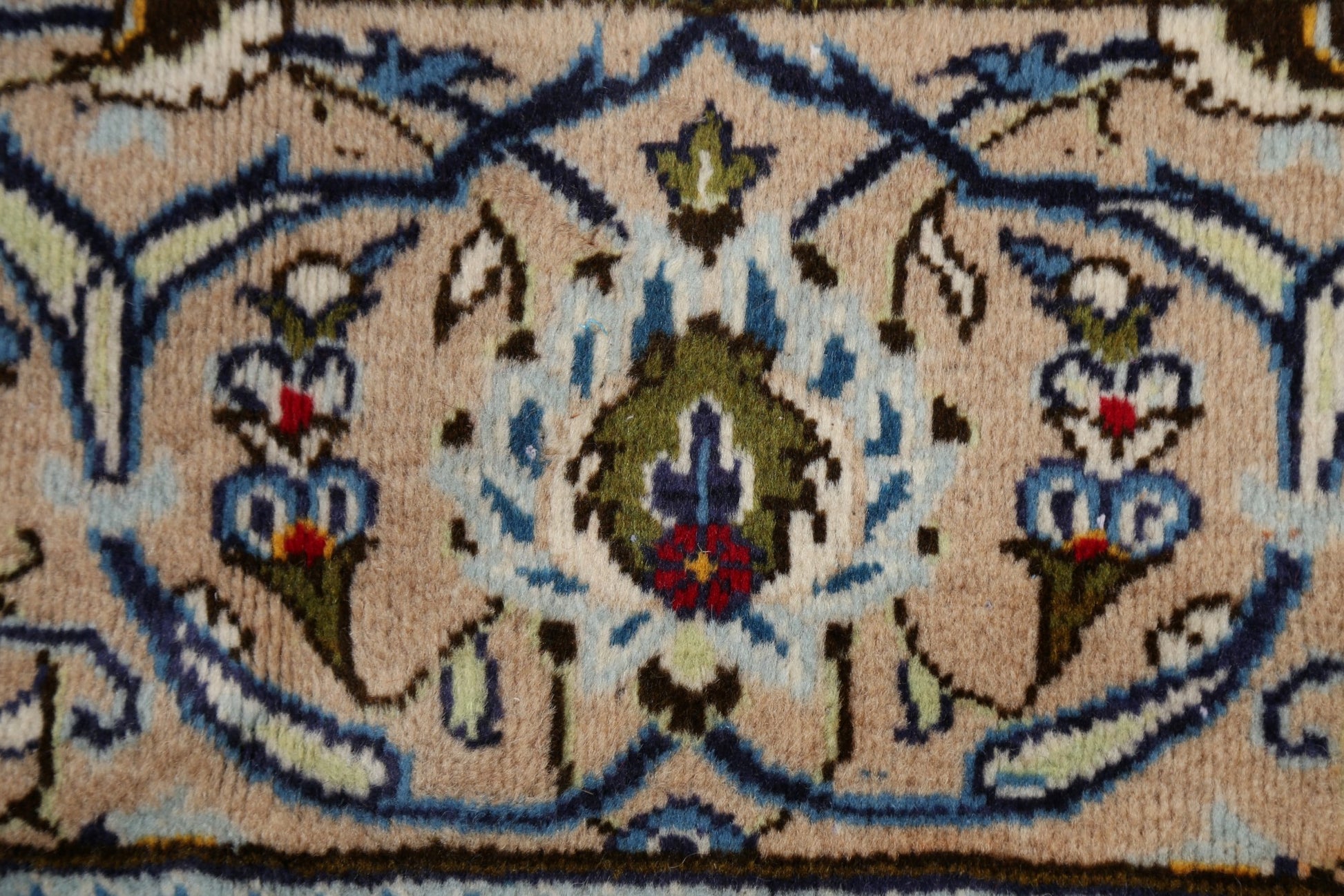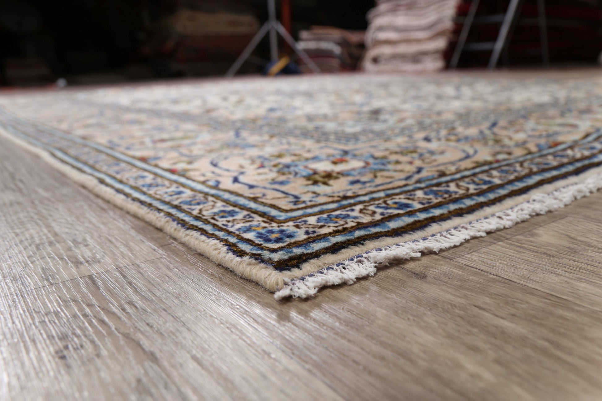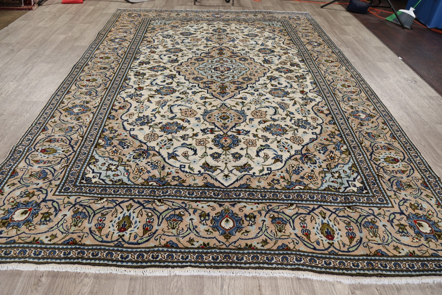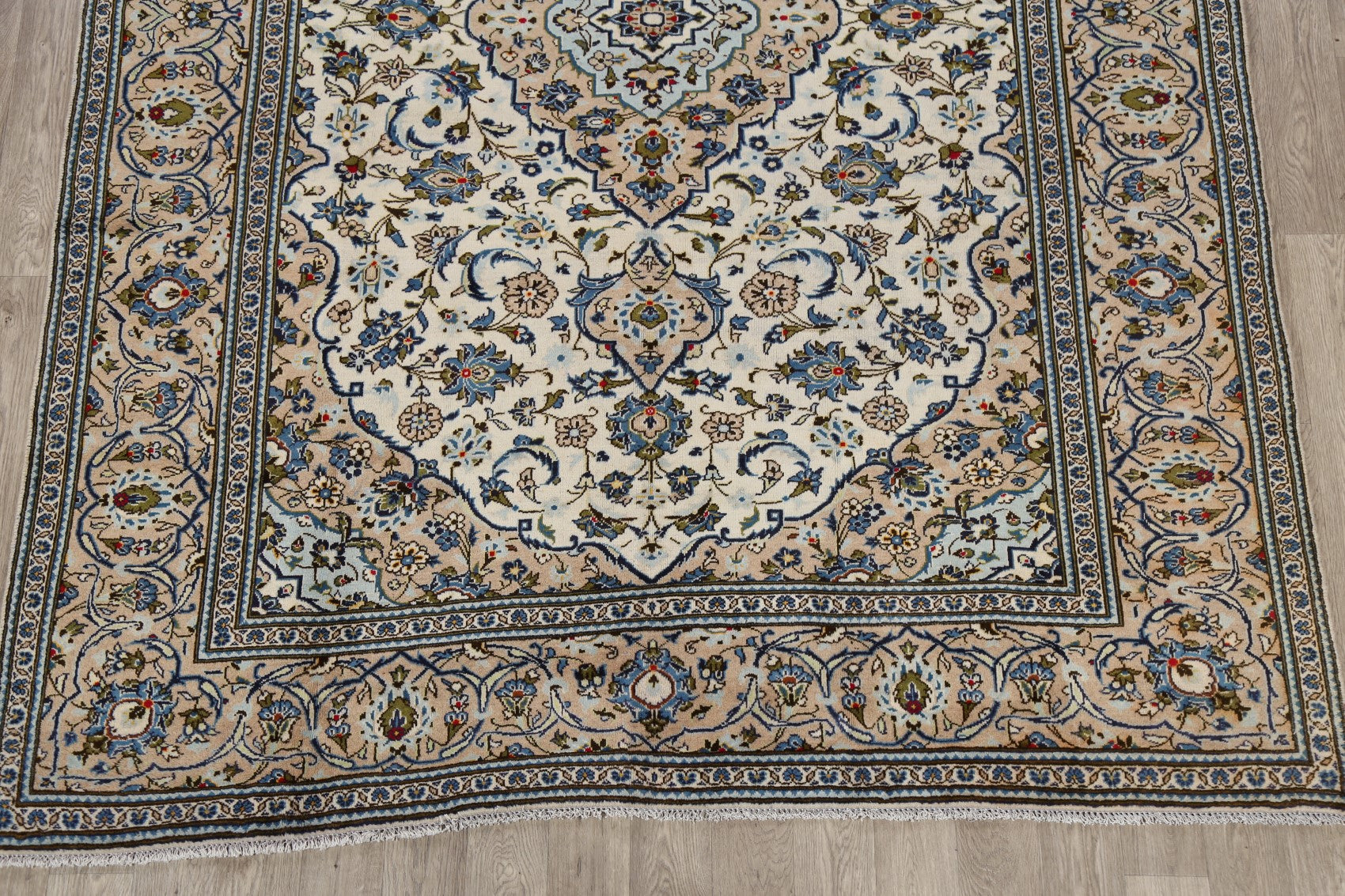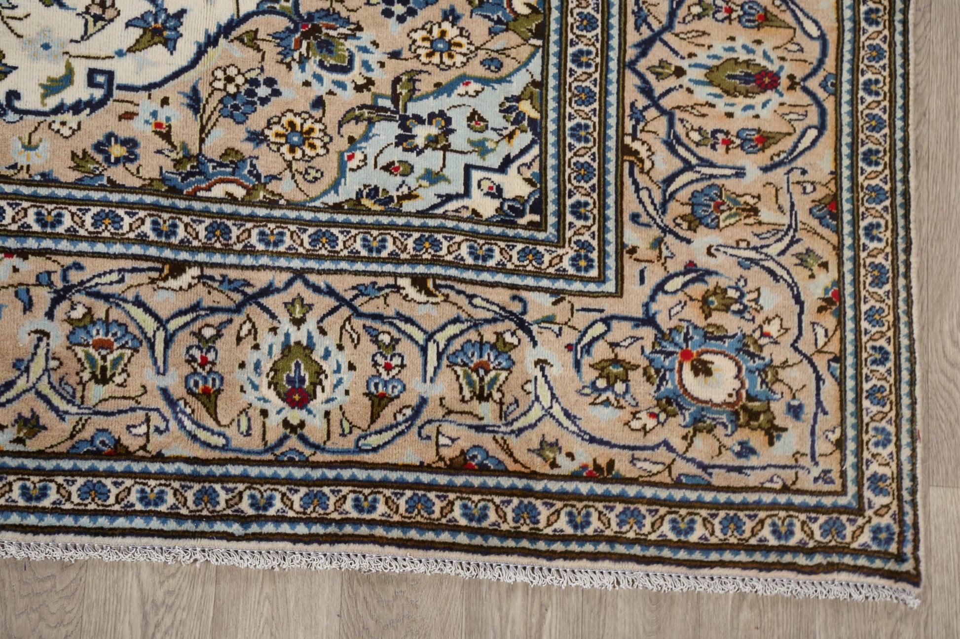 A Beautiful Genuine Persia ( Persia ) Kashan rug is Hand Knotted by skillful weavers in Persia ( Persia ) with 100% Wool Material. This rug is in Very Good (Evenly Low Pile) condition. dimensions are 11' 2'' X 7' 11'' in foot and 340 X 241 in centimeter. the primary color is Beige & Ivories.