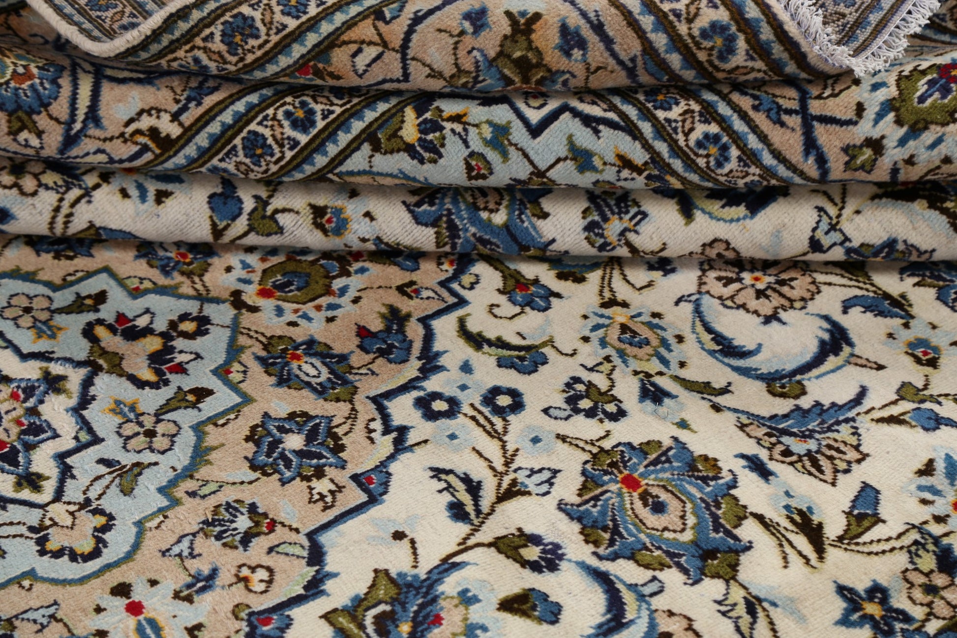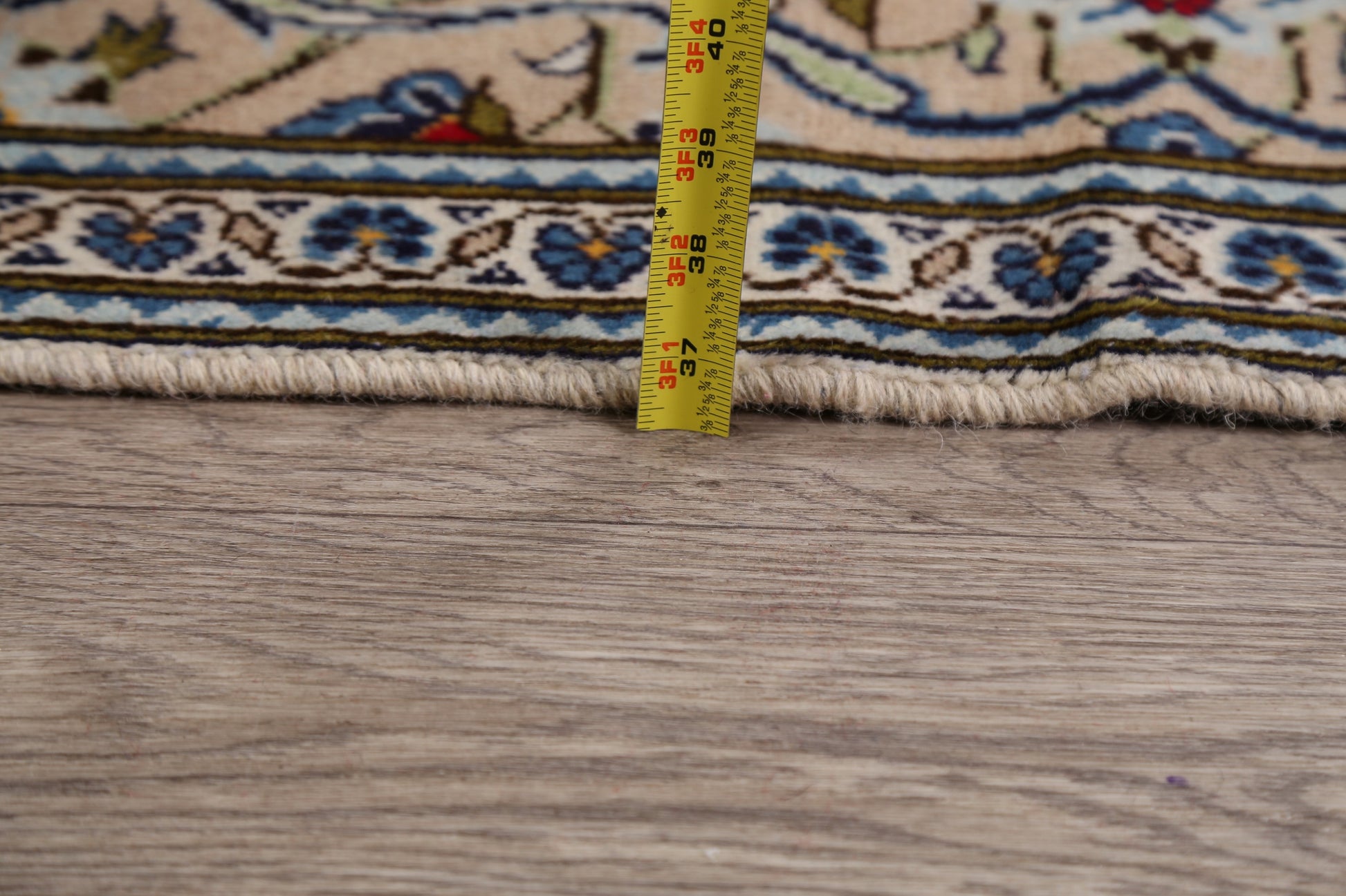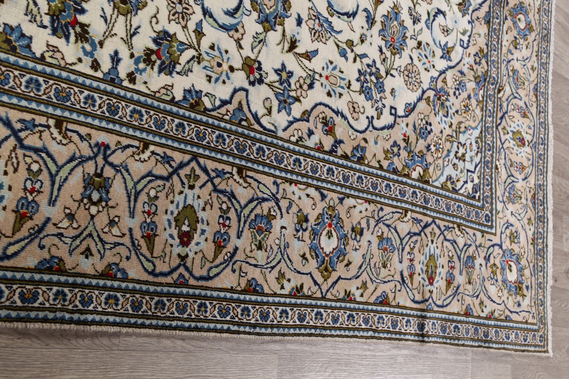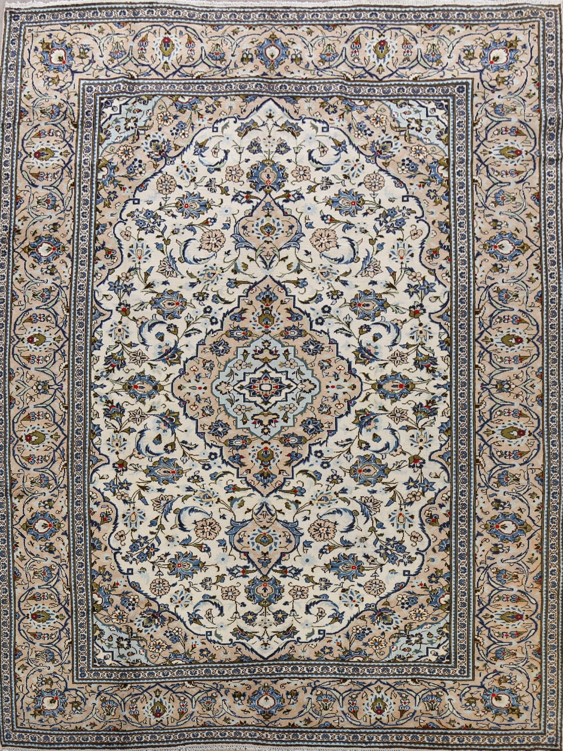 A Beautiful Genuine Persia ( Persia ) Kashan rug is Hand Knotted by skillful weavers in Persia ( Persia ) with 100% Wool Material. This rug is in Very Good (Evenly Low Pile) condition. dimensions are 11' 2'' X 7' 11'' in foot and 340 X 241 in centimeter. the primary color is Beige & Ivories.