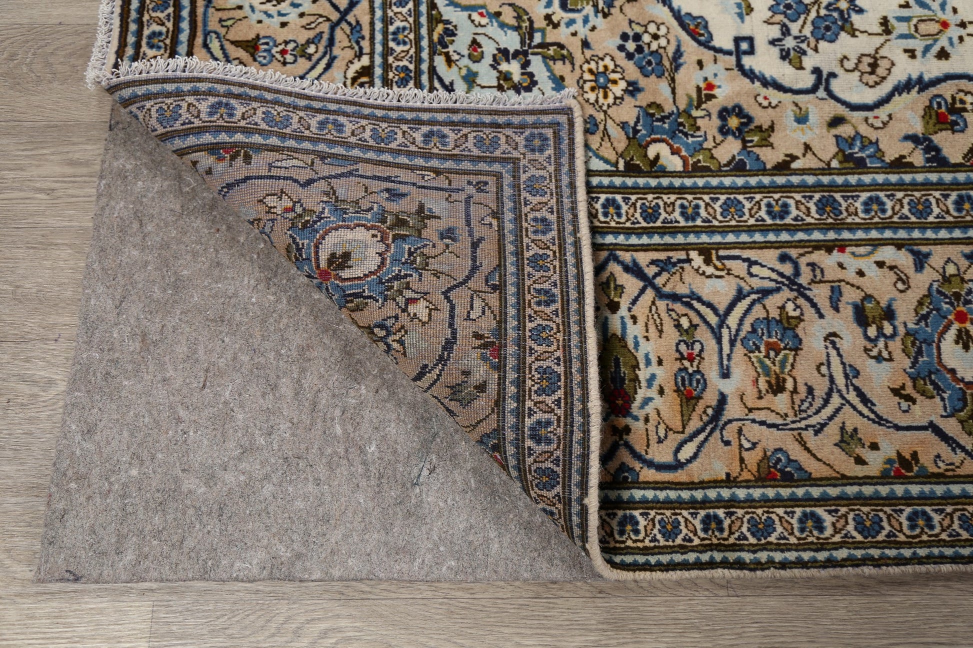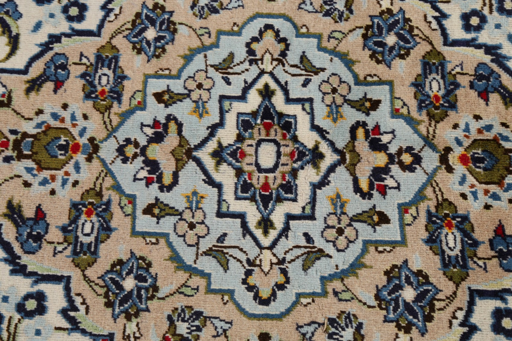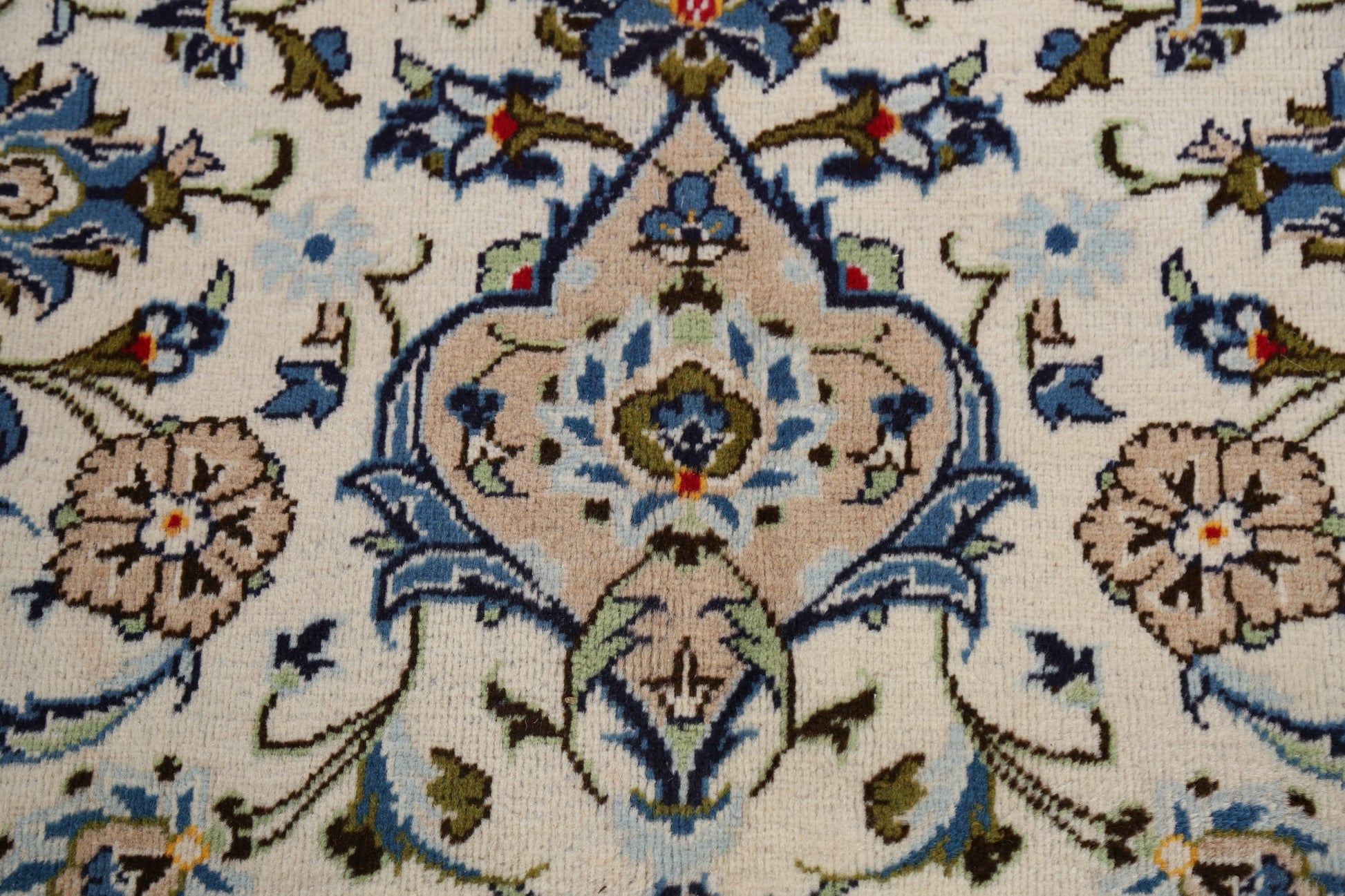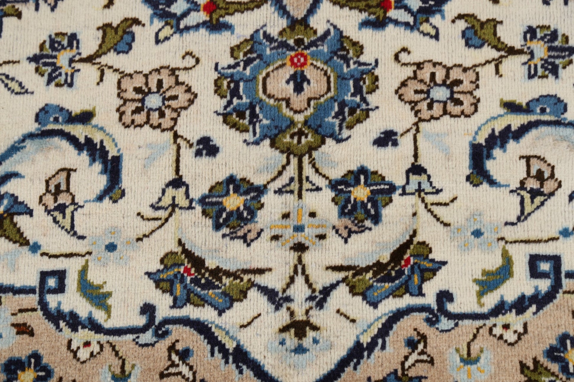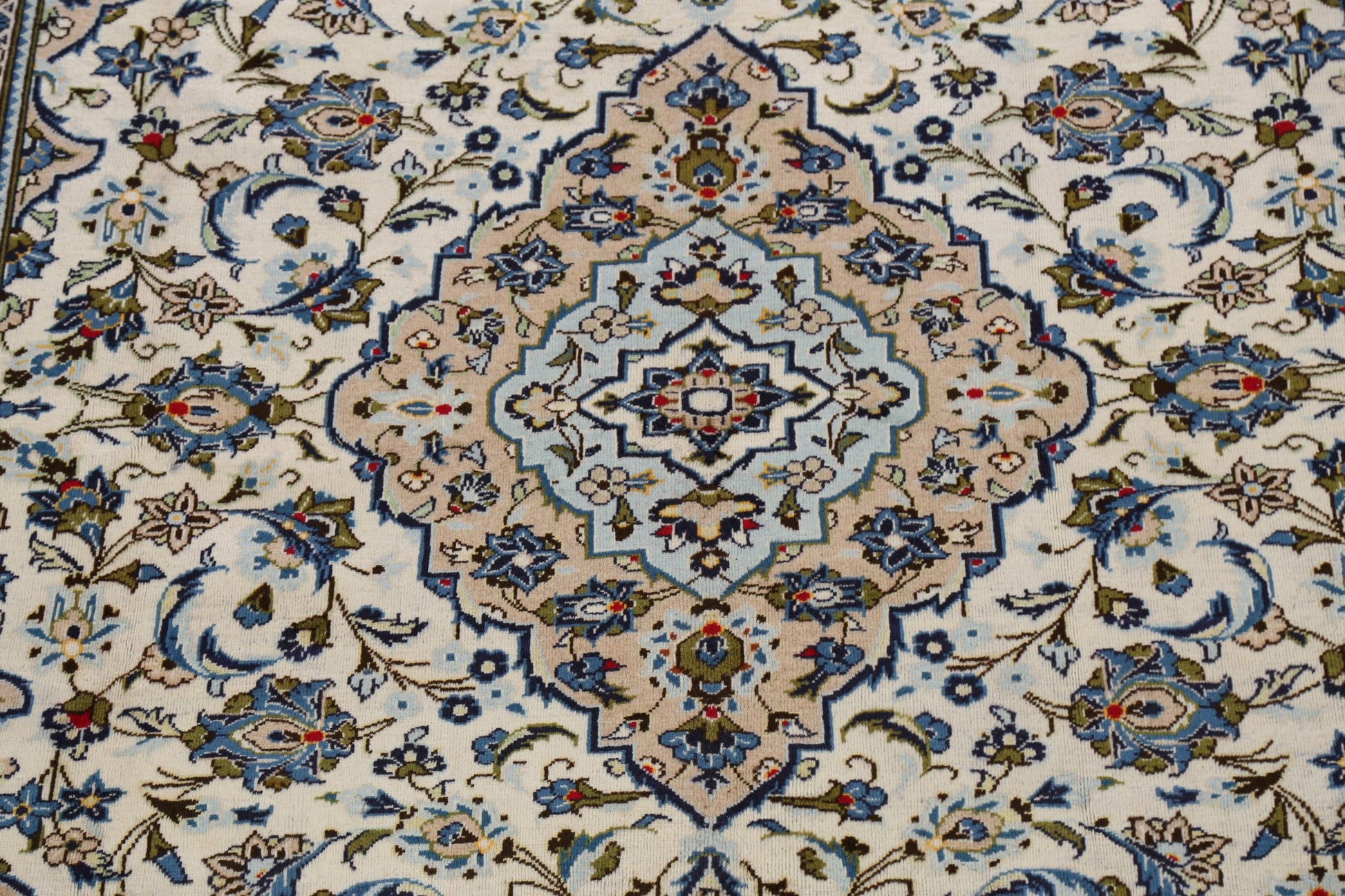 A Beautiful Genuine Persia ( Persia ) Kashan rug is Hand Knotted by skillful weavers in Persia ( Persia ) with 100% Wool Material. This rug is in Very Good (Evenly Low Pile) condition. dimensions are 11' 2'' X 7' 11'' in foot and 340 X 241 in centimeter. the primary color is Beige & Ivories.
