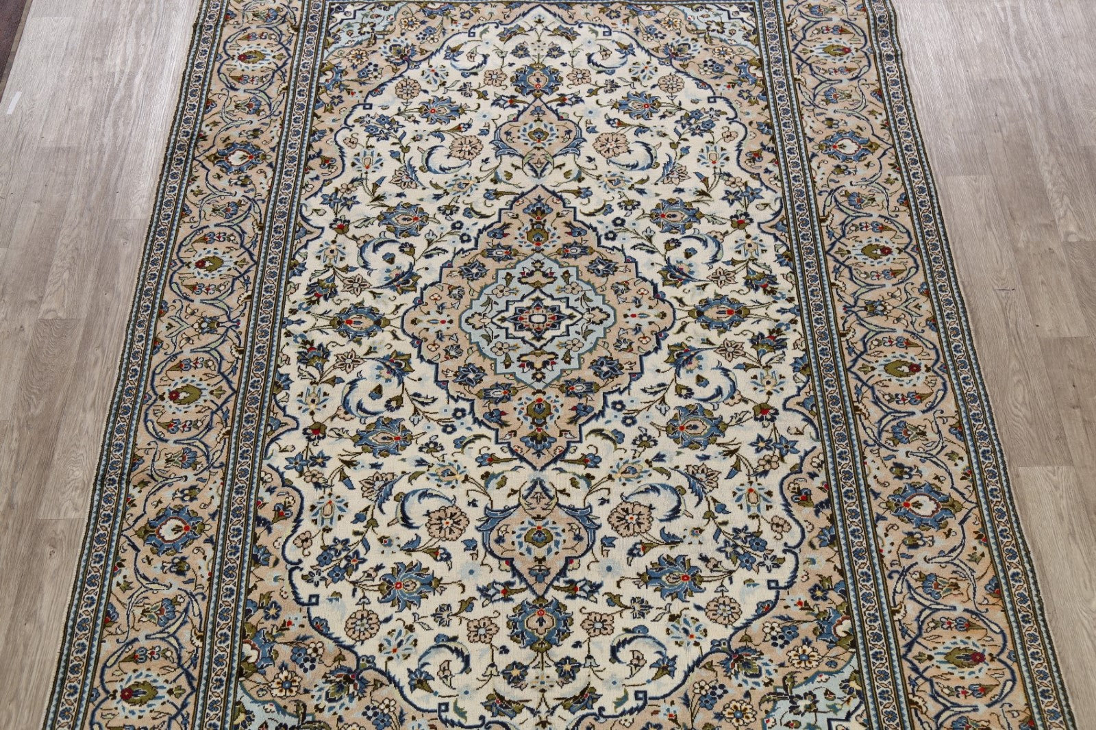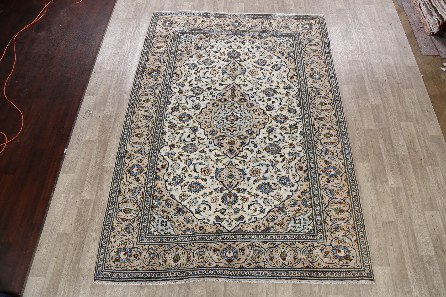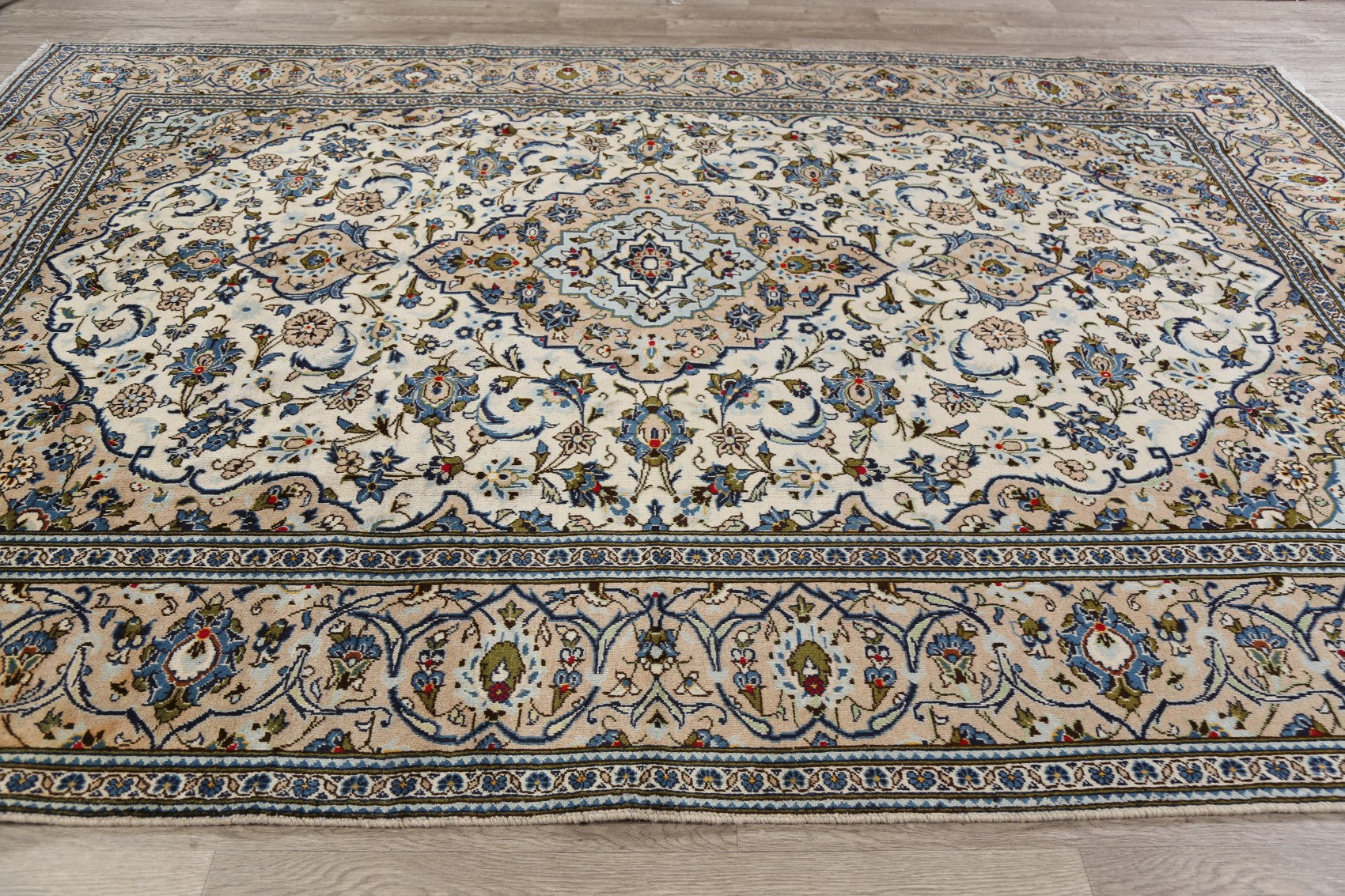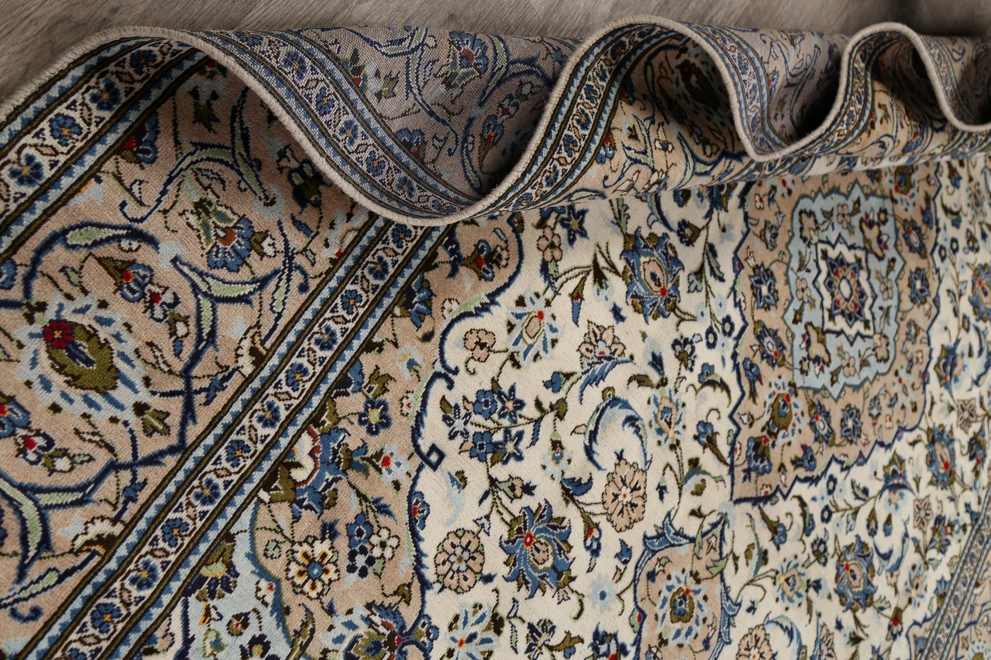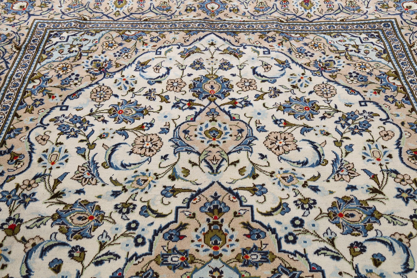 A Beautiful Genuine Persia ( Persia ) Kashan rug is Hand Knotted by skillful weavers in Persia ( Persia ) with 100% Wool Material. This rug is in Very Good (Evenly Low Pile) condition. dimensions are 11' 2'' X 7' 11'' in foot and 340 X 241 in centimeter. the primary color is Beige & Ivories.