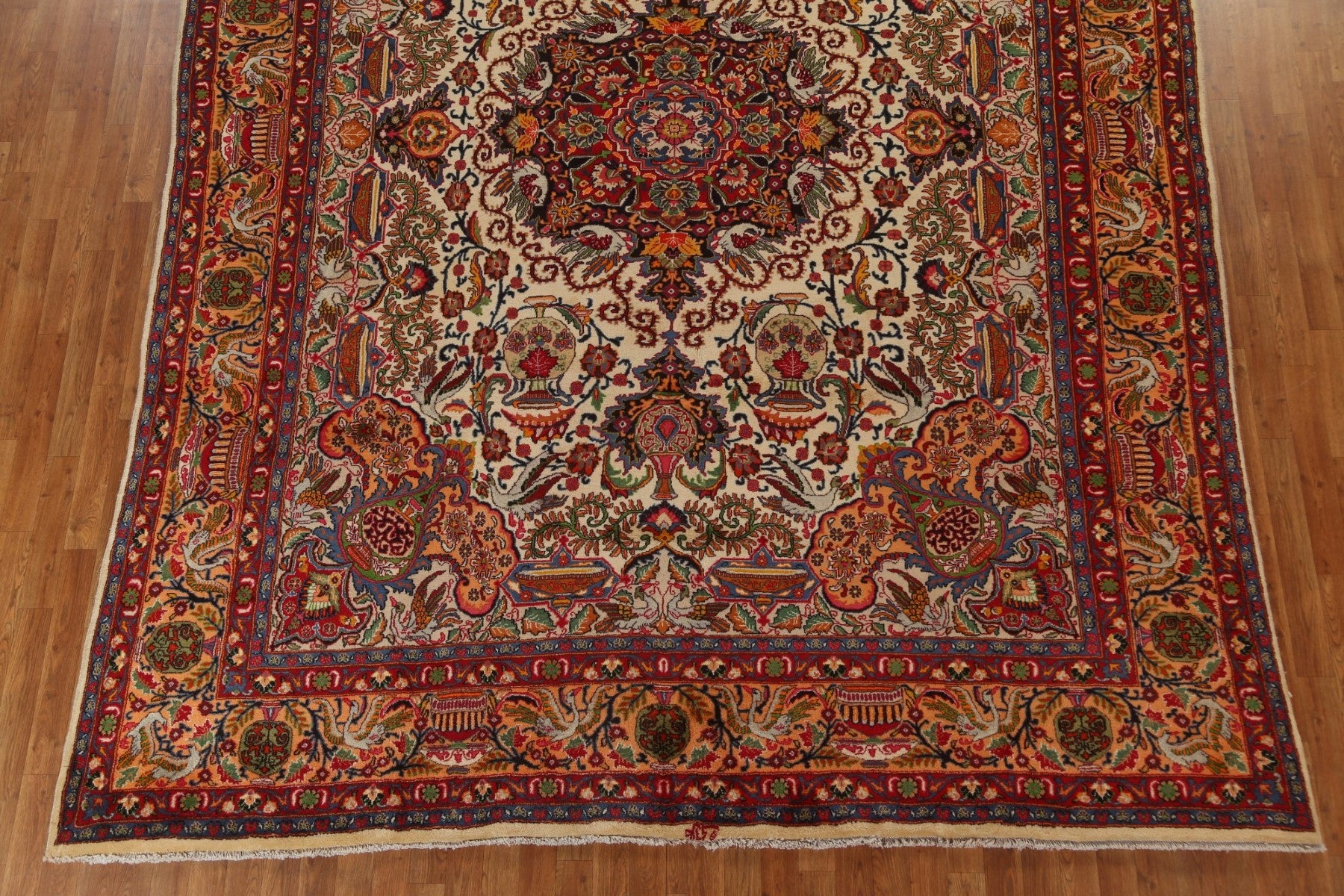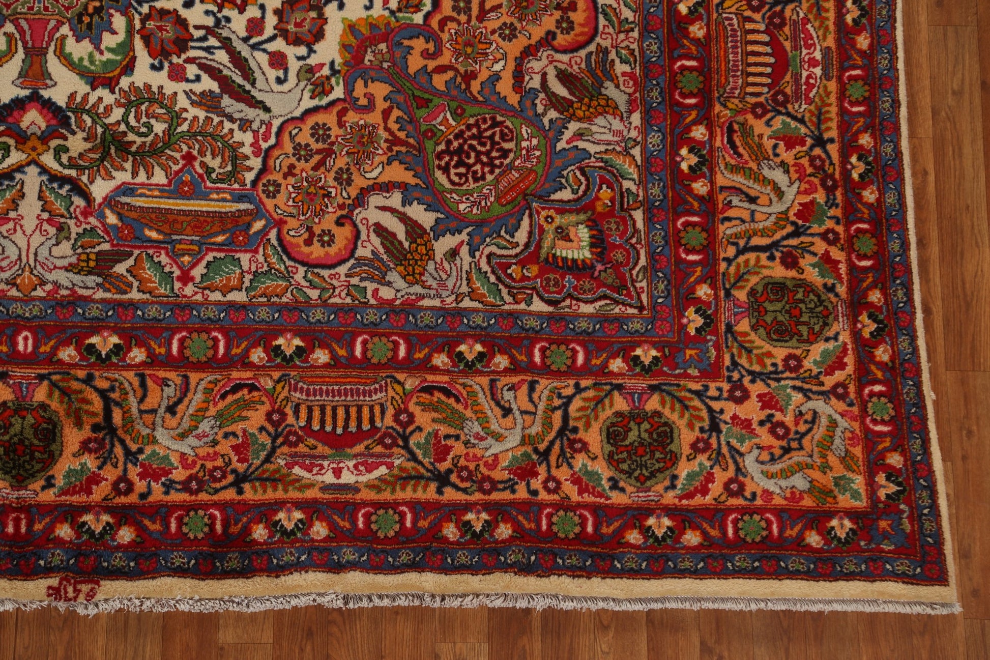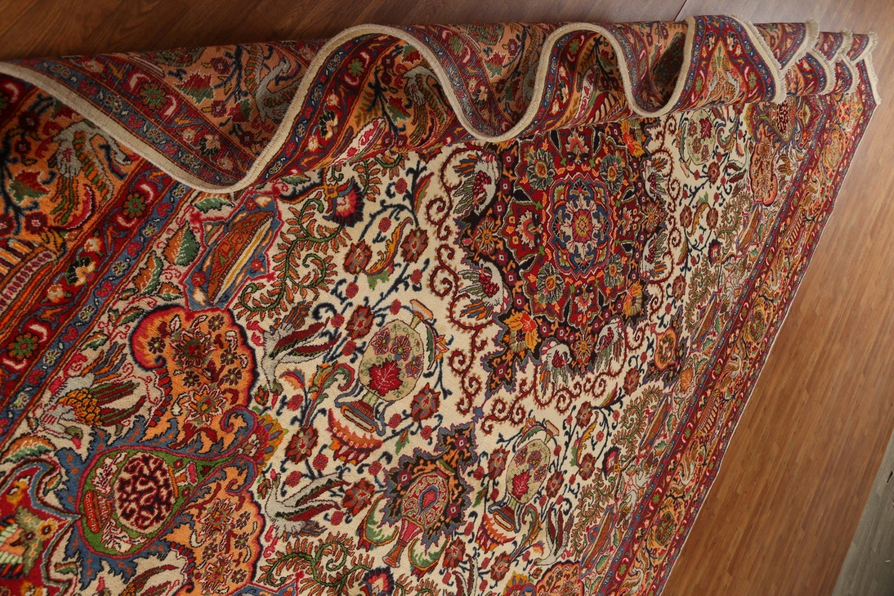 A Beautiful Genuine Persia ( Persia ) Kashmar rug is Hand Knotted by skillful weavers in Persia ( Persia ) with 100% Wool Material. This rug is in Very Good condition. dimensions are 12' 7'' X 9' 8'' in foot and 384 X 295 in centimeter. the primary color is Beige & Ivories.