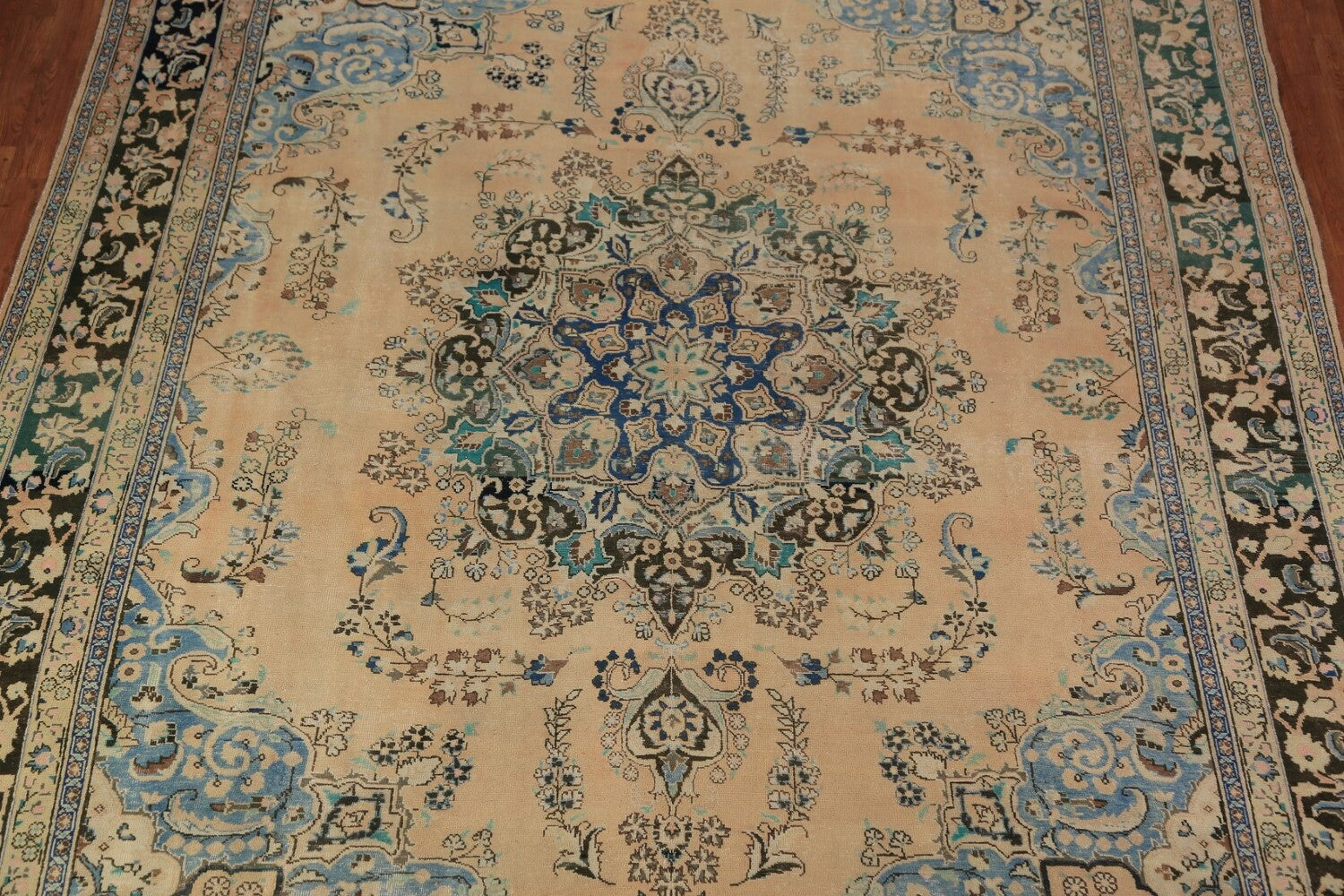 A Beautiful Genuine Persia ( Persia ) Mashad rug is Hand Knotted by skillful weavers in Persia ( Persia ) with 100% Wool Material. This rug is in Very Good (Evenly Low Pile) condition. dimensions are 12' 6'' X 9' 9'' in foot and 381 X 297 in centimeter. the primary color is Peach.