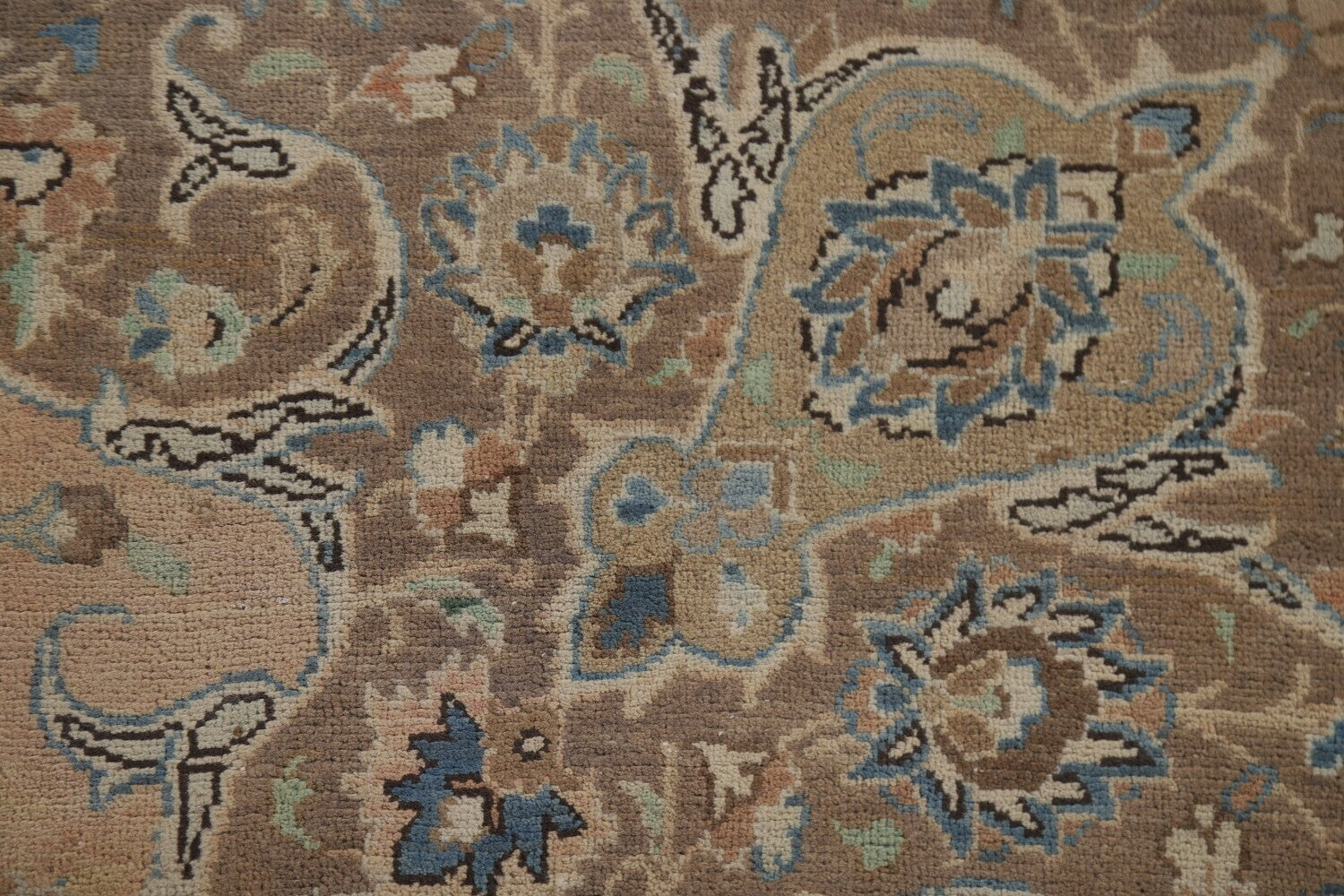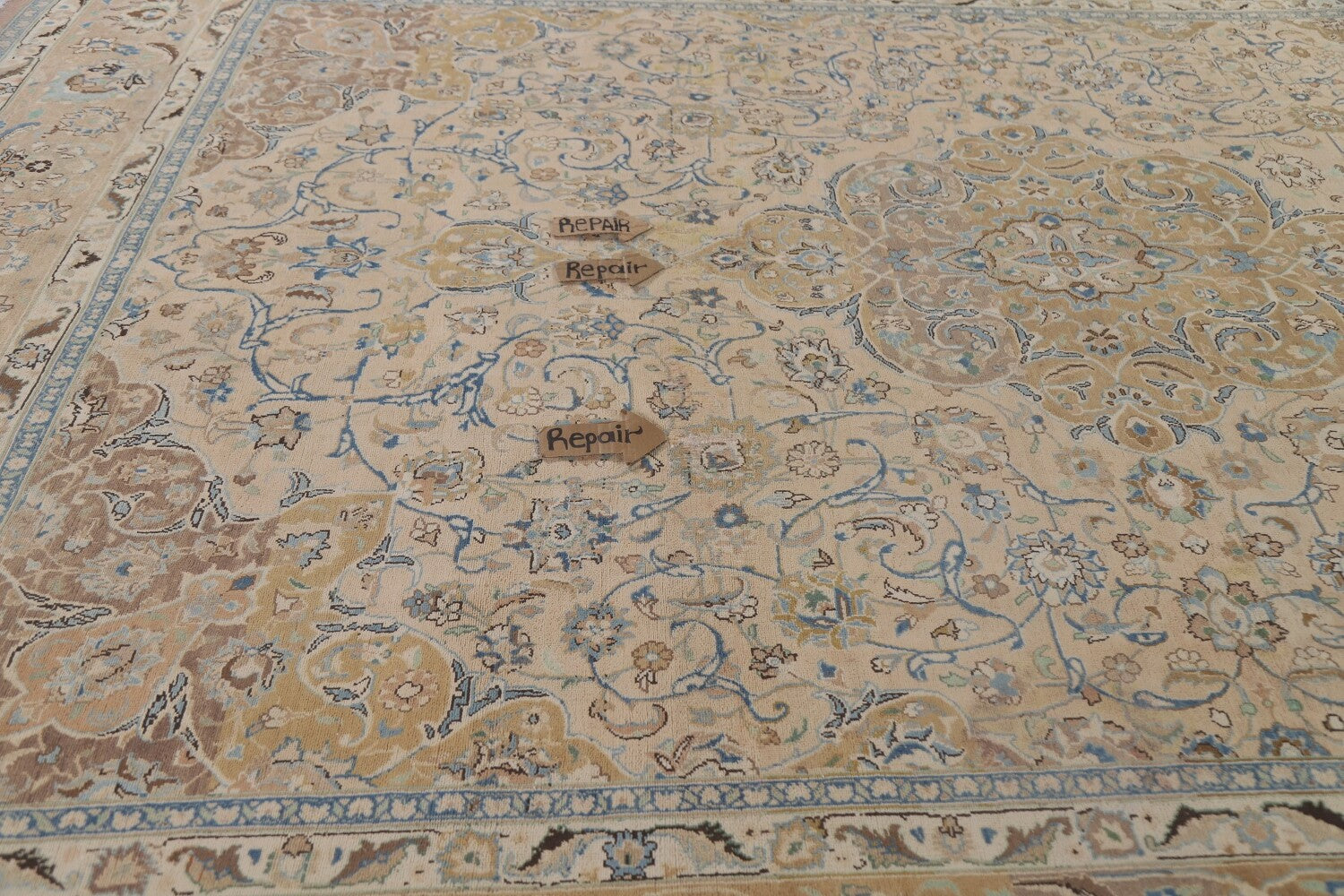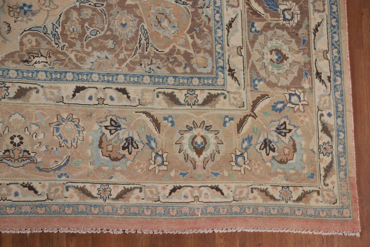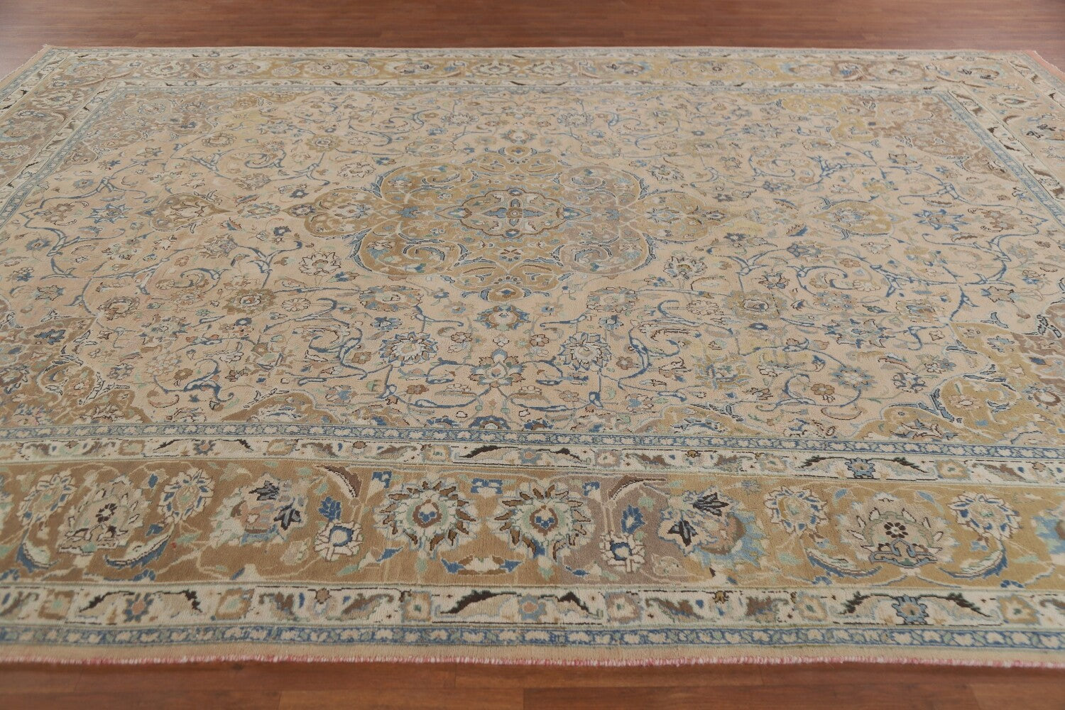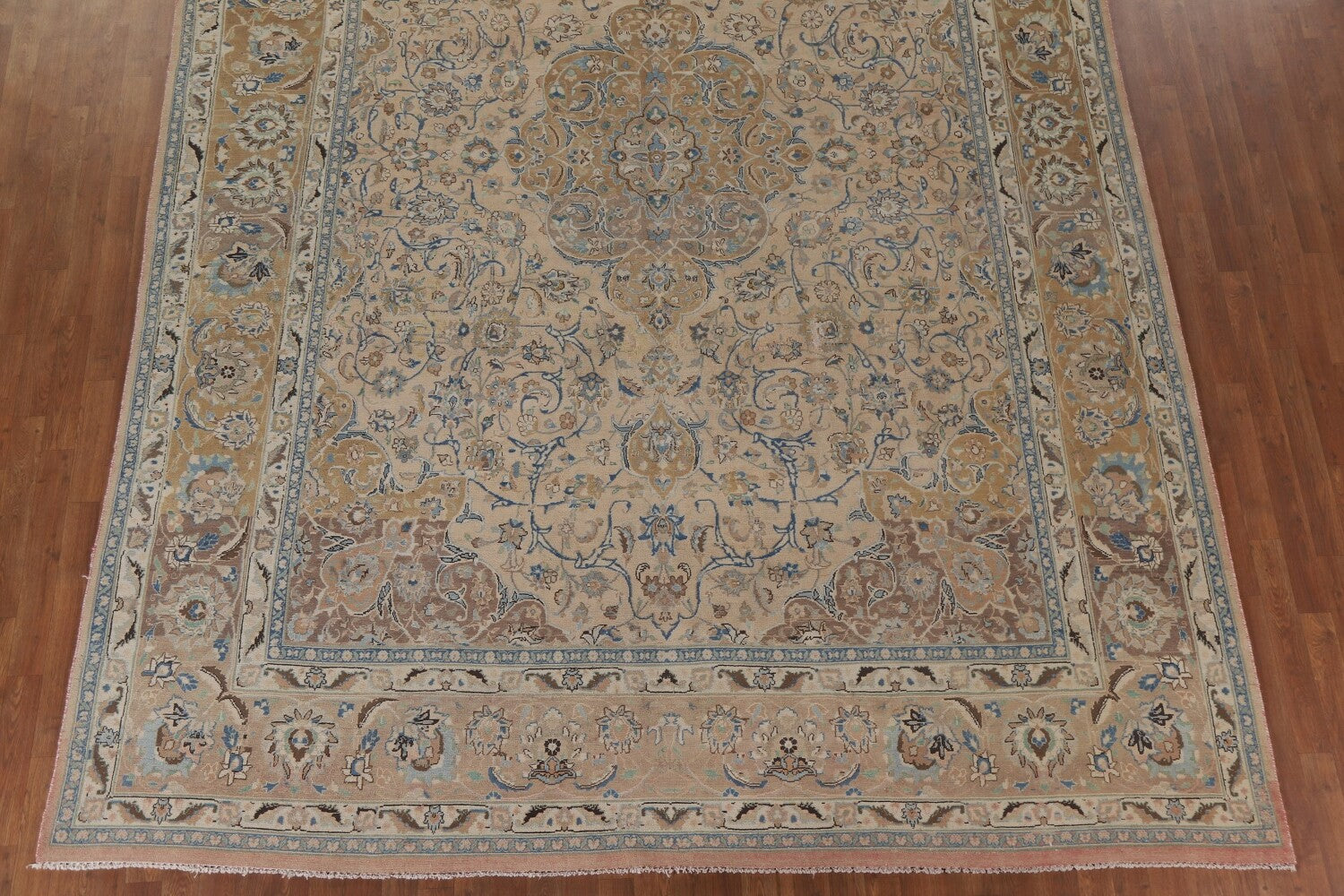 A Beautiful Genuine Persia ( Persia ) Mashad rug is Hand Knotted by skillful weavers in Persia ( Persia ) with 100% Wool Material. This rug is in Very Good (Evenly Low Pile-Repair) condition. dimensions are 12' 5'' X 9' 4'' in foot and 378 X 284 in centimeter. the primary color is Peach.