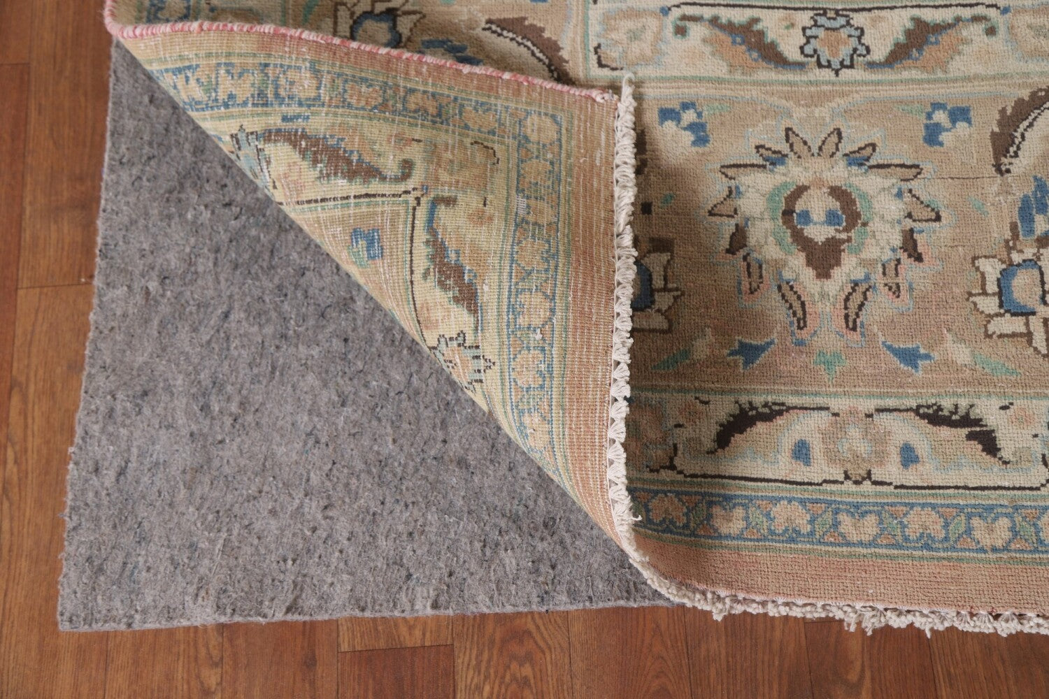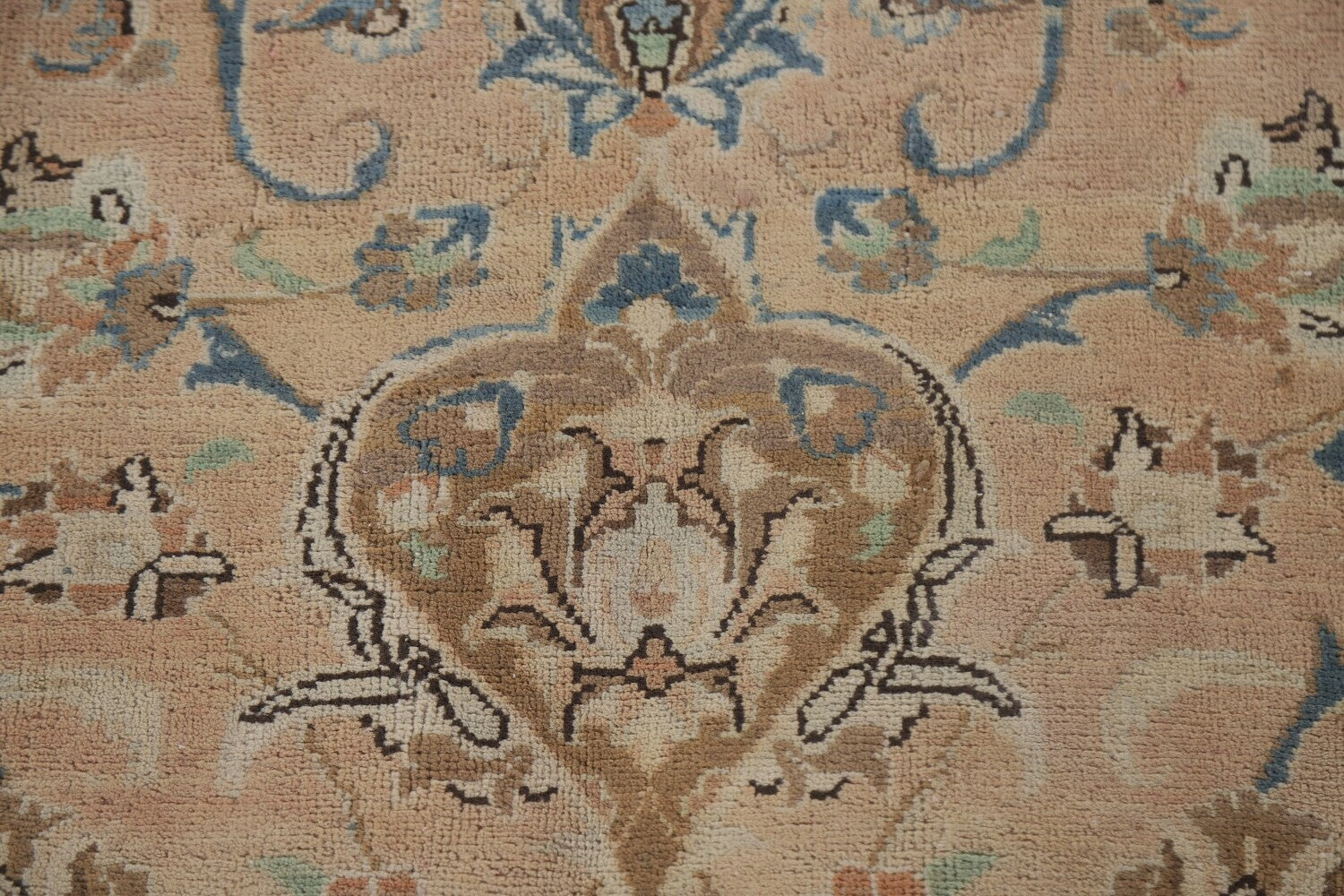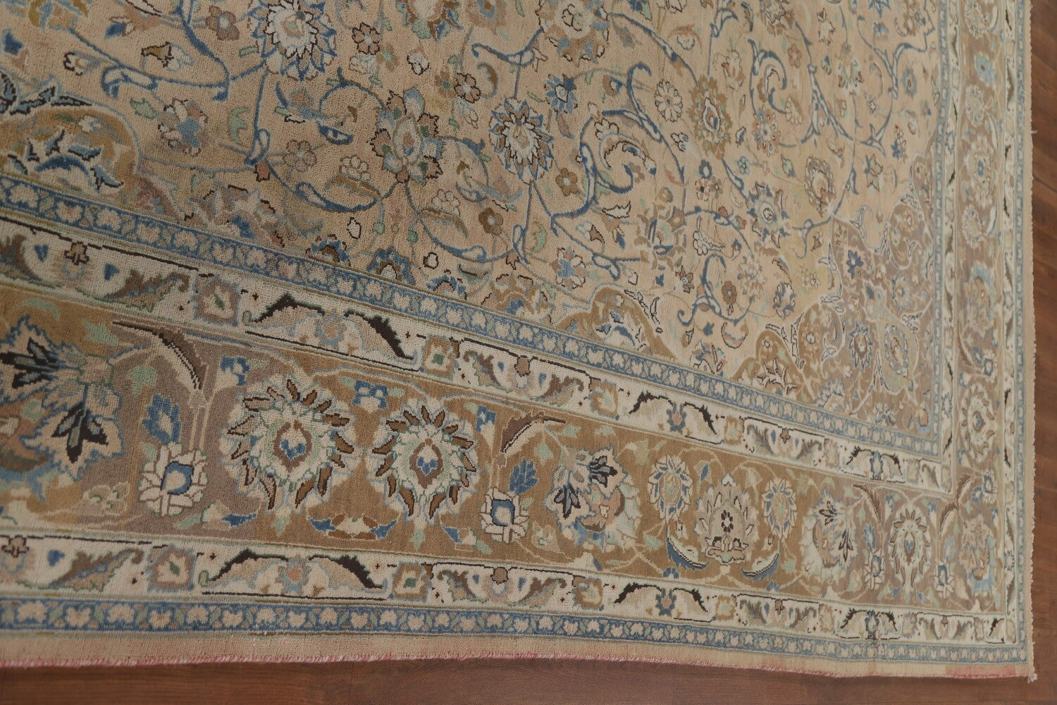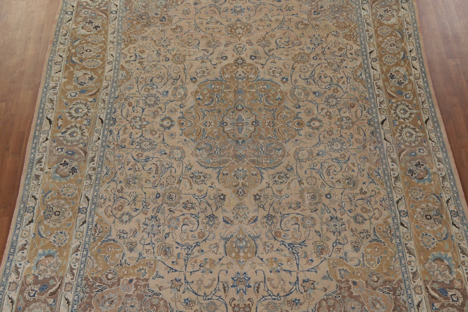 A Beautiful Genuine Persia ( Persia ) Mashad rug is Hand Knotted by skillful weavers in Persia ( Persia ) with 100% Wool Material. This rug is in Very Good (Evenly Low Pile-Repair) condition. dimensions are 12' 5'' X 9' 4'' in foot and 378 X 284 in centimeter. the primary color is Peach.
