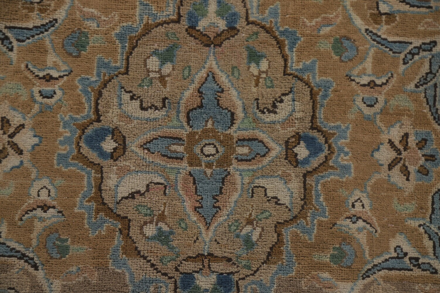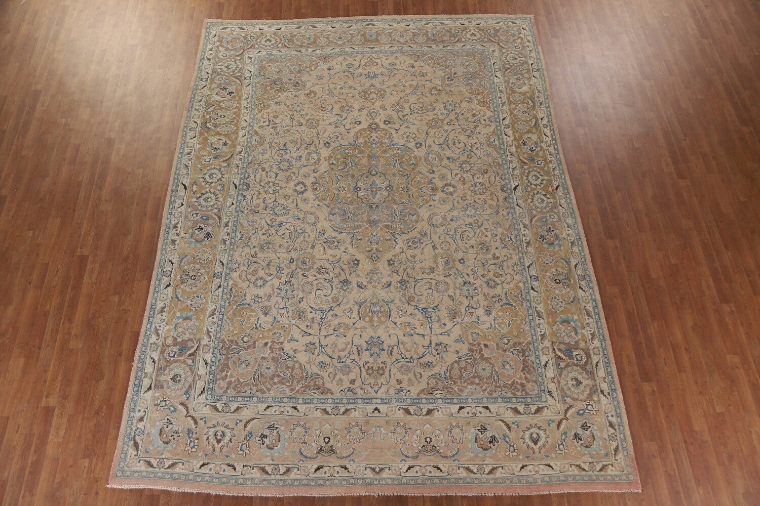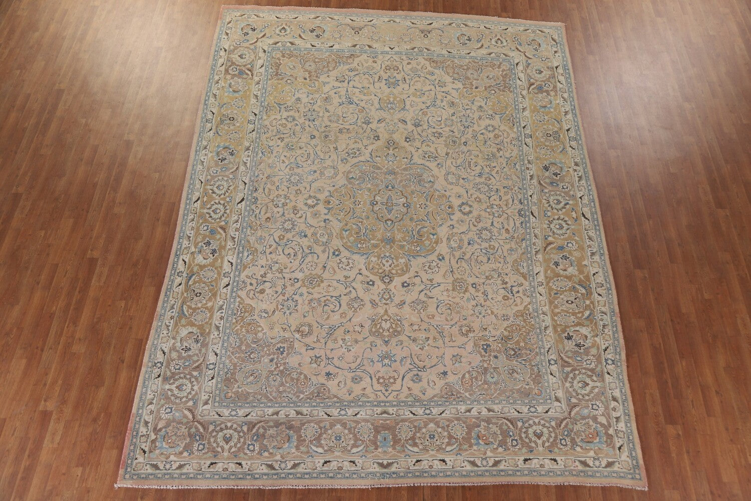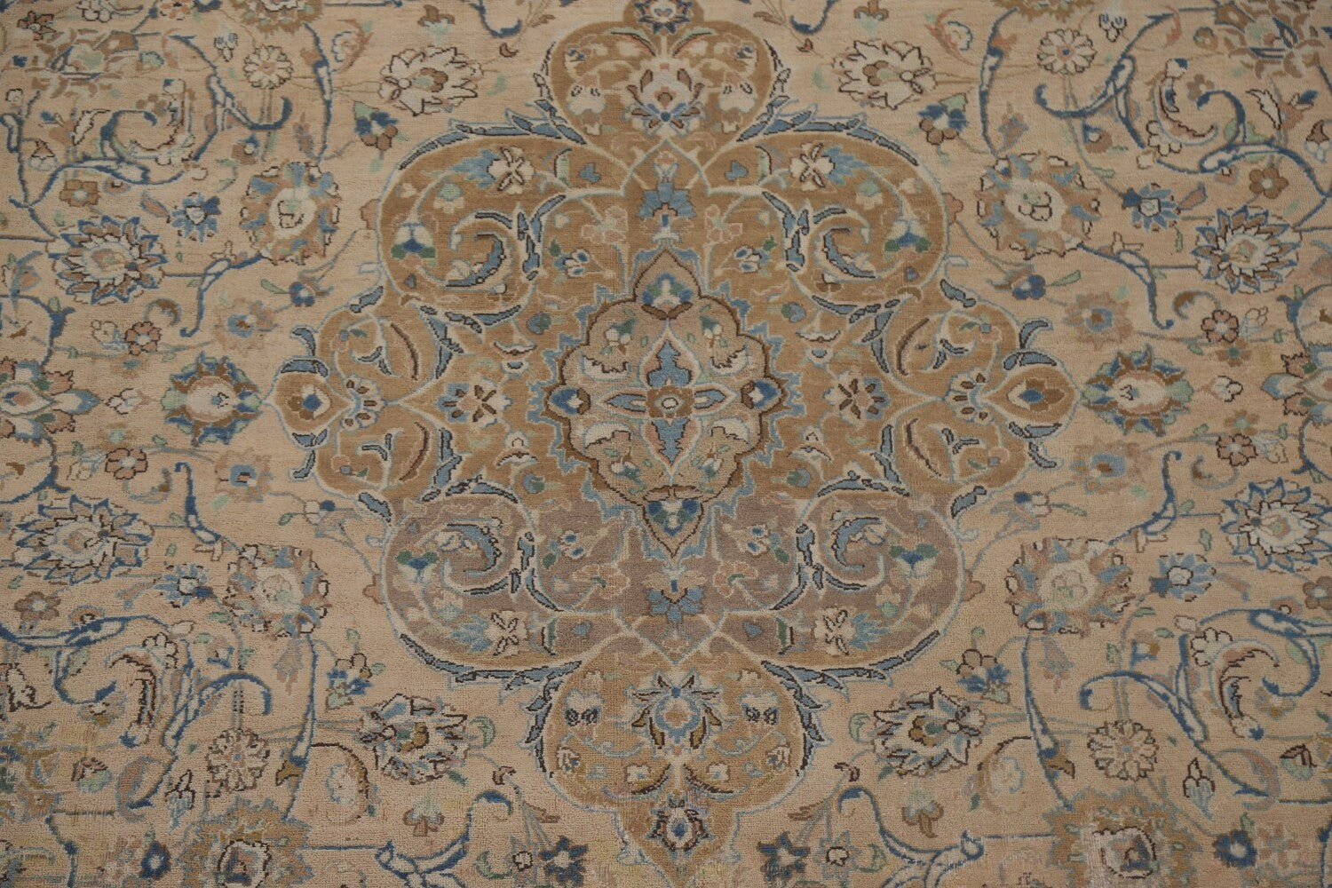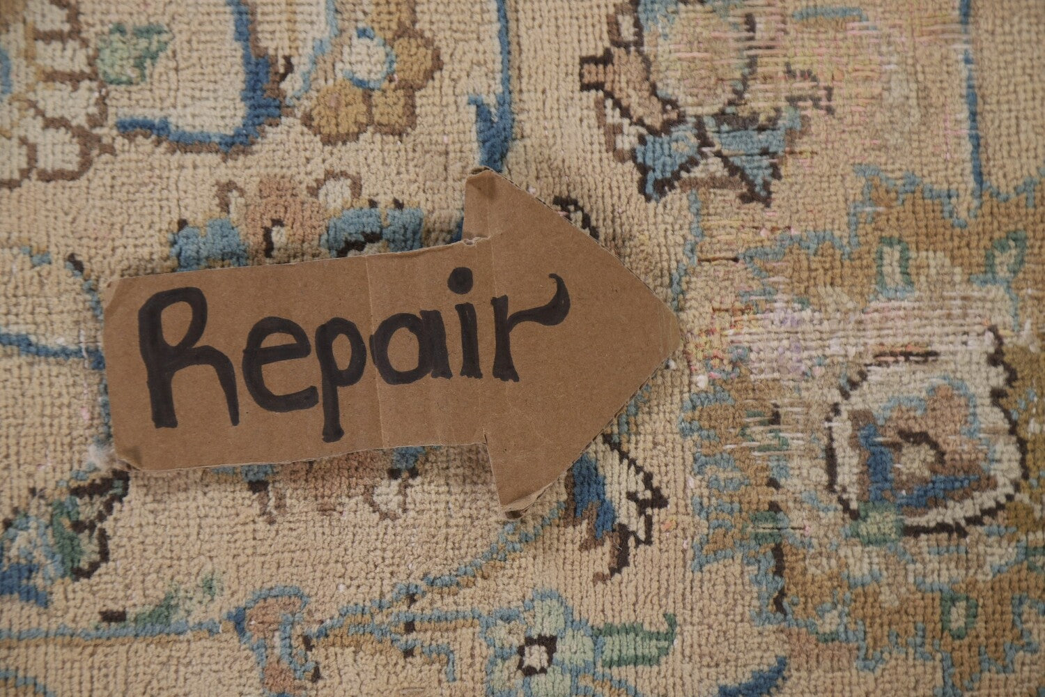 A Beautiful Genuine Persia ( Persia ) Mashad rug is Hand Knotted by skillful weavers in Persia ( Persia ) with 100% Wool Material. This rug is in Very Good (Evenly Low Pile-Repair) condition. dimensions are 12' 5'' X 9' 4'' in foot and 378 X 284 in centimeter. the primary color is Peach.