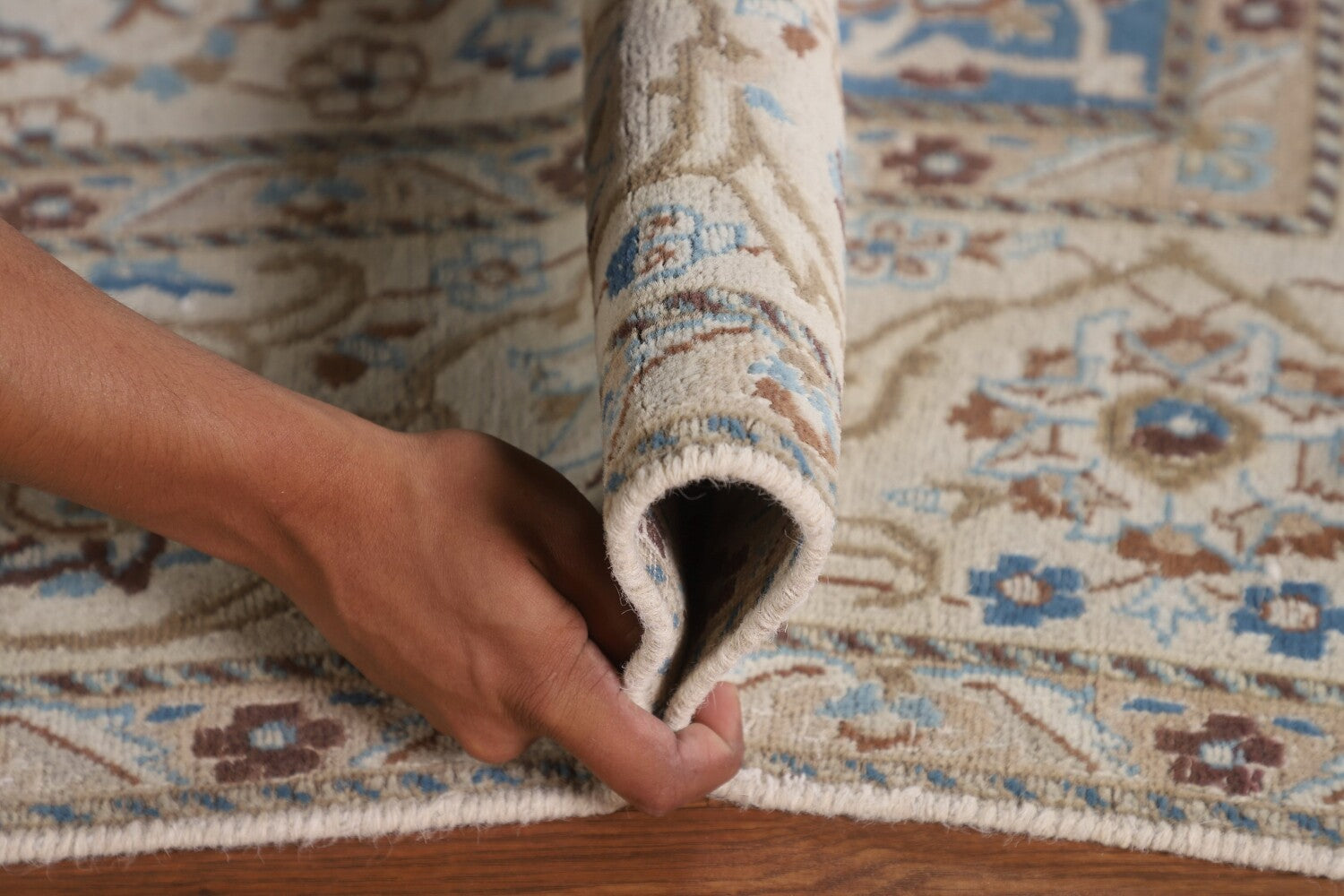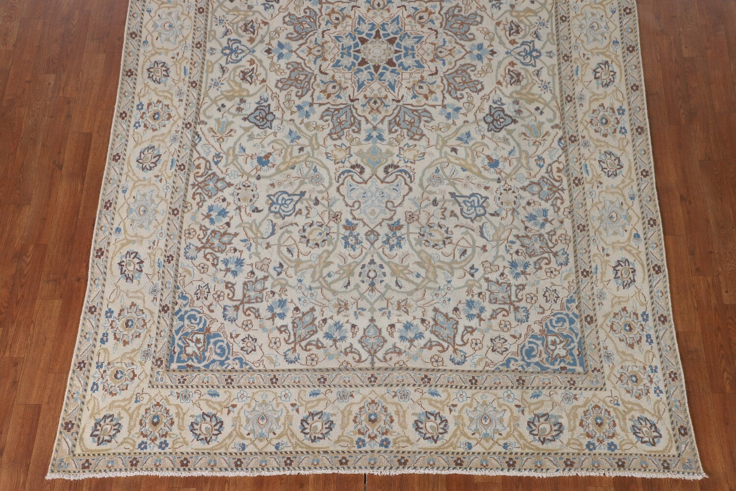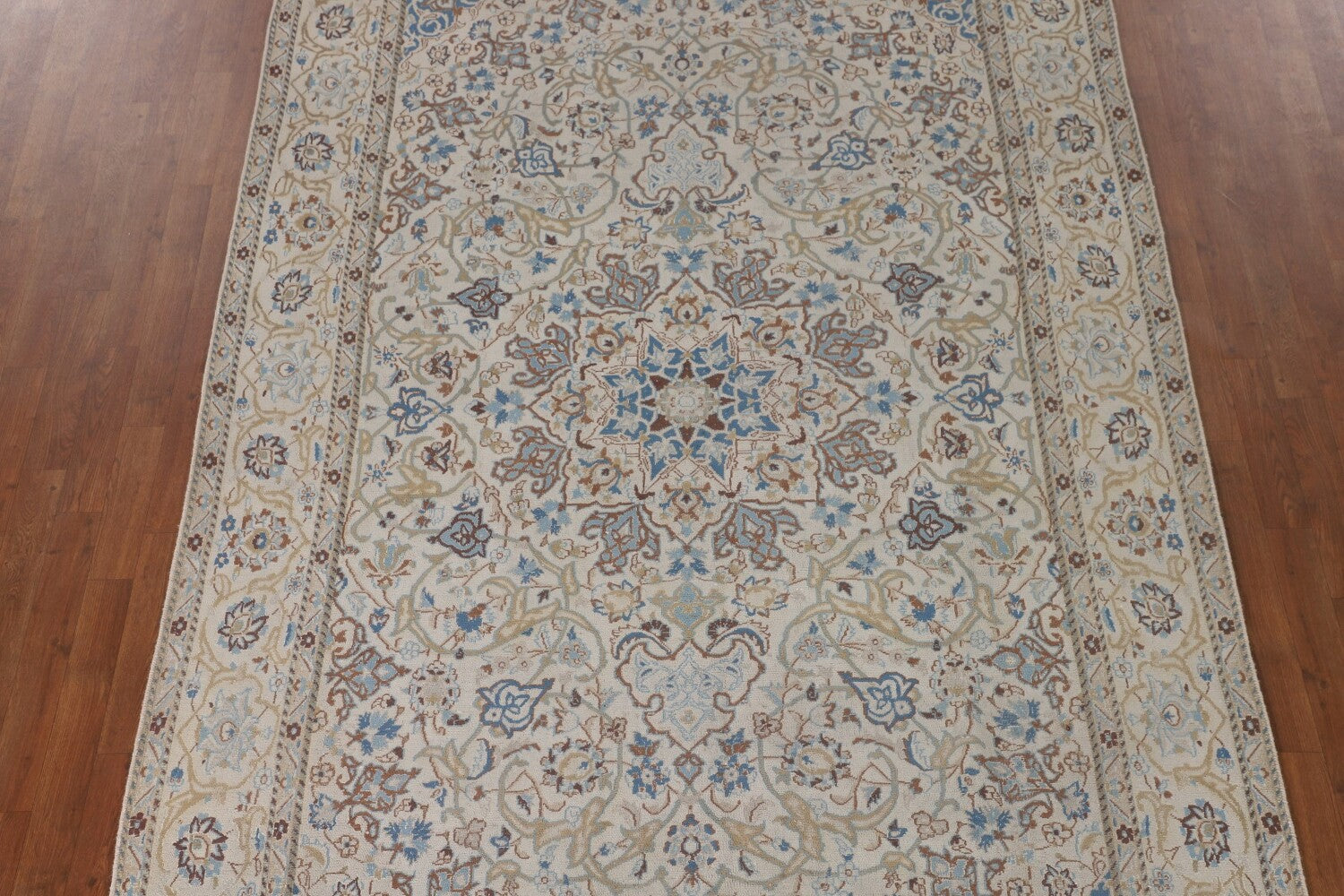 A Beautiful Genuine Persia ( Persia ) Nain rug is Hand Knotted by skillful weavers in Persia ( Persia ) with 100% Wool Material. This rug is in Very Good (Evenly Low Pile) condition. dimensions are 10' 8'' X 6' 5'' in foot and 325 X 196 in centimeter. the primary color is Beige & Ivories.