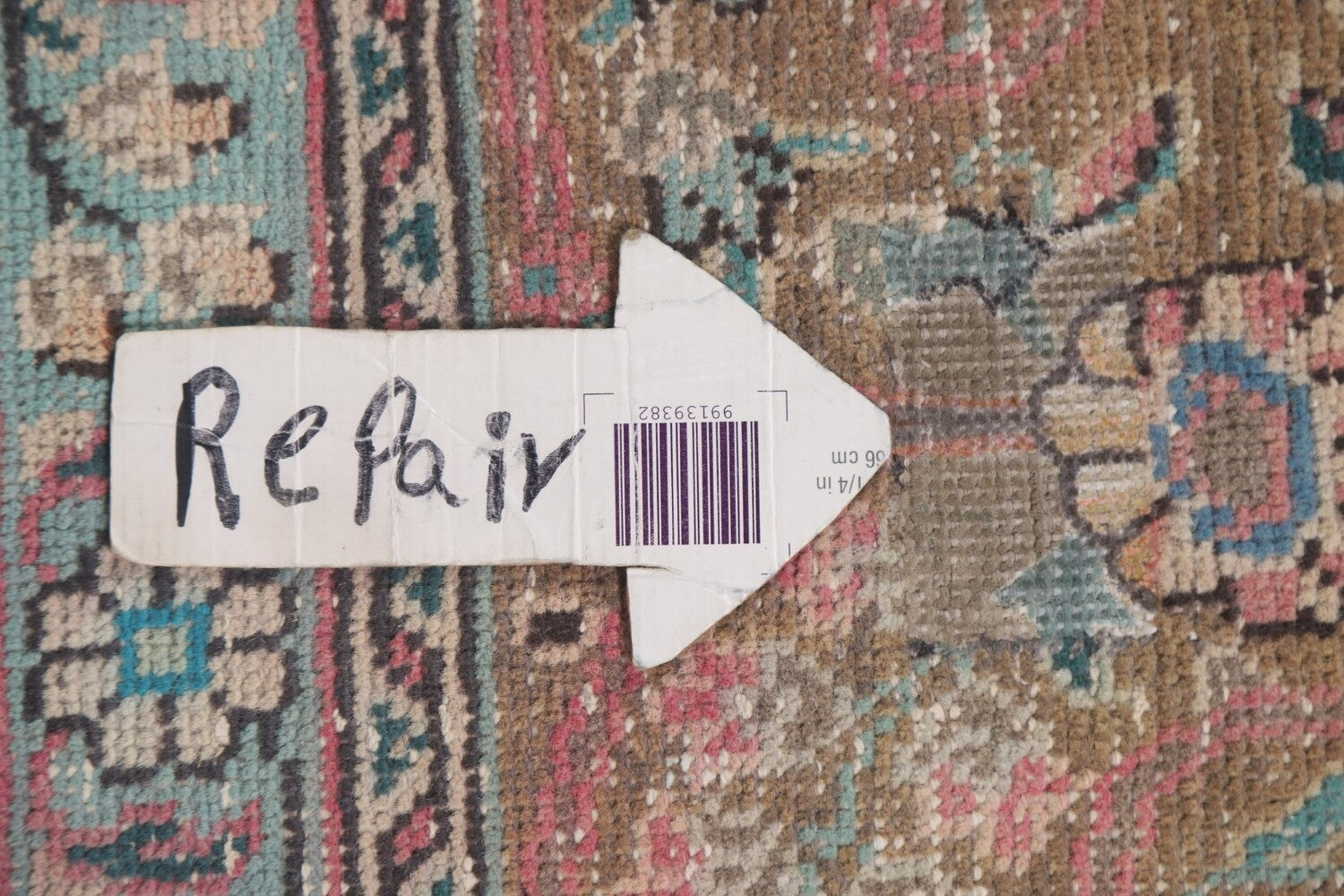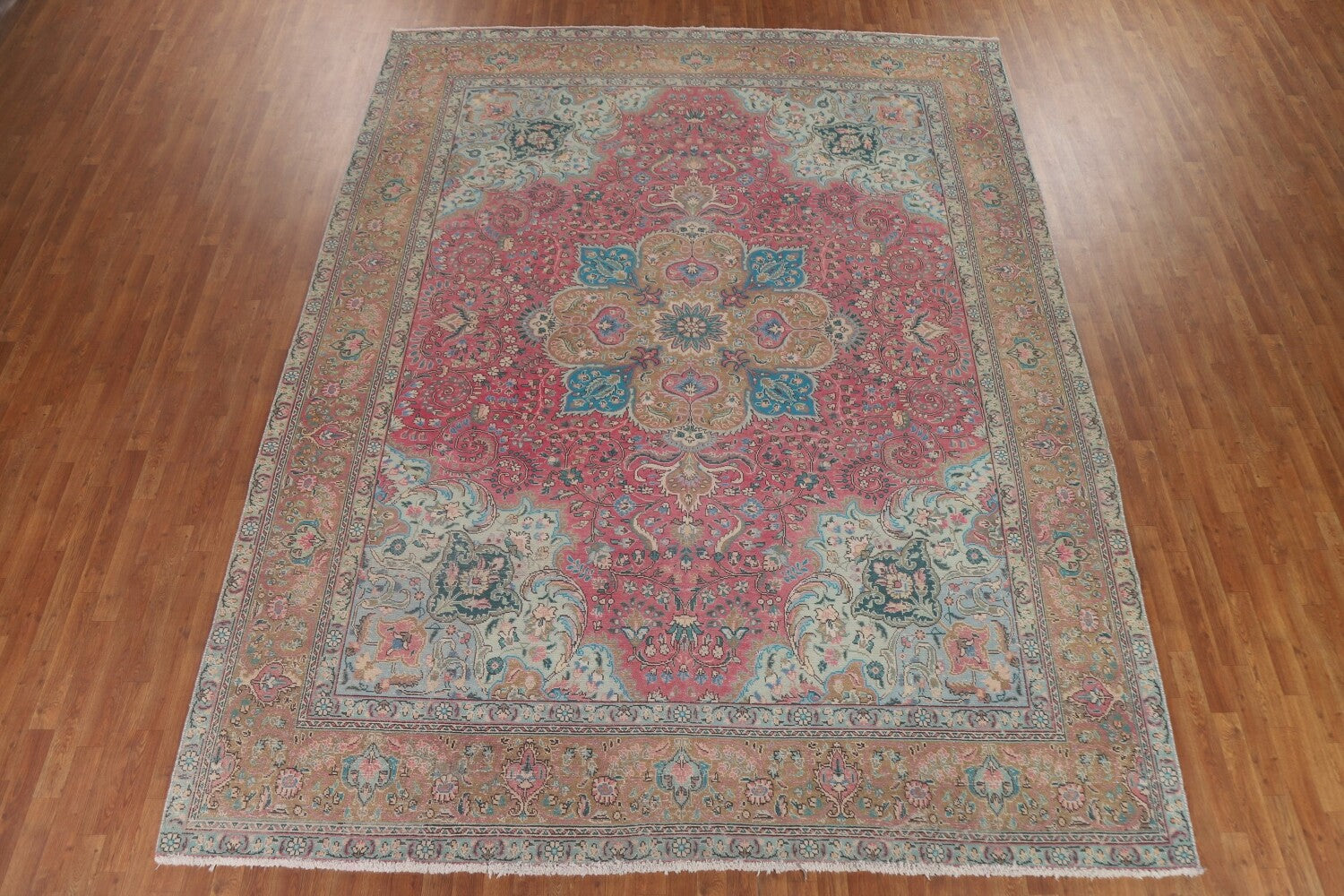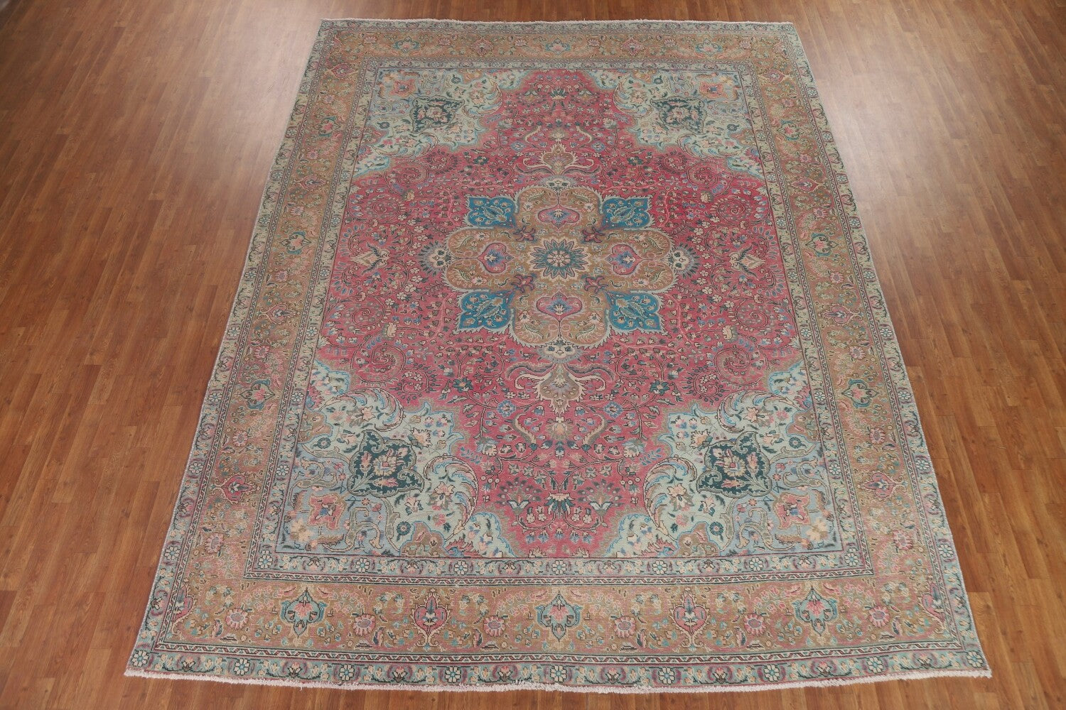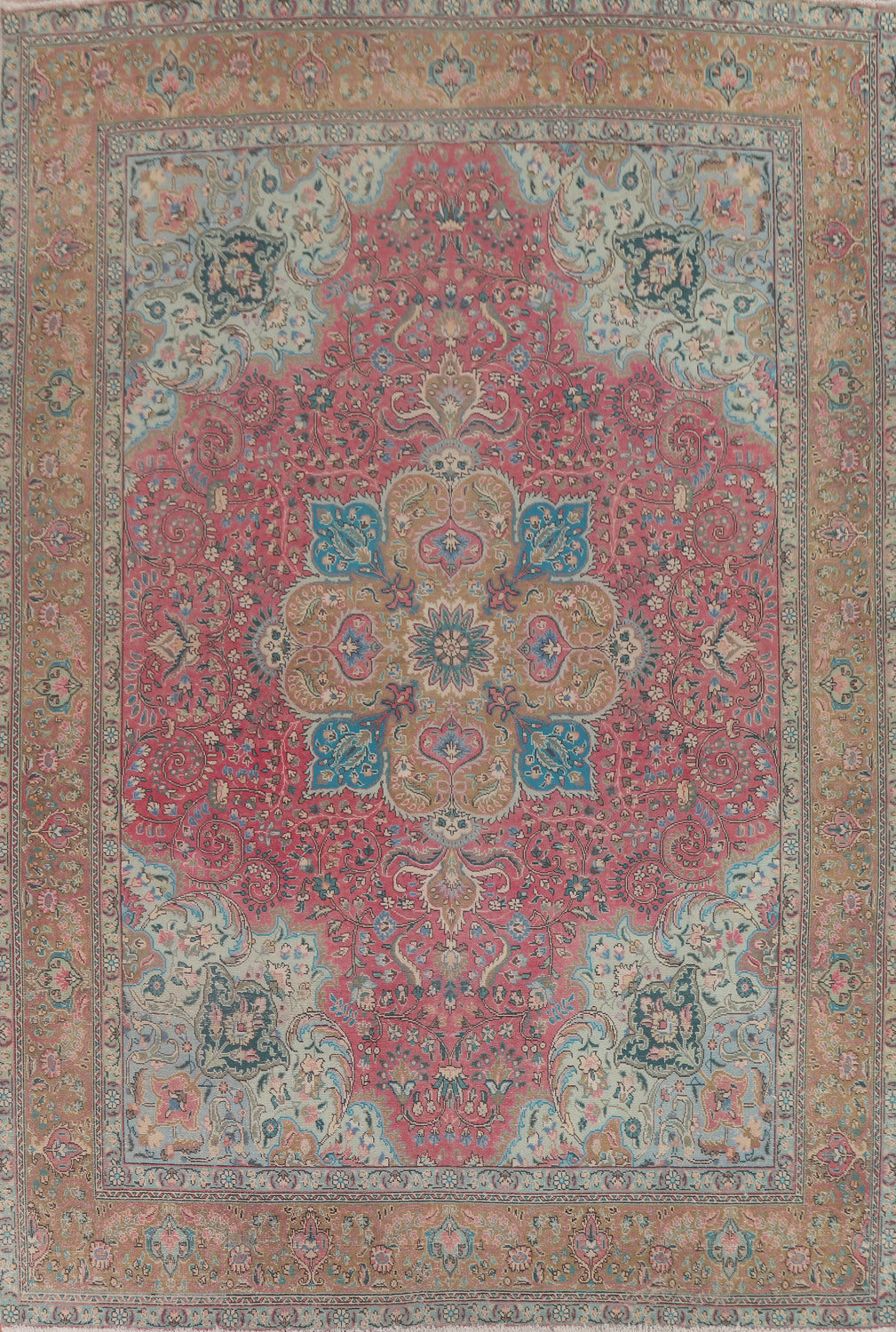 A Beautiful Genuine Persia ( Persia ) Tabriz rug is Hand Knotted by skillful weavers in Persia ( Persia ) with 100% Wool Material. This rug is in Very Good (Low Pile-Repair) condition. dimensions are 12' 7'' X 9' 10'' in foot and 384 X 300 in centimeter. the primary color is Pink.