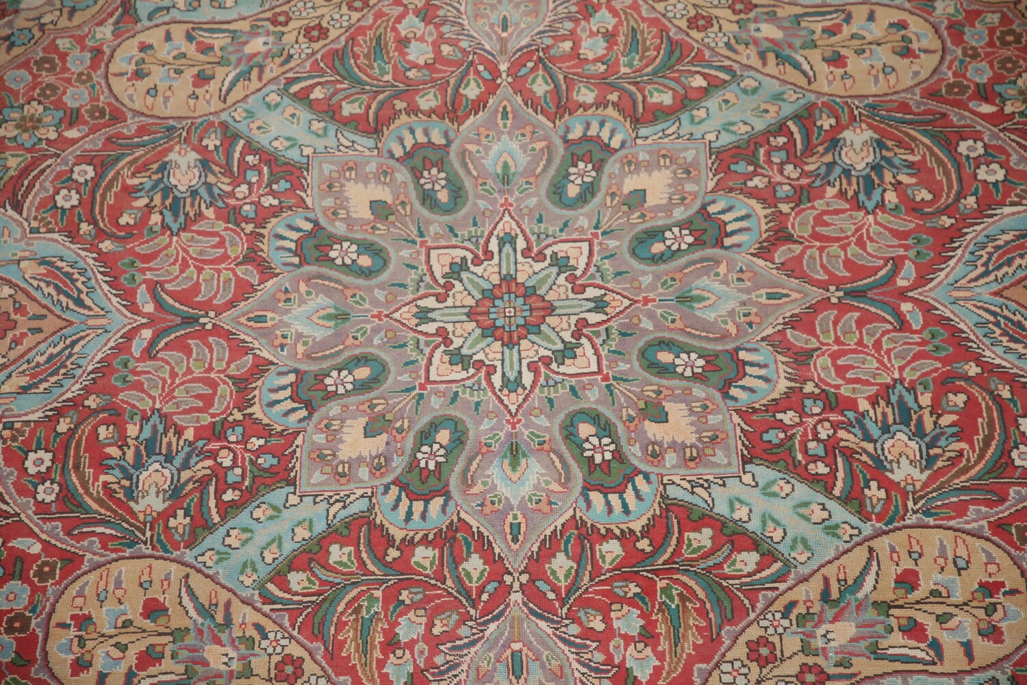 A Beautiful Genuine Persia ( Persia ) Tabriz rug is Hand Knotted by skillful weavers in Persia ( Persia ) with 100% Wool Material. This rug is in Very Good (Evenly Low Pile-Repair) condition. dimensions are 12' 8'' X 9' 8'' in foot and 386 X 295 in centimeter. the primary color is Red.