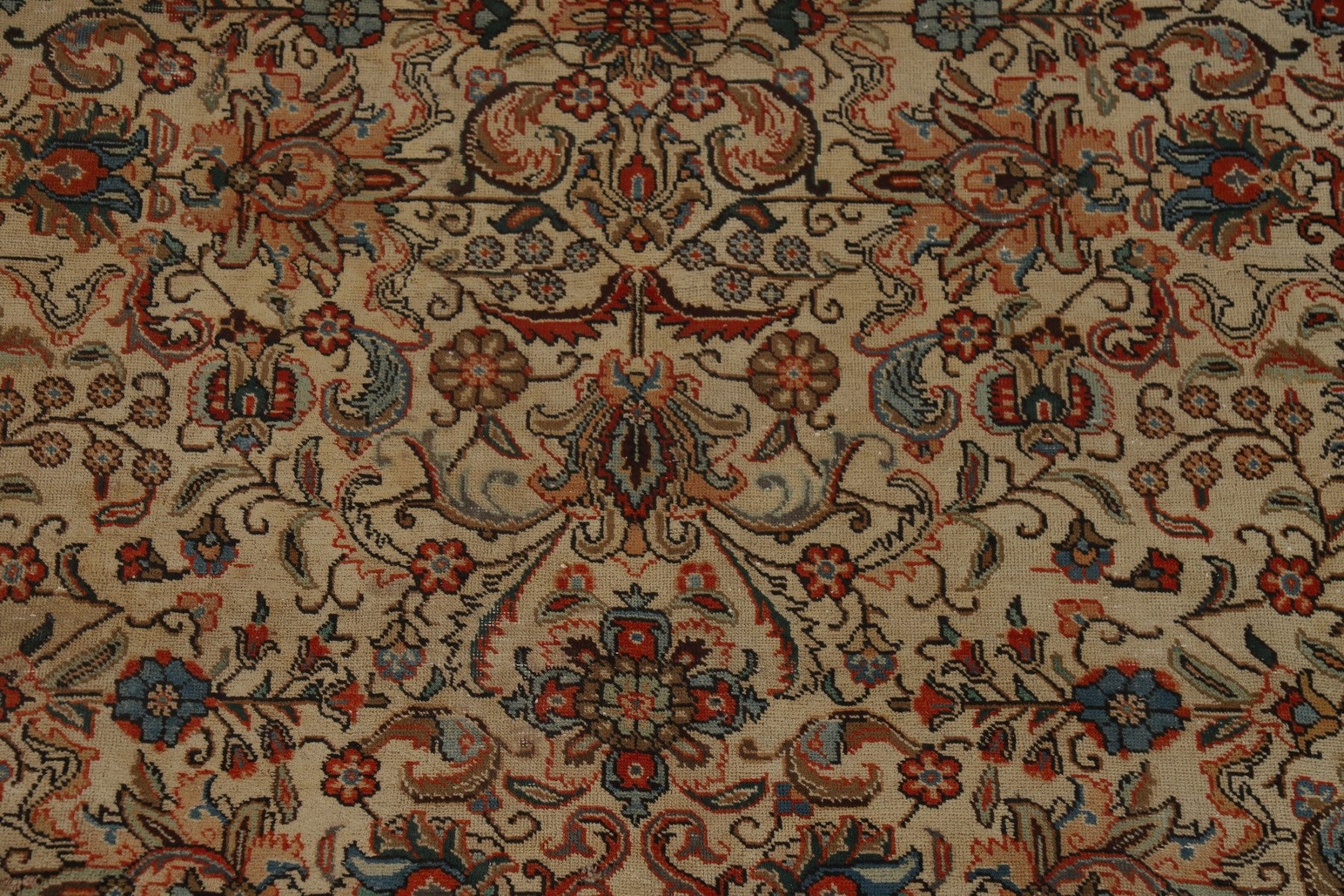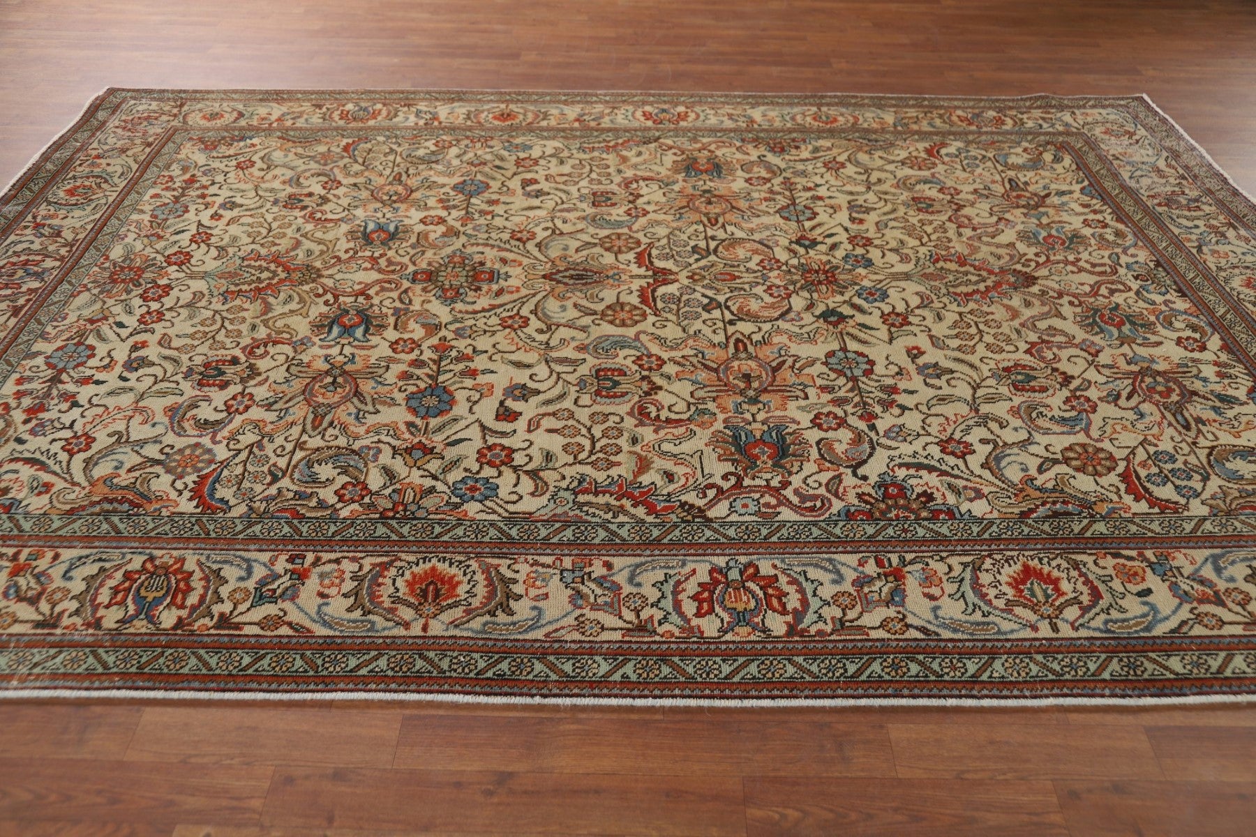 A Beautiful Genuine Persia ( Persia ) Tabriz rug is Hand Knotted by skillful weavers in Persia ( Persia ) with 100% Wool Material. This rug is in Very Good (Evenly Low Pile) condition. dimensions are 10' 3'' X 7' 1'' in foot and 312 X 216 in centimeter. the primary color is Beige & Ivories.