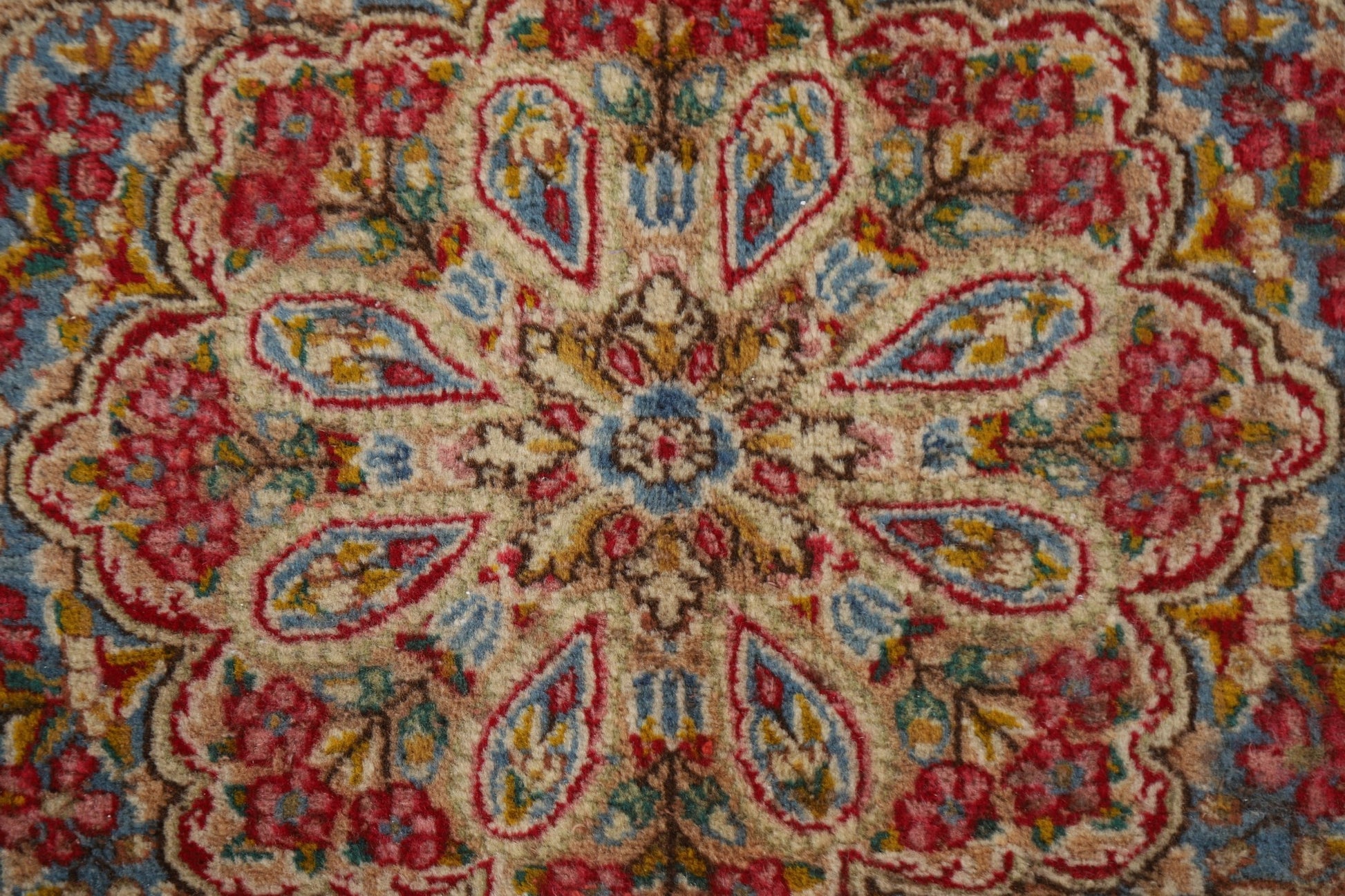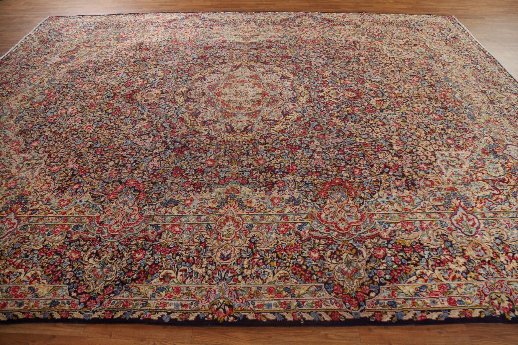 A Beautiful Genuine Persia ( Persia ) Kerman rug is Hand Knotted by skillful weavers in Persia ( Persia ) with 100% Wool Material. This rug is in Very Good ( Low Pile ) condition. dimensions are 13' 1'' X 9' 9'' in foot and 399 X 297 in centimeter. the primary color is Navy Blue & Blues.