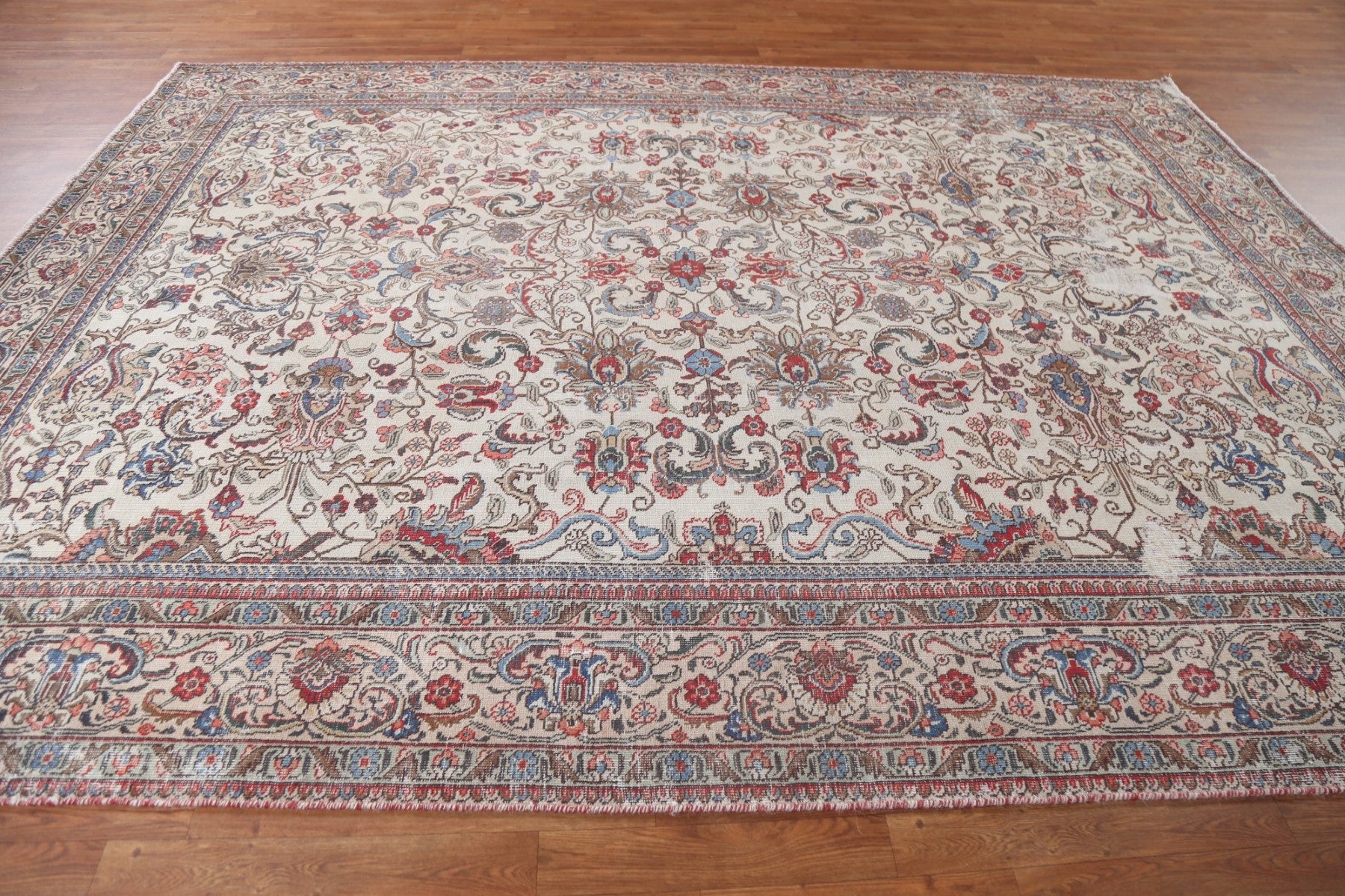A Beautiful Genuine Persia ( Persia ) Tabriz rug is Hand Knotted by skillful weavers in Persia ( Persia ) with 100% Wool Material. This rug is in Very Good (Evenly Low Pile) condition. dimensions are 10' 11'' X 8' 2'' in foot and 333 X 249 in centimeter. the primary color is Beige & Ivories.