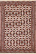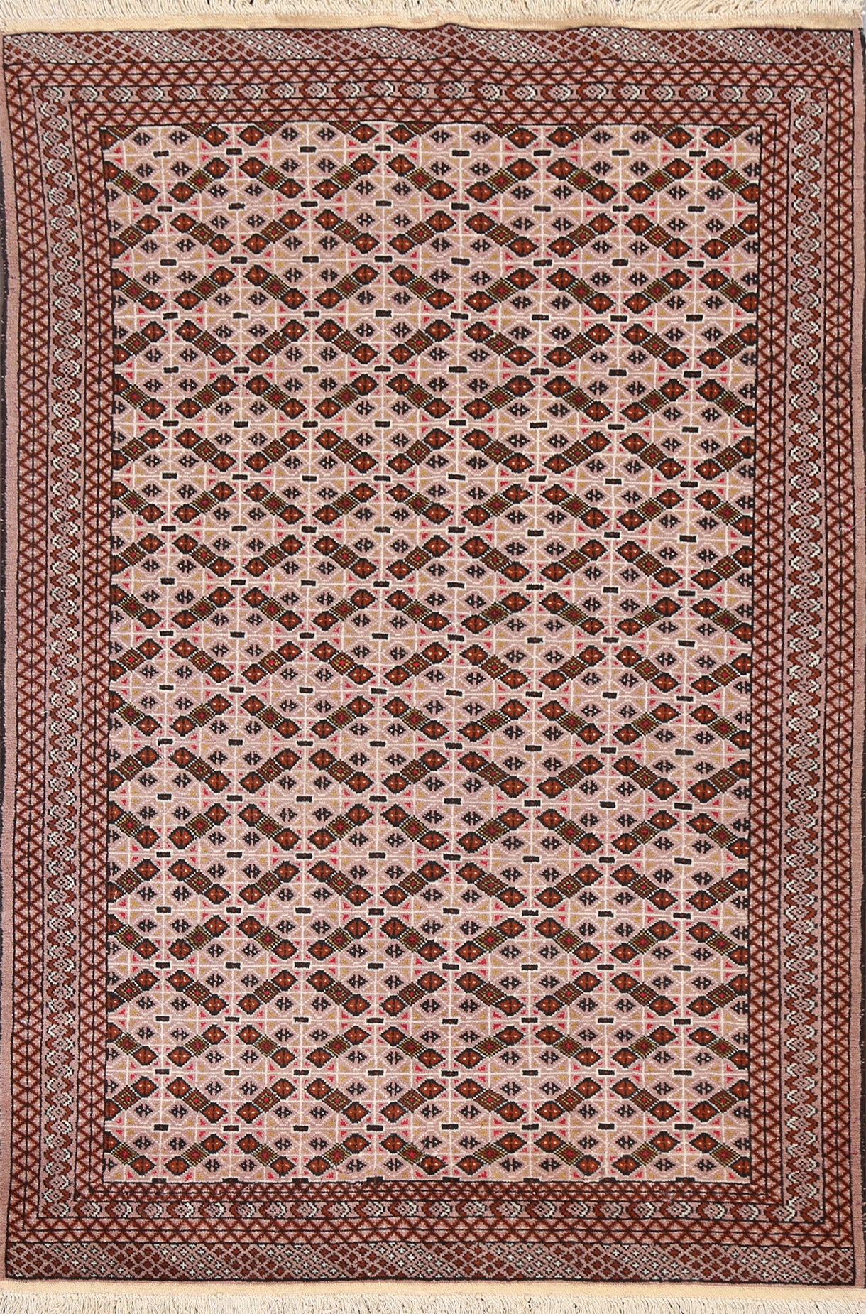 A Beautiful Genuine Pakistan Bokhara rug is Hand Knotted by skillful weavers in Pakistan with 100% Wool Material. This rug is in Very Good condition. dimensions are 6' 4'' X 4' 5'' in foot and 193 X 135 in centimeter. the primary color is Brown.