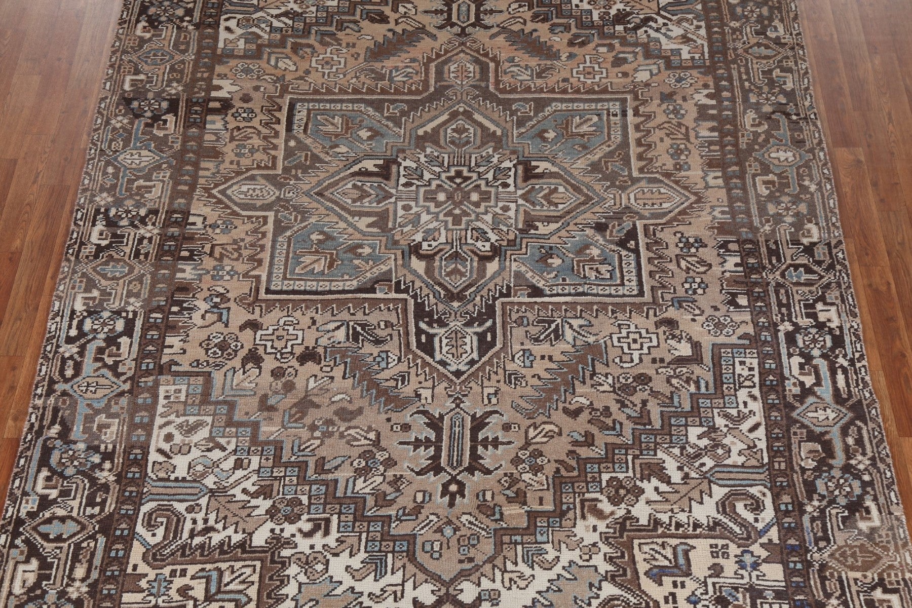 A Beautiful Genuine Persia ( Persia ) Heriz rug is Hand Knotted by skillful weavers in Persia ( Persia ) with 100% Wool Material. This rug is in Very Good (Abrash) condition. dimensions are 10' 1'' X 7' 2'' in foot and 307 X 218 in centimeter. the primary color is Beige & Ivories.