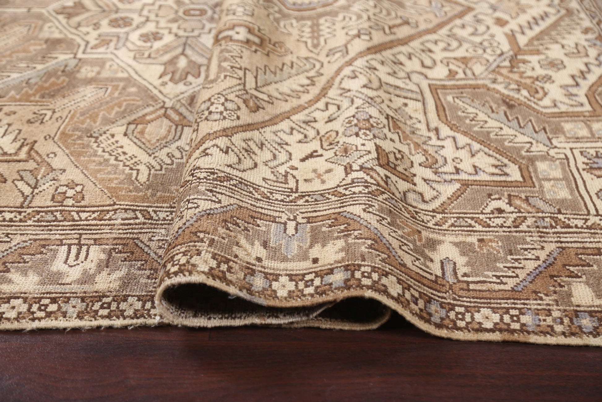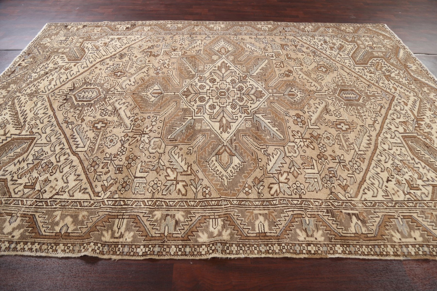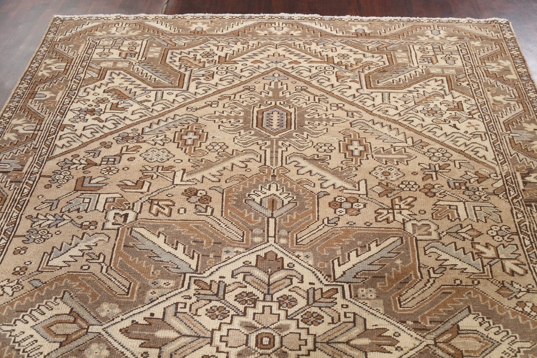A Beautiful Genuine Persia ( Persia ) Heriz rug is Hand Knotted by skillful weavers in Persia ( Persia ) with 100% Wool Material. This rug is in Very Good (Evenly Low Pile) condition. dimensions are 11' 2'' X 7' 9'' in foot and 340 X 236 in centimeter. the primary color is Beige & Ivories.