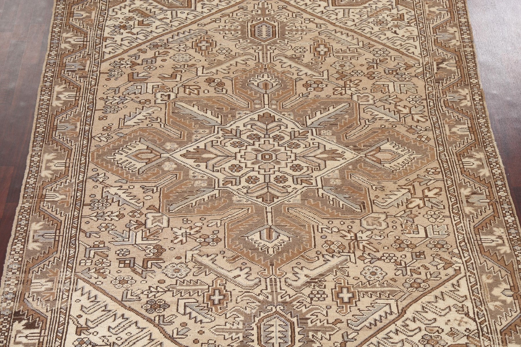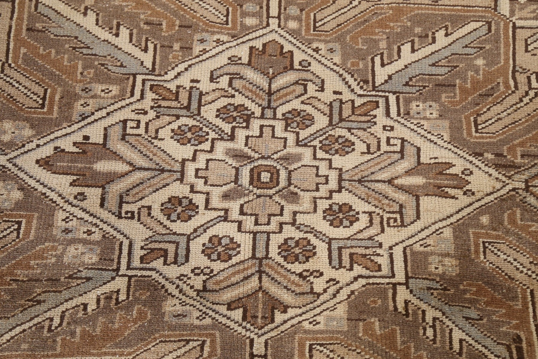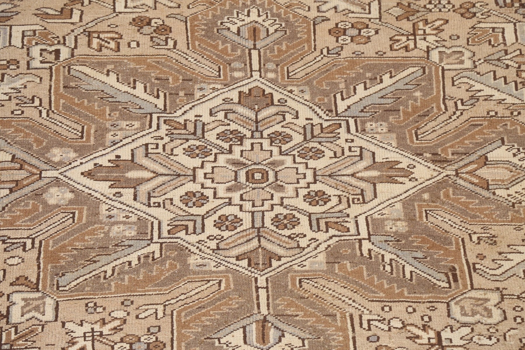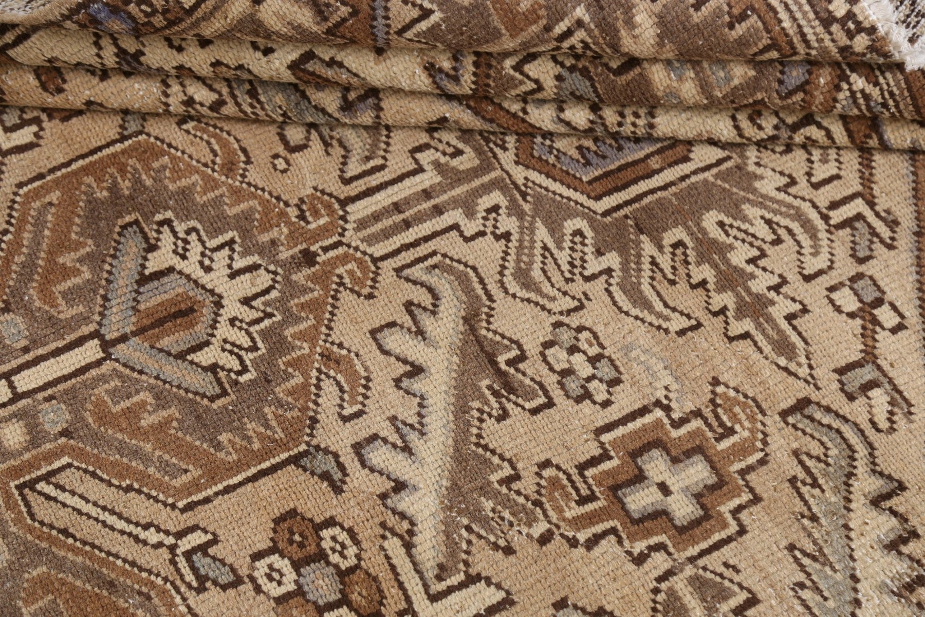 A Beautiful Genuine Persia ( Persia ) Heriz rug is Hand Knotted by skillful weavers in Persia ( Persia ) with 100% Wool Material. This rug is in Very Good (Evenly Low Pile) condition. dimensions are 11' 2'' X 7' 9'' in foot and 340 X 236 in centimeter. the primary color is Beige & Ivories.
