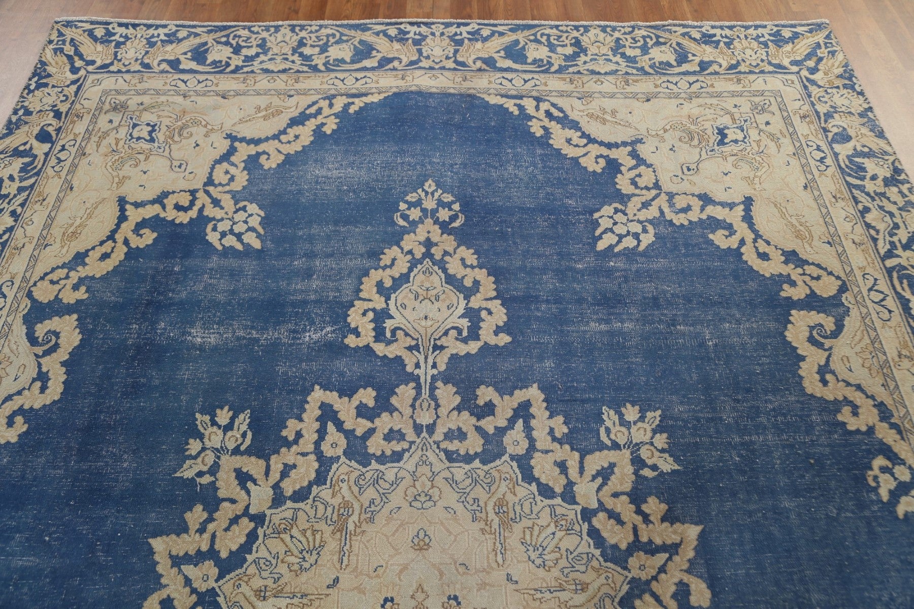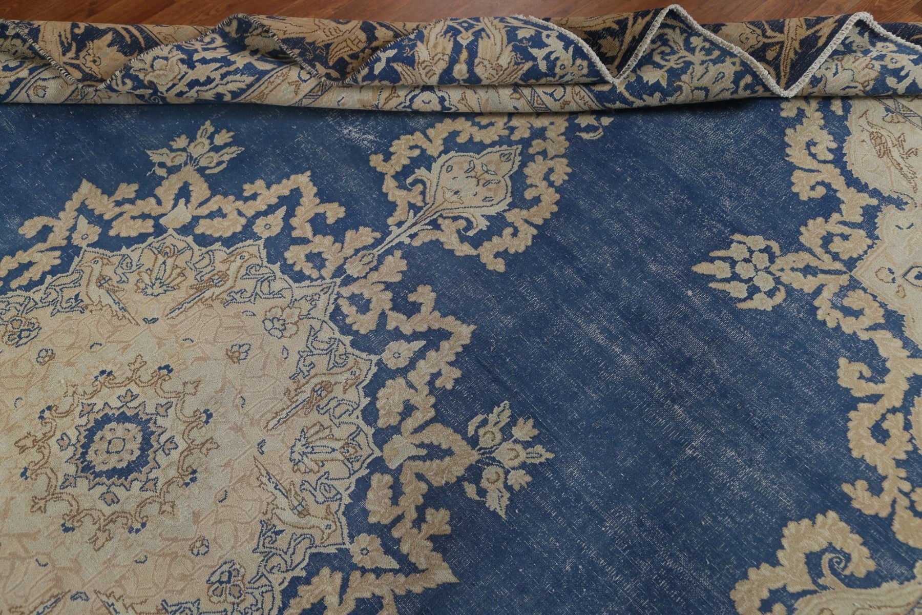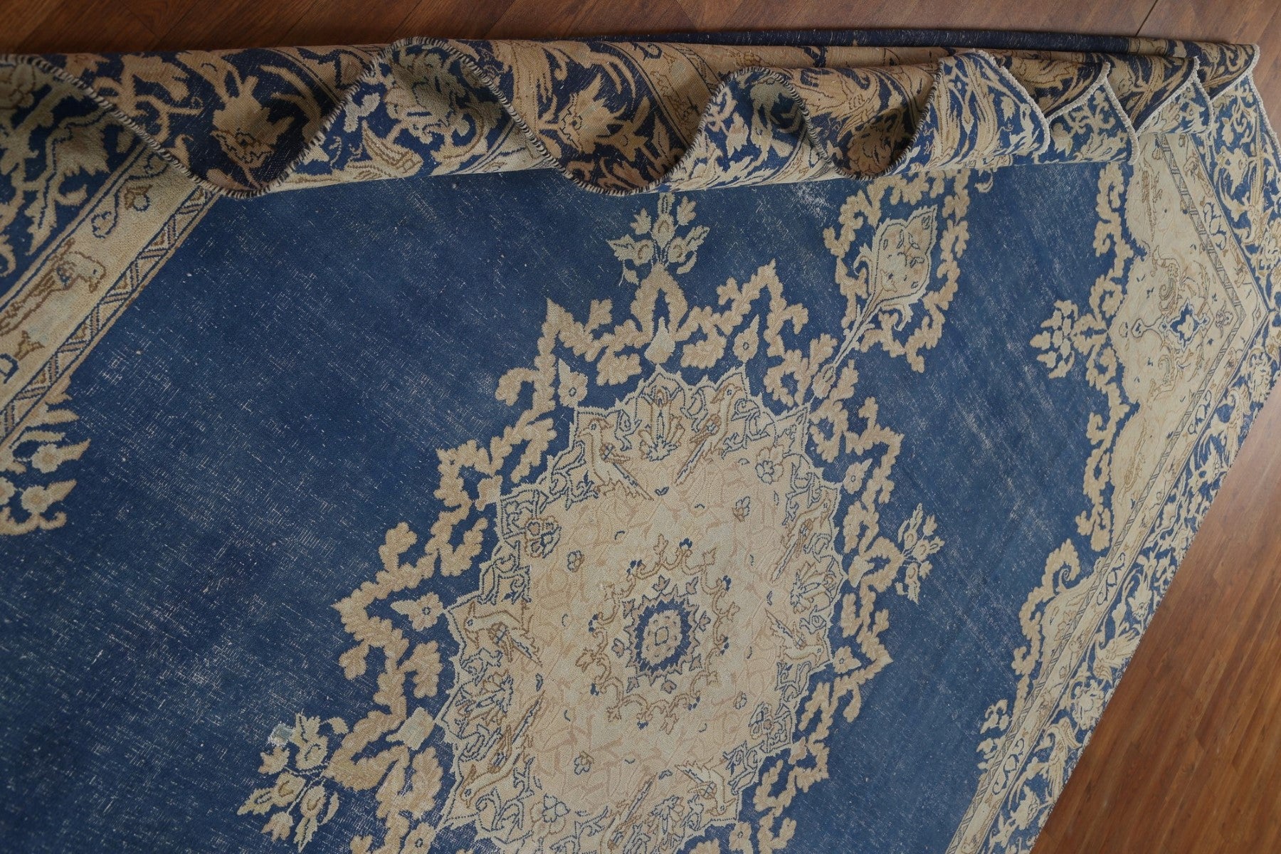 A Beautiful Genuine Persia ( Persia ) Kashan rug is Hand Knotted by skillful weavers in Persia ( Persia ) with 100% Wool Material. This rug is in Very Good (Evenly Low Pile) condition. dimensions are 10' 11'' X 7' 10'' in foot and 333 X 239 in centimeter. the primary color is Navy Blue & Blues.