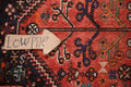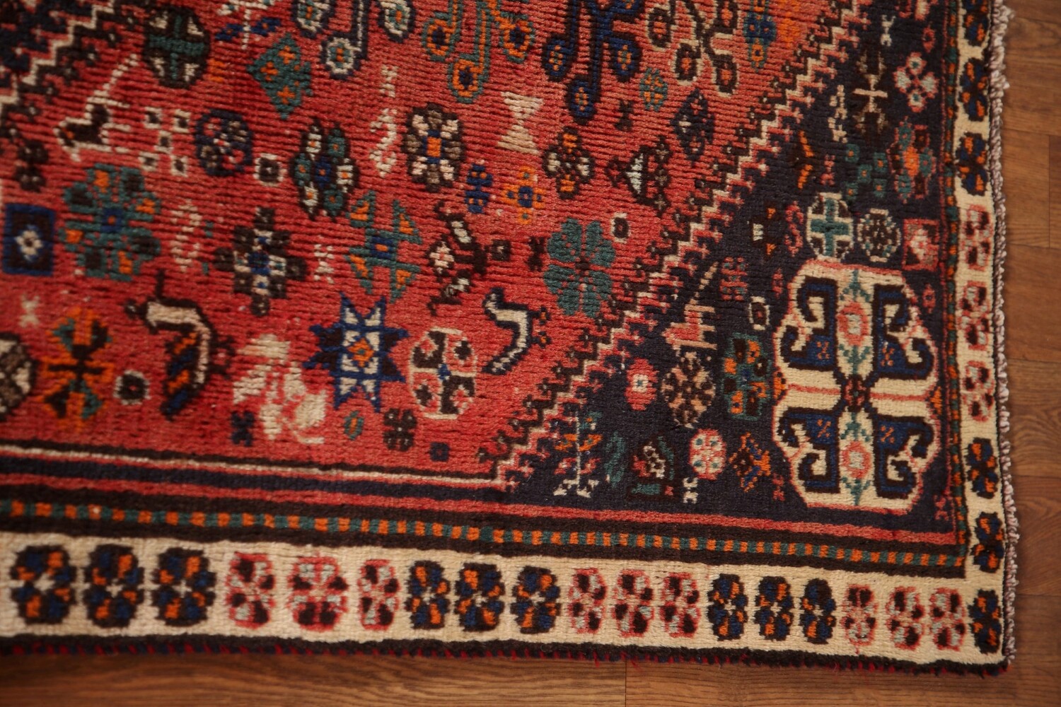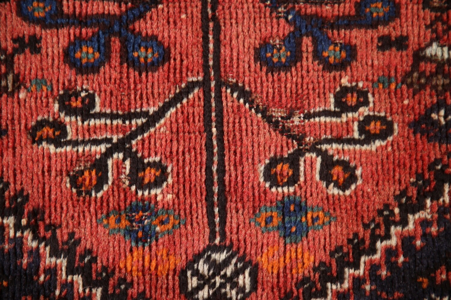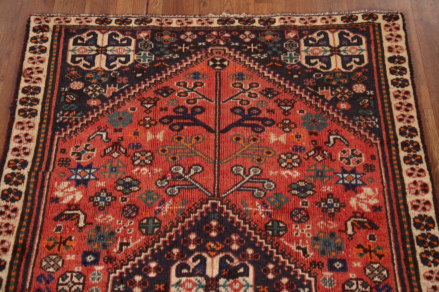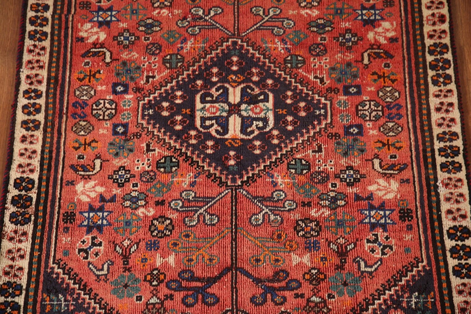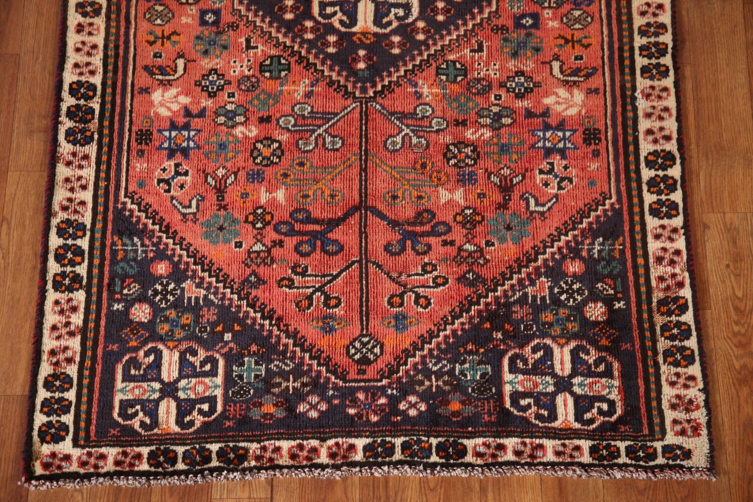 A Beautiful Genuine Persia ( Persia ) Shiraz rug is Hand Knotted by skillful weavers in Persia ( Persia ) with 100% Wool Material. This rug is in Very Good (Low Pile) condition. dimensions are 4' 11'' X 3' 2'' in foot and 150 X 97 in centimeter. the primary color is Coral.