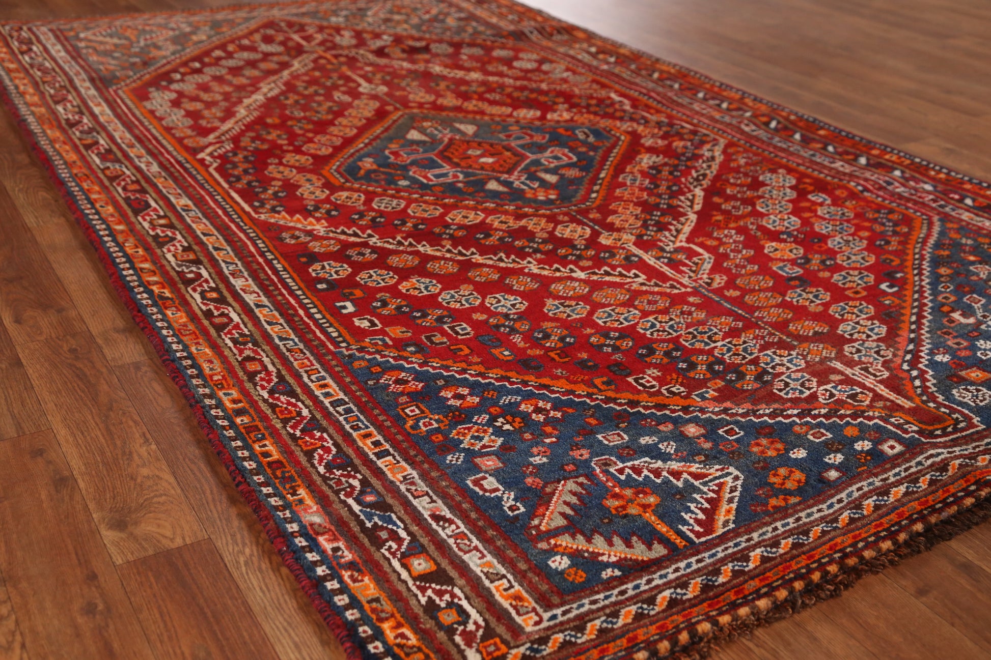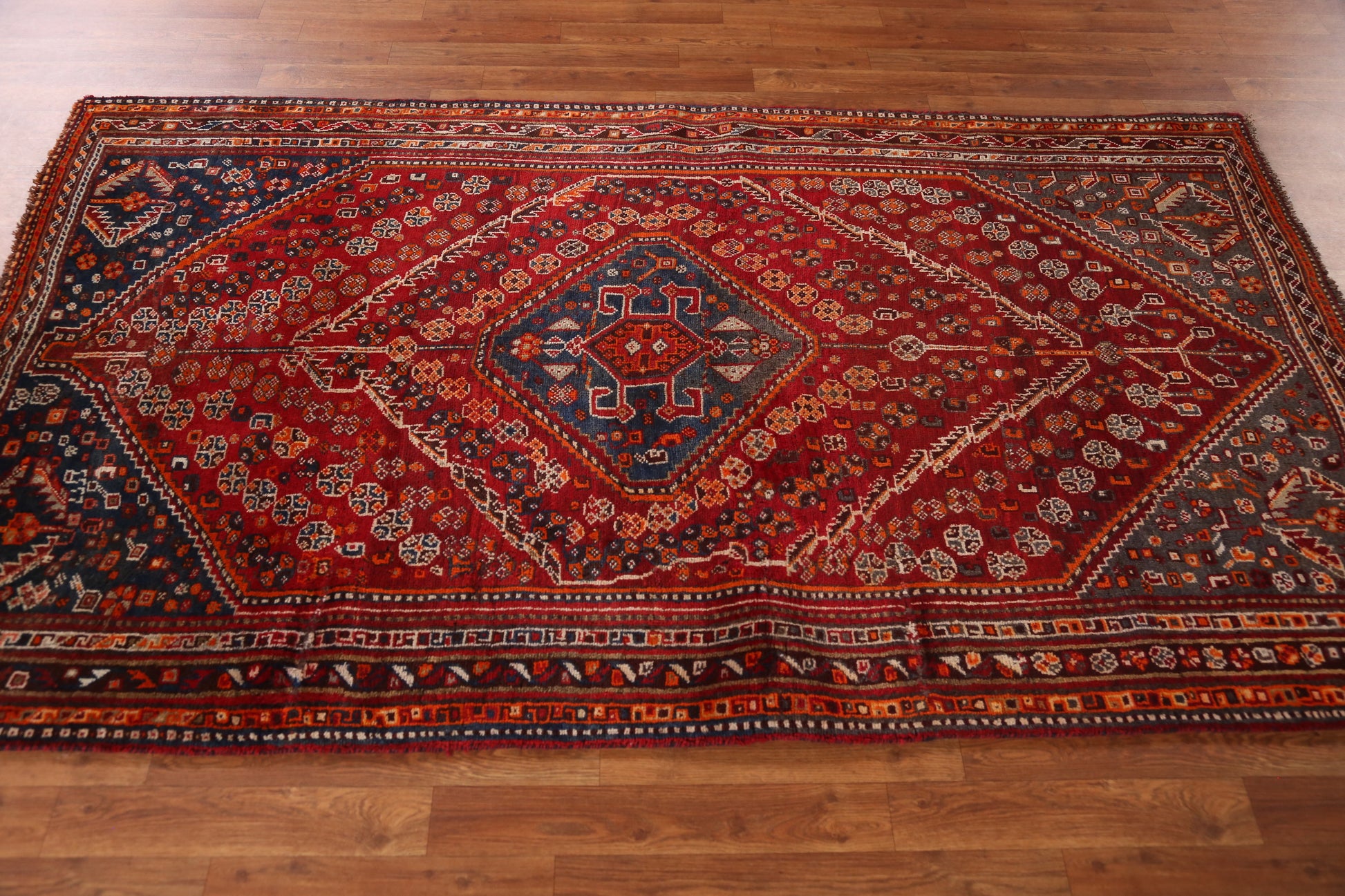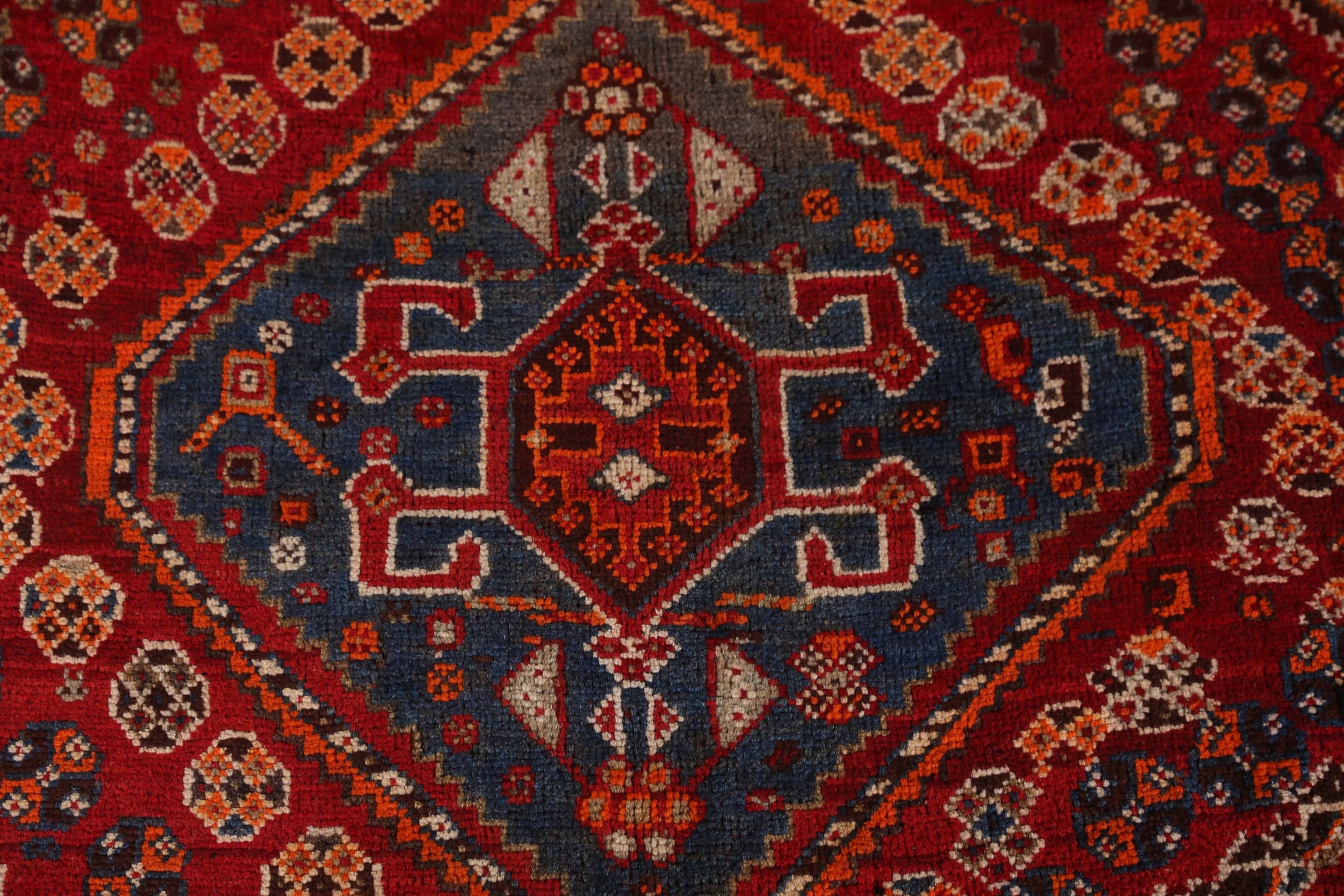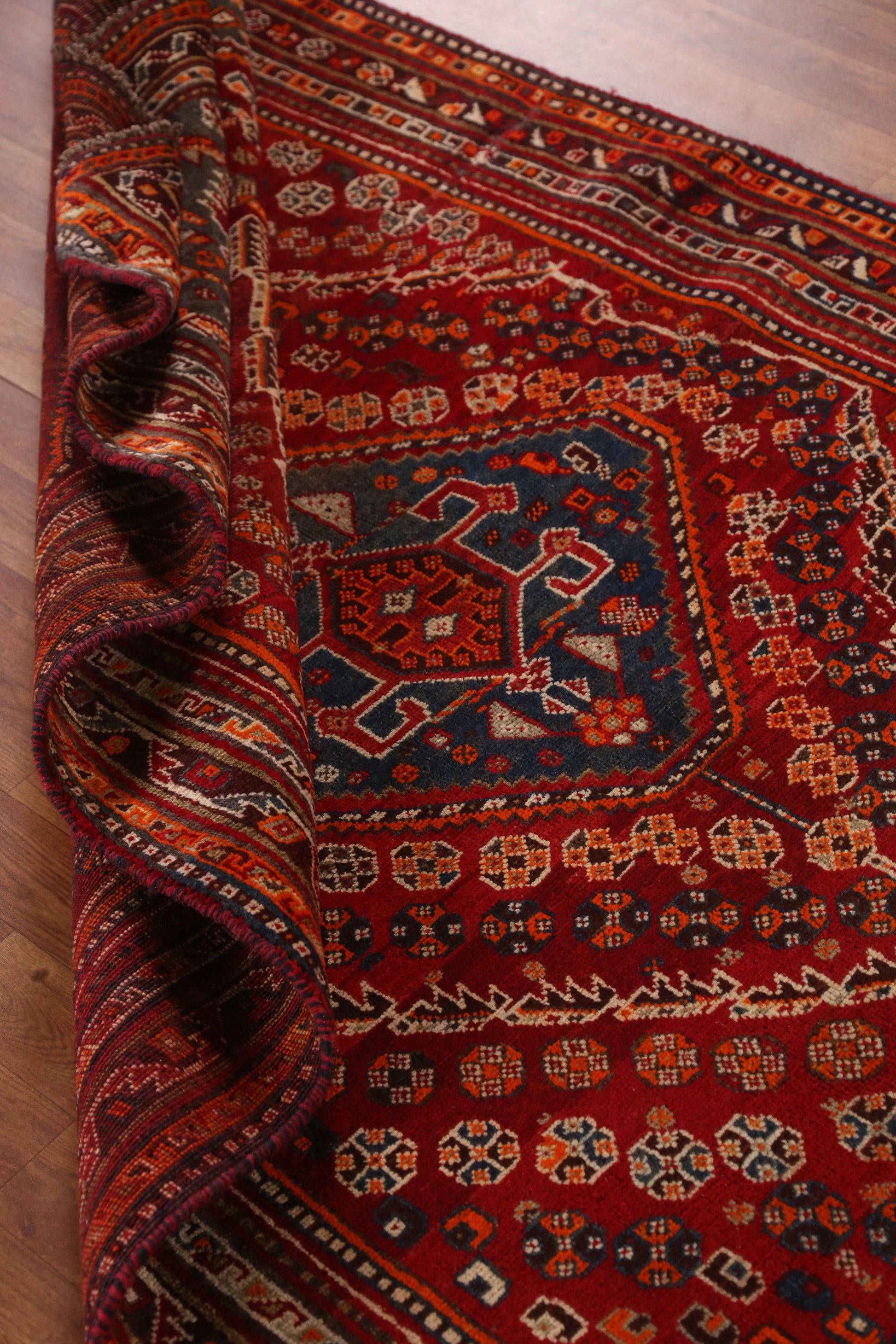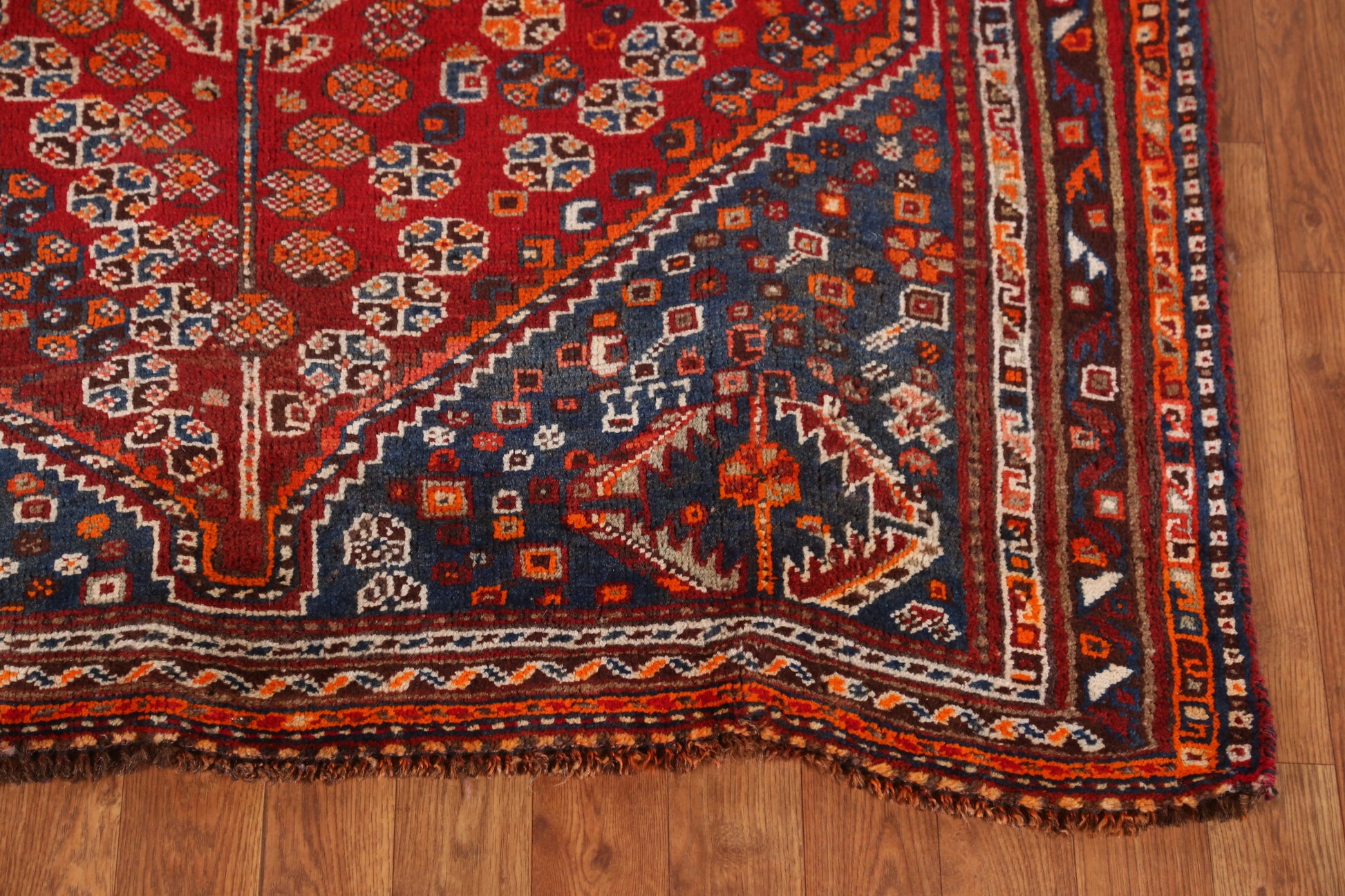 A Beautiful Genuine Persia ( Persia ) Shiraz rug is Hand Knotted by skillful weavers in Persia ( Persia ) with 100% Wool Material. This rug is in Very Good (Abrash) condition. dimensions are 7' 5'' X 4' 4'' in foot and 226 X 132 in centimeter. the primary color is Red.